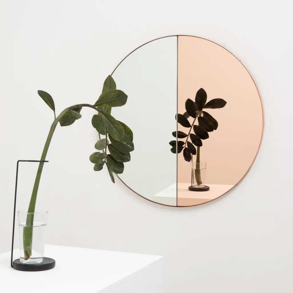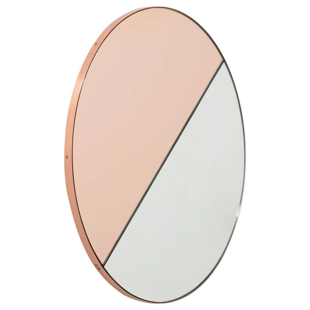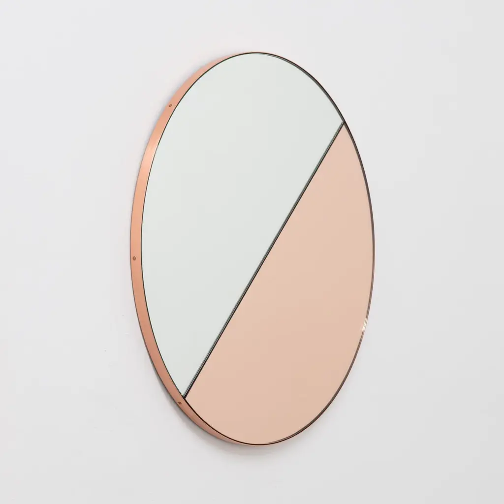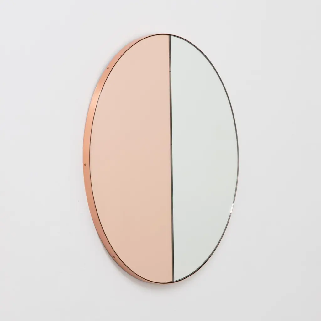 Contemporary mixed tinted (silver & rose gold / peach) Orbis Dualis mirror with a chic copper frame. Fitted with a quality hanging system that allows a flexible installation in 6 different positions (see pictures for reference). Designed and made in London, UK.Our mirrors are designed with an integrated French cleat (split batten) system that ensures the mirror is securely mounted flush with the wall. An alternative hanging hook or a Z-bar (depending on the size of the mirror) is available on demand for mirrors that need to be installed allowing some separation from the wall.This mirror is fully customisable.Shipped safely and insured worldwide. All our mirrors are made on demand. Fabrication lead time for this particular mirror is approximately 4 to 5 weeks. Our mirrors are always shipped by courier express. Shipping via courier express typically requires 1 to 2 days to the UK, or 2 to 7 days outside the UK depending on the destination.Available in the following diameters and variations:Small: 40cm / 15.8"Regular: 50cm / 19.7"Medium: 60cm / 23.6"Large: 80cm / 31.5"Extra Large: 100cm / 39.4"Depth 1.8cm / 0.7"Prices for 120cm / 47.2”, 150cm / 59”, or any bespoke diameter, are available on demand.Available options:- frame finish: brass (brushed, polished or with a bronze patina), copper, stainless steel, blackened metal, powder coated aluminium in a range of standard or bespoke colours- mirror tints: standard silver, black, bronze, blue, rose gold / peach- back-illumination creating a halo effect- front-illumination around the periphery of the mirror- demister pad- bevelPlease contact us for a quote for any bespoke specification or added options.ORDERS OF MULTIPLE MIRRORS OF THE SAME TYPE: Please contact us to receive a Packing and Shipping quote when ordering multiple mirrors of the same type. An order for multiple mirrors of the same type may not be accepted without extra packing and shipping fees. Thank you.