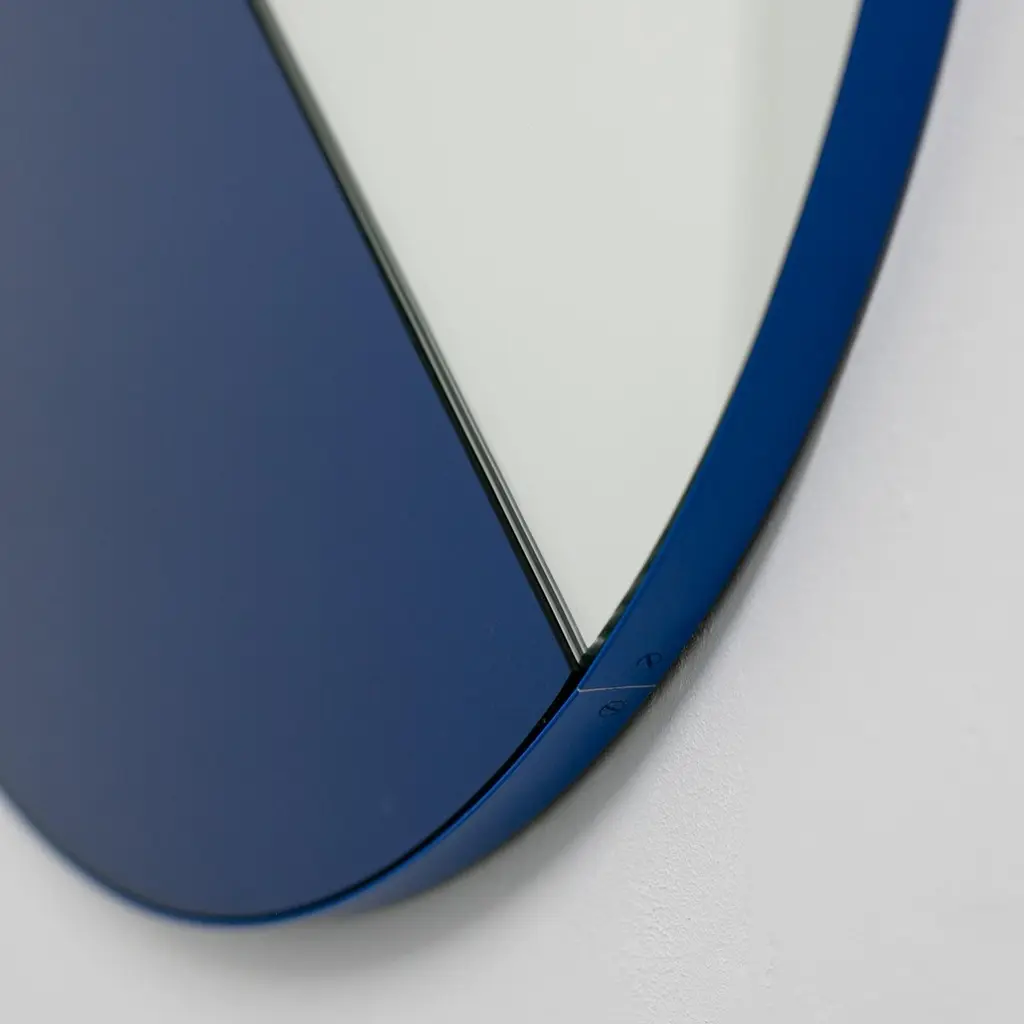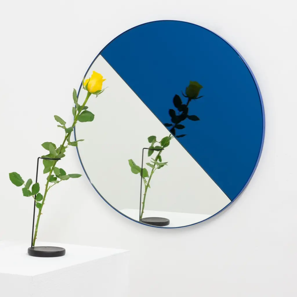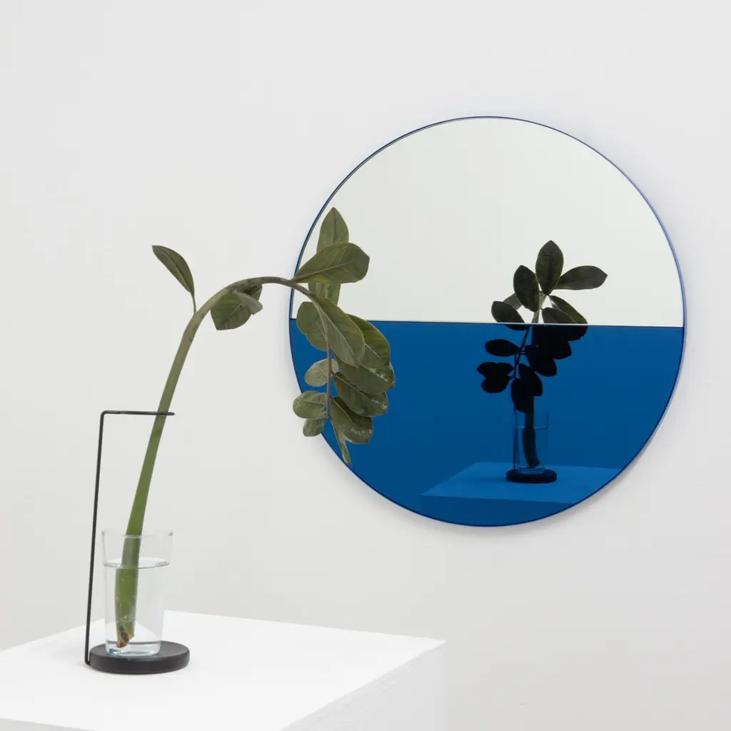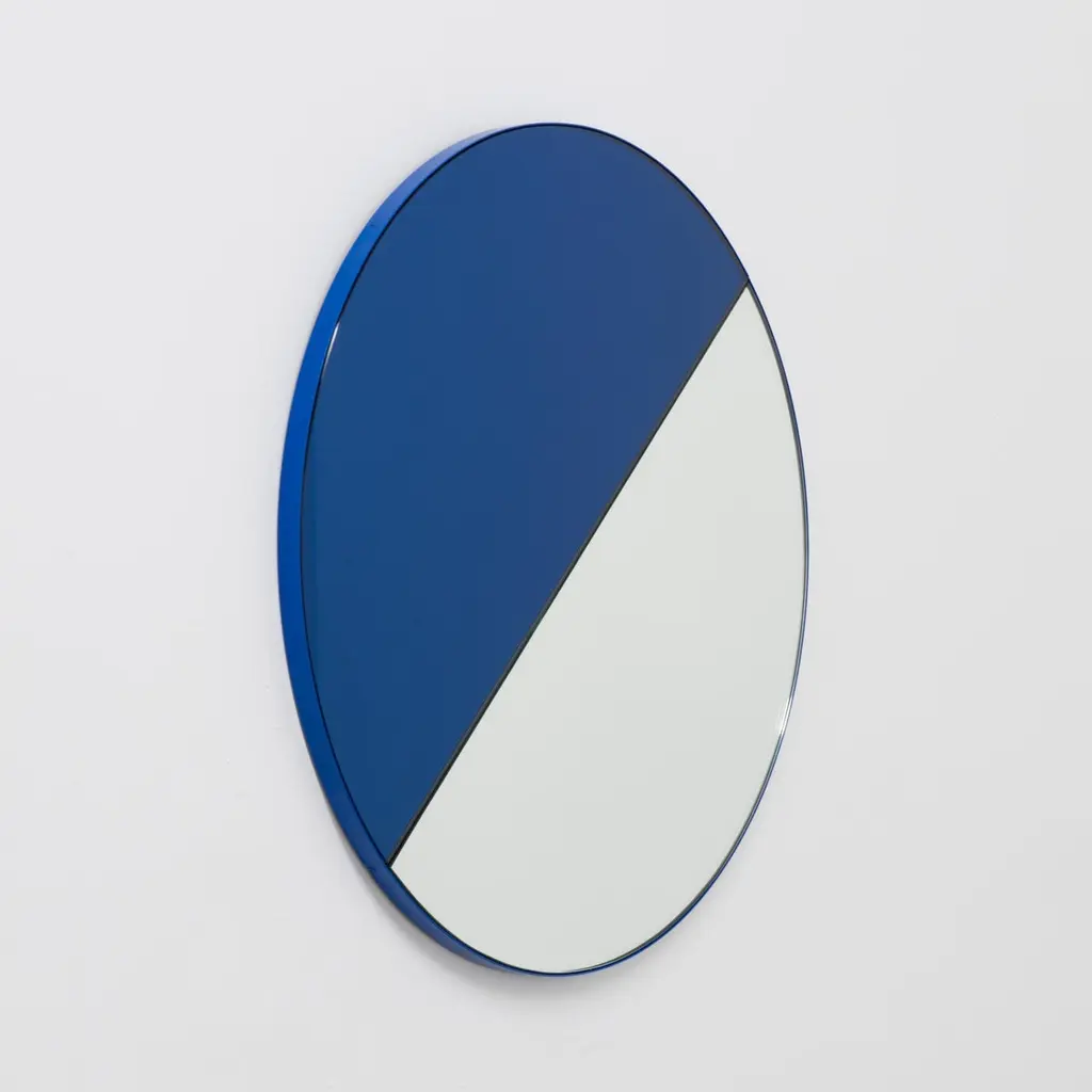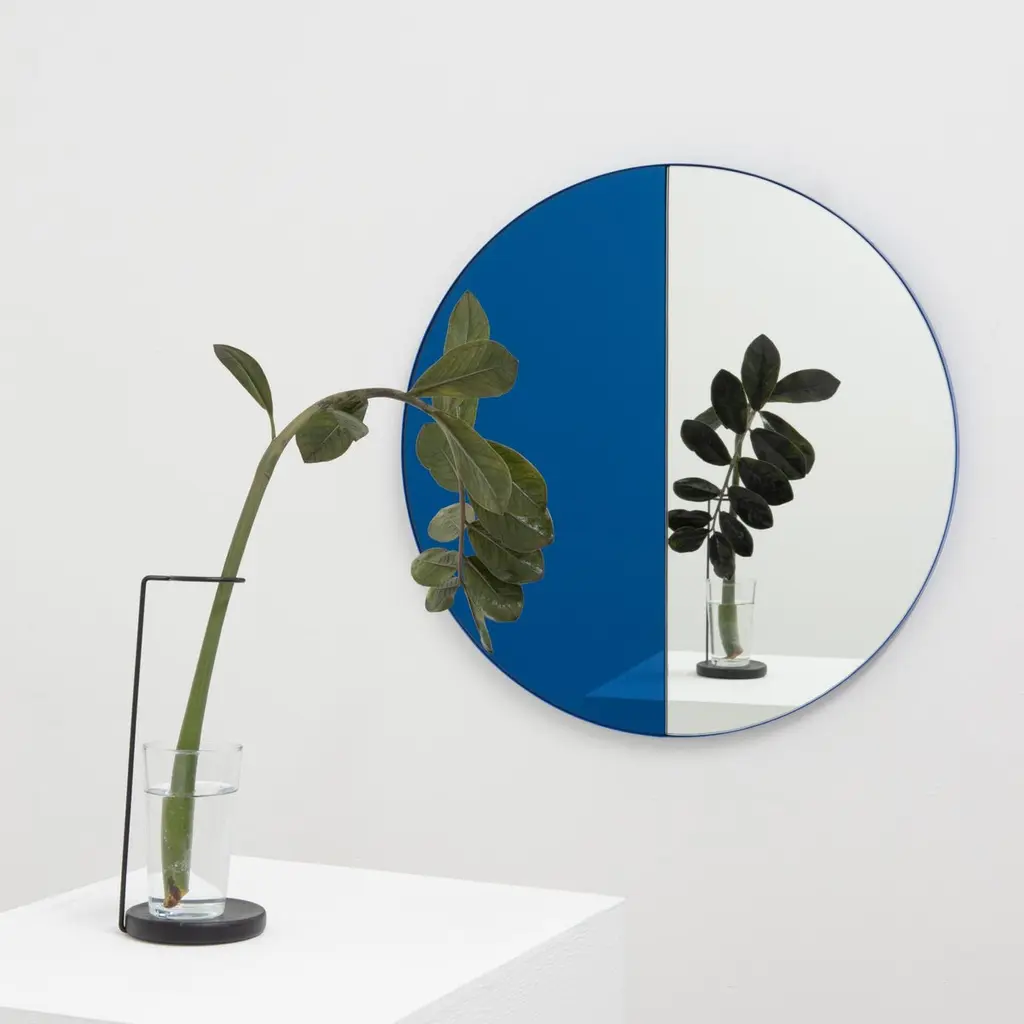 Contemporary mixed blue and silver mirror tints Dualis Orbis with a blue frame. Fitted with a quality and ingenious hanging system for a flexible installation in 6 different positions (see pictures for reference). Designed and made in London, UK.Our mirrors are designed with an integrated French cleat (split batten) system that ensures the mirror is securely mounted flush with the wall. An alternative hanging hook or a Z-bar (depending on the size of the mirror) is available on demand for mirrors that need to be installed allowing some separation from the wall.This mirror is fully customisable. Please contact us for a quote for any bespoke specification or added options.Shipped safely and insured worldwide.ORDERS OF MULTIPLE MIRRORS OF THE SAME TYPE: Please contact us to receive a Packing and Shipping quote when ordering multiple mirrors of the same type. An order for multiple mirrors of the same type may not be accepted without extra packing and shipping fees. Thank you.