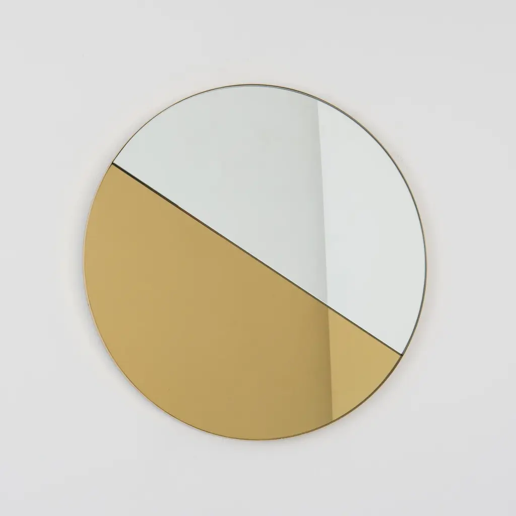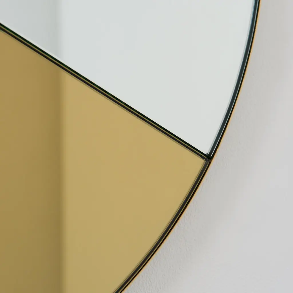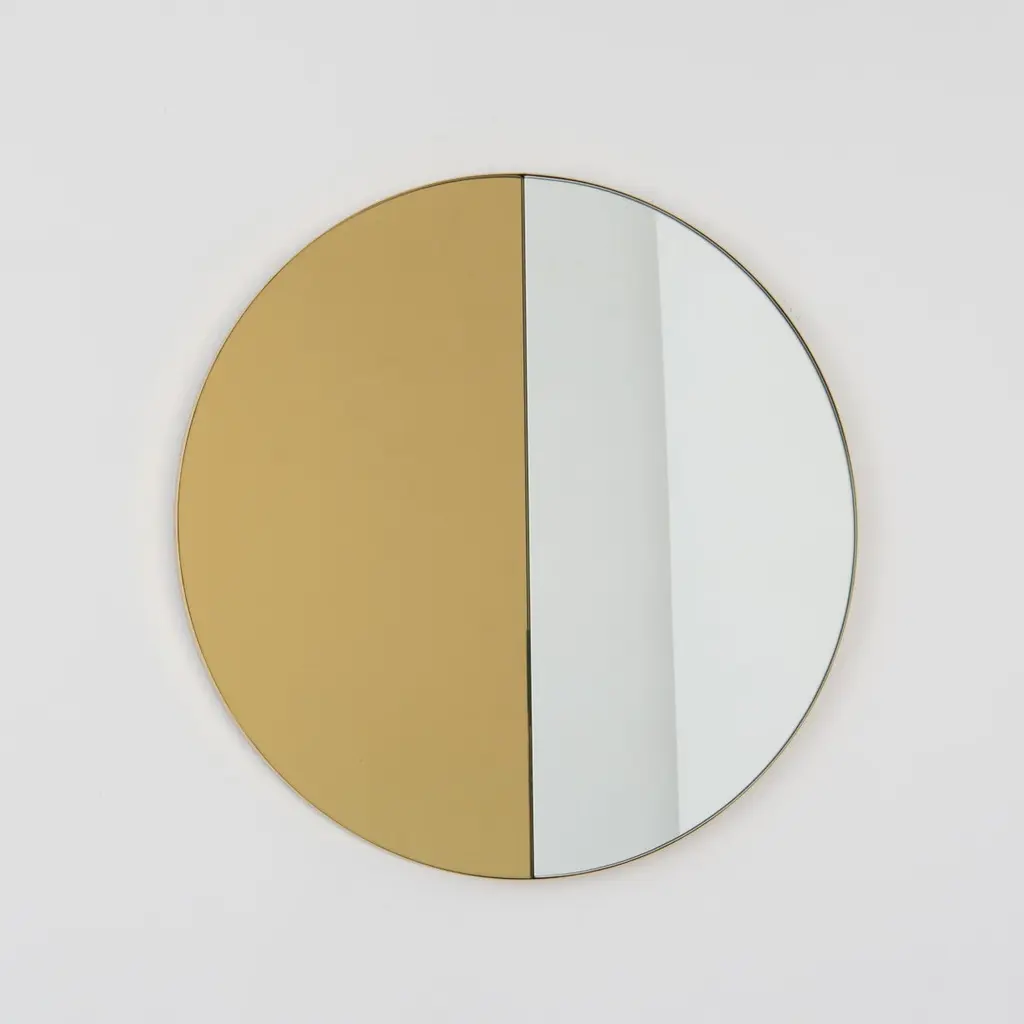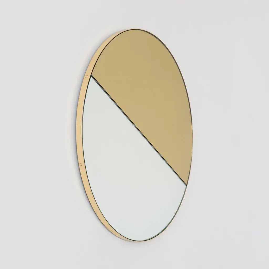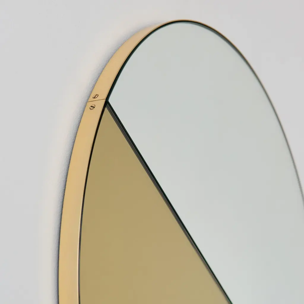 Contemporary mixed tinted gold and silver Orbis Dualis™ mirror with an elegant solid brushed brass frame. Fitted with a quality hanging system that allows a flexible installation in 6 different positions (see pictures for reference). Designed and made in London, UK.Our mirrors are designed with an integrated French cleat (split batten) system that ensures the mirror is securely mounted flush with the wall. An alternative hanging hook or a Z-bar (depending on the size of the mirror) is available on demand for mirrors that need to be installed allowing some separation from the wall.This mirror is fully customisable.Shipped safely and insured worldwide. All our mirrors are made on demand. Fabrication lead time for this particular mirror is approximately 4 to 5 weeks. Our mirrors are always shipped by courier express. Shipping via courier express typically requires 1 to 2 days to the UK, or 2 to 7 days outside the UK depending on the destination.Available in the following diameters and variations:Small: 40cm / 15.8"Regular: 50cm / 19.7"Medium: 60cm / 23.6"Large: 80cm / 31.5"Extra Large: 100cm / 39.4"Depth 6mm / 0.7"Prices for 120cm / 47.2”, 150cm / 59”, or any bespoke diameter, are available on demand.Available options:- frame finish: brass (brushed, polished or with a bronze patina), copper, stainless steel, blackened metal, powder coated aluminium in a range of standard or bespoke colours- mirror tints: standard silver, black, bronze, blue, rose gold / peach, or green- back-illumination creating a halo effect- front-illumination around the periphery of the mirror- demister pad- bevelPlease contact us for a quote for any bespoke specification or added options.This mirror is fully customisable. Shipped safely fully insured worldwide.ORDERS OF MULTIPLE MIRRORS OF THE SAME TYPE: Please contact us to receive a Packing and Shipping quote when ordering multiple mirrors of the same type. An order for multiple mirrors of the same type may not be accepted without extra packing and shipping fees. Thank you.