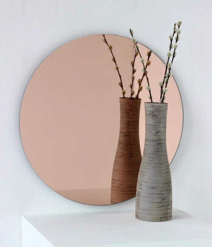 Charming and minimalist rose gold / peach tinted round frameless Orbis™ mirror with a floating effect. Quality design that ensures the mirror sits perfectly parallel to the wall. Designed and made in London, UK.Fitted with professional plates not visible once installed for an easy and safe installation. Lined at the back with a quality protective film. Supplied with all accessories, including screws and wall plugs.This mirror is fully customisable.Shipped safely and insured worldwide. All our mirrors are made on demand. Fabrication lead time for this particular mirror is approximately 3 to 4 weeks. Our mirrors are always shipped by courier express. Shipping via courier express typically requires 1 to 2 days to the UK, or 2 to 7 days outside the UK depending on the destination.Available in the following diameters and variations:Small: 40cm / 15.8"Regular: 50cm / 19.7"Medium: 60cm / 23.6"Large: 80cm / 31.5"Extra Large: 100cm / 39.4"Depth 6mm / 0.24"Prices for 120cm / 47.2”, 150cm / 59”, or any bespoke diameter, are available on demand.Available options:- mirror tints: standard silver, black, bronze, blue, rose gold/peach- back-illumination creating a halo effect- demister pad- bevelPlease contact us for a quote for any bespoke specification or added options.ORDERS OF MULTIPLE MIRRORS OF THE SAME TYPE: Please contact us to receive a Packing and Shipping quote when ordering multiple mirrors of the same type. An order for multiple mirrors of the same type may not be accepted without extra packing and shipping fees. Thank you.