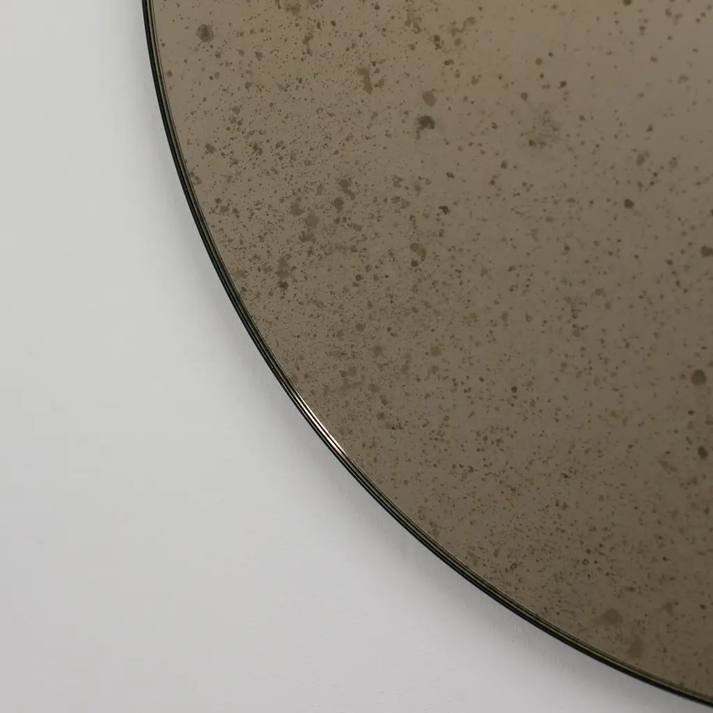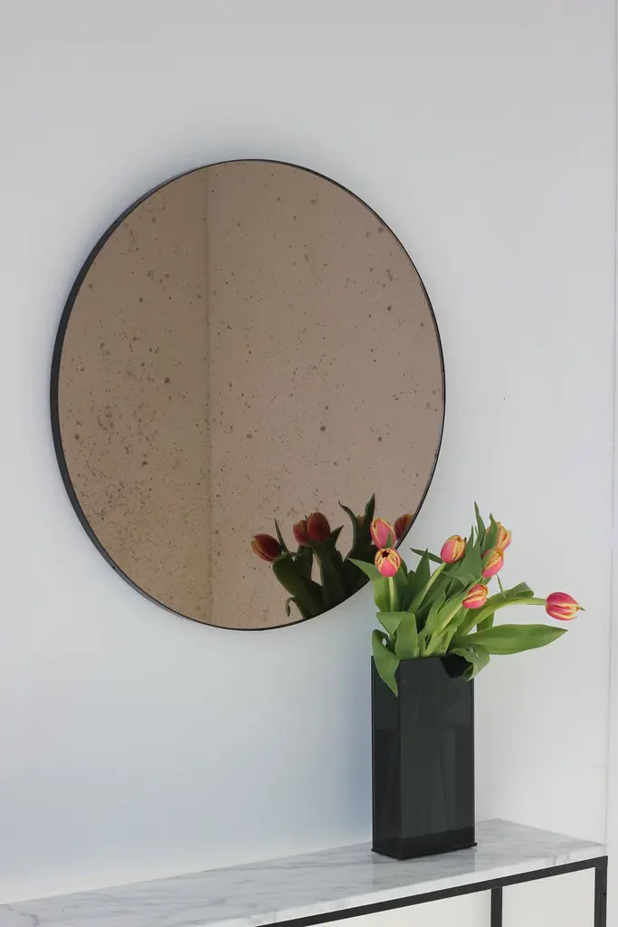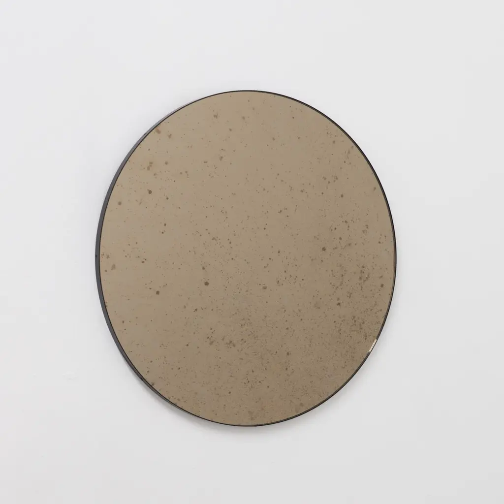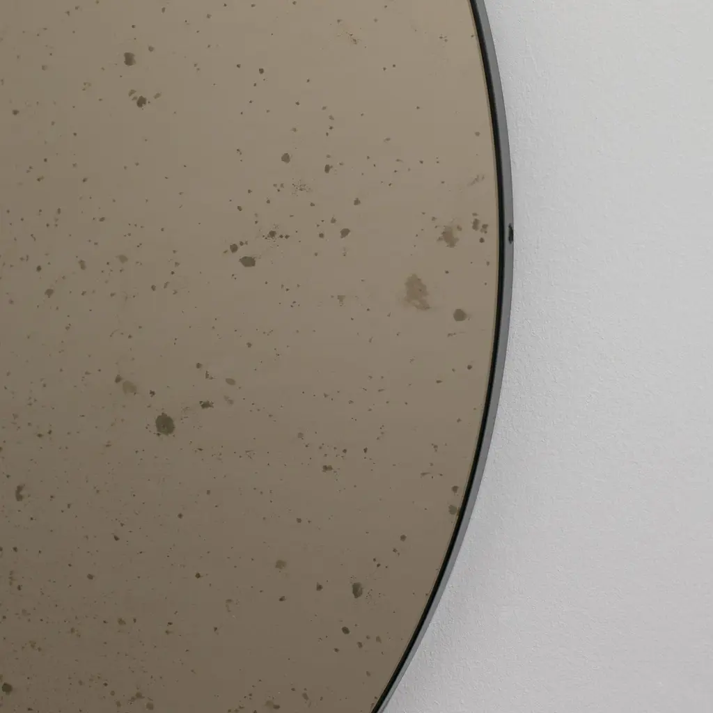 Delightful antiqued Orbis™ round bronze tinted mirror with a minimalist black aluminium powder coated frame. Designed and handcrafted in London, UK.Our mirrors are designed with an integrated French cleat (split batten) system that ensures the mirror is securely mounted flush with the wall. An alternative hanging hook or a Z-bar (depending on the size of the mirror) is available on demand for mirrors that need to be installed allowing some separation from the wall.Please note that the bronze patina finish of our frames is a highly skilled and specialised process. The finish is not plated but created from the base metal itself. It is therefore a very subjective and artistic process carried out by our talented craftsmen. No two frames can truly be identical, which is part of their charm as they are truly unique. Any sample or images provided to obtain your approval on the desired finish or on our website or any other promotional material are therefore for guidance only.This mirror is fully customisable.Shipped safely and insured worldwide. All our mirrors are made on demand. Fabrication lead time for this particular mirror is approximately 4 to 5 weeks. Our mirrors are always shipped by courier express. Shipping via courier express typically requires 1 to 2 days to the UK, or 2 to 7 days outside the UK depending on the destination.Available in the following diameters and variations:Small: 40cm / 15.8"Regular: 50cm / 19.7"Medium: 60cm / 23.6"Large: 80cm / 31.5"Extra Large: 100cm / 39.4"Depth 1.8cm / 0.7"Prices for 120cm / 47.2”, 150cm / 59”, or any bespoke diameter, are available on demand.Available options:- frame finish: brass (brushed, polished or with a bronze patina), copper, stainless steel, blackened metal, powder coated aluminium in a range of standard or bespoke colours- mirror tints: standard silver or bronze- back-illumination creating a halo effect- front-illumination around the periphery of the mirror- demister padPlease contact us for a quote for any bespoke specification or added options.ORDERS OF MULTIPLE MIRRORS OF THE SAME TYPE: Please contact us to receive a Packing and Shipping quote when ordering multiple mirrors of the same type. An order for multiple mirrors of the same type may not be accepted without extra packing and shipping fees. Thank you.