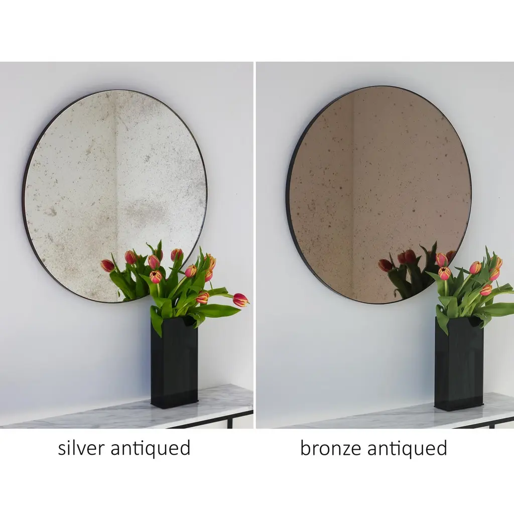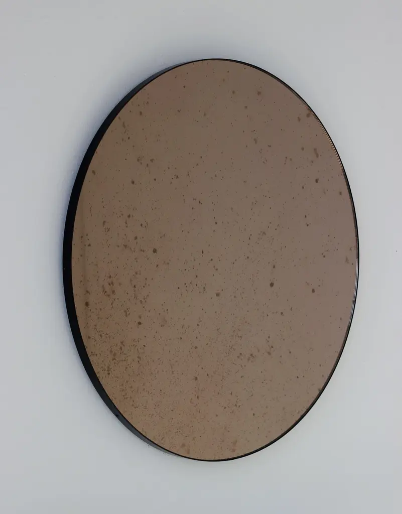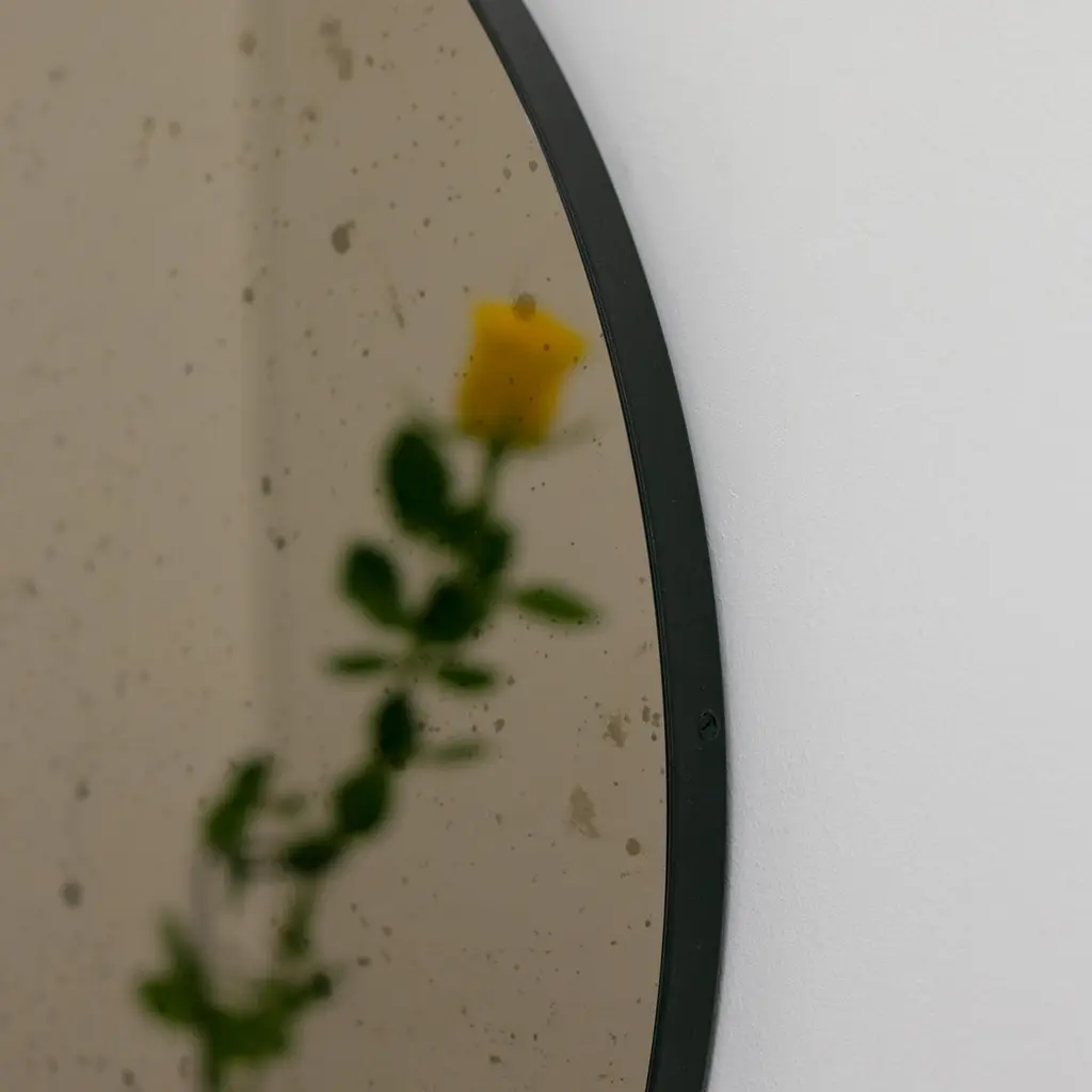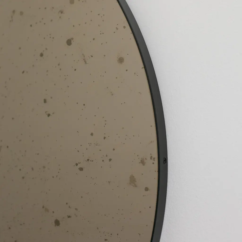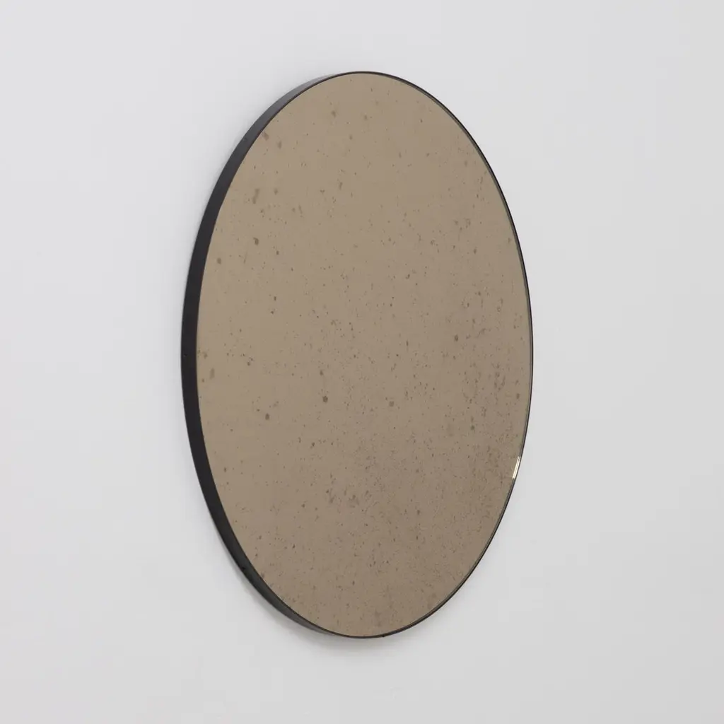 Antiqued bronze Orbis™ round mirror with an elegant powder coated aluminium black frame. Designed and made in London, UK.Our mirrors are designed with an integrated French cleat (split batten) system that ensures the mirror is securely mounted flush with the wall. An alternative hanging hook or a Z-bar (depending on the size of the mirror) is available on demand for mirrors that need to be installed allowing some separation from the wall.This mirror is fully customisable.Shipped safely and insured worldwide. All our mirrors are made on demand. Fabrication lead time for this particular mirror is approximately 4 to 5 weeks. Our mirrors are always shipped by courier express. Shipping via courier express typically requires 1 to 2 days to the UK, or 2 to 7 days outside the UK depending on the destination.Available in the following diameters and variations:Small: 40cm / 15.8"Regular: 50cm / 19.7"Medium: 60cm / 23.6"Large: 80cm / 31.5"Extra Large: 100cm / 39.4"Depth 1.8cm / 0.7"Prices for 120cm / 47.2”, 150cm / 59”, or any bespoke diameter, are available on demand.Available options:- frame finish: brass (brushed, polished or with a bronze patina), copper, stainless steel, blackened metal, powder coated aluminium in a range of standard or bespoke colours- mirror tints: standard silver and bronze- back-illumination creating a halo effect- front-illumination around the periphery of the mirror- demister pad- bevelPlease contact us for a quote for any bespoke specification or added options.ORDERS OF MULTIPLE MIRRORS OF THE SAME TYPE: Please contact us to receive a Packing and Shipping quote when ordering multiple mirrors of the same type. An order for multiple mirrors of the same type may not be accepted without extra packing and shipping fees. Thank you.