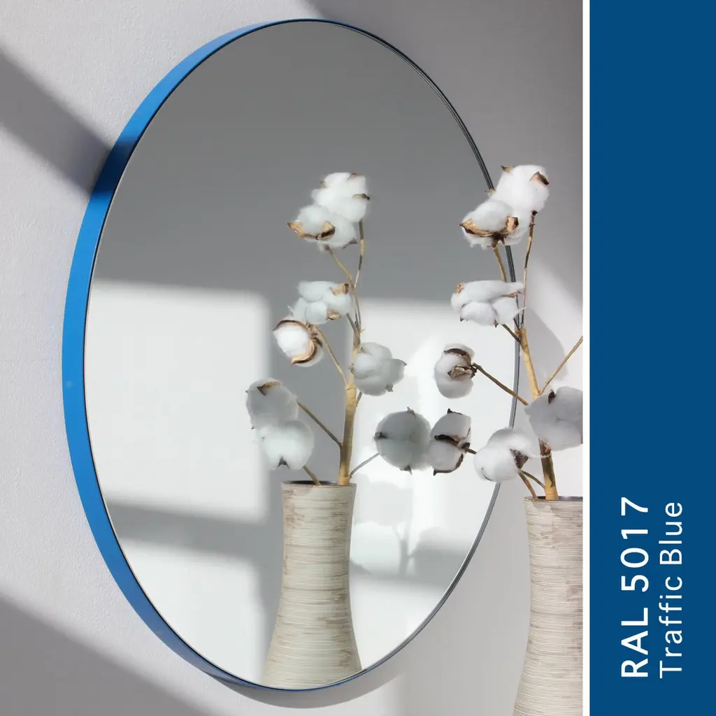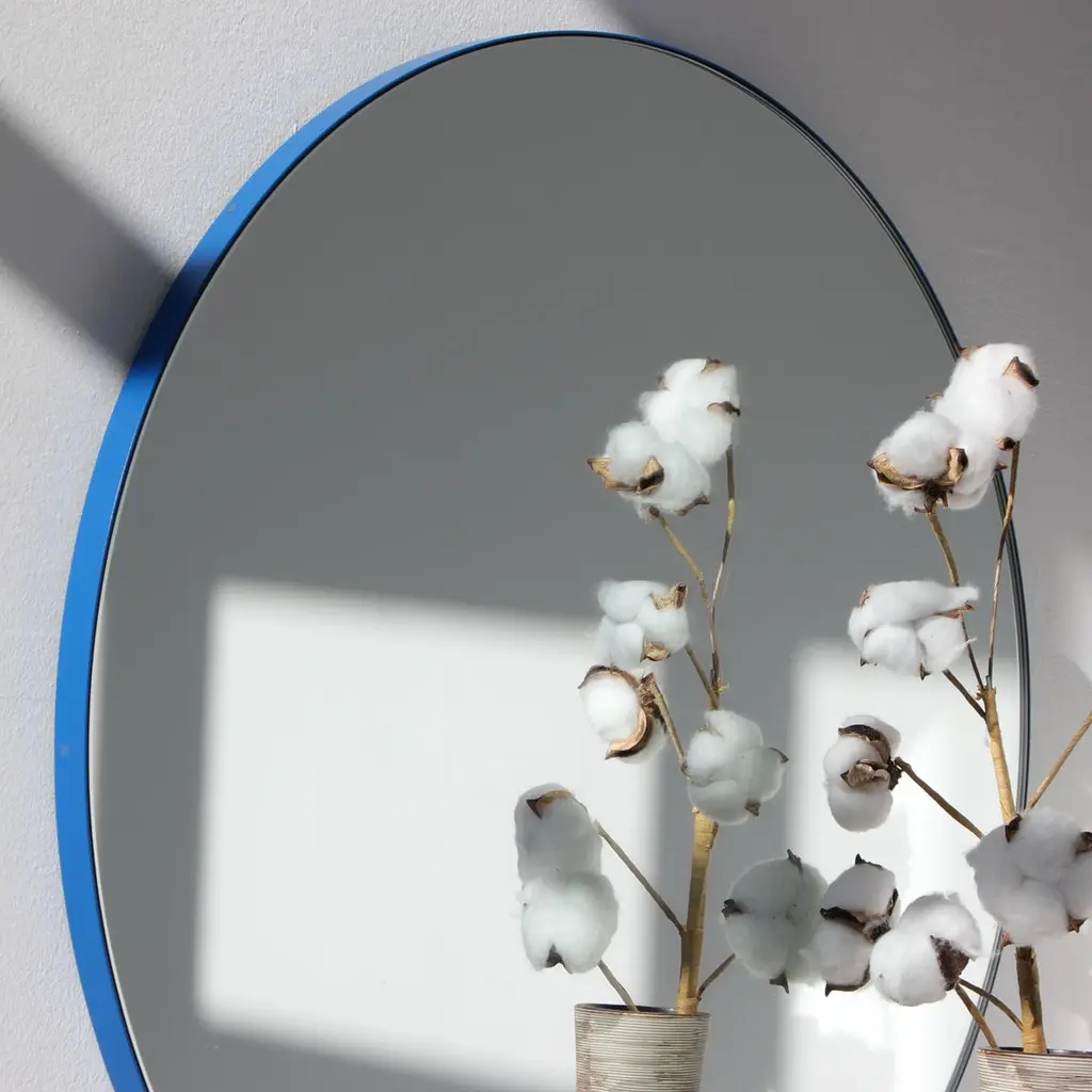 Minimalist round mirror with a modern aluminium powder coated blue frame. Designed and handcrafted in London, UK.Our mirrors are designed with an integrated French cleat (split batten) system that ensures the mirror is securely mounted flush with the wall. An alternative hanging hook or a Z-bar (depending on the size of the mirror) is available on demand for mirrors that need to be installed allowing some separation from the wall.This mirror is fully customisable.Shipped safely and insured worldwide. All our mirrors are made on demand. Fabrication lead time for this particular mirror is approximately 4 to 5 weeks. Our mirrors are always shipped by courier express. Shipping via courier express typically requires 1 to 2 days to the UK, or 2 to 7 days outside the UK depending on the destination. Available in the following diameters and variations:Small: 40cm / 15.8"Regular: 50cm / 19.7"Medium: 60cm / 23.6"Large: 80cm / 31.5"Extra Large: 100cm / 39.4"Depth 1.8cm / 0.7" (customisable)Prices for 120cm / 47.2”, 150cm / 59”, or any bespoke diameter, are available on demand.Available options:- frame depth: 18mm / 0.71’’, 24mm / 0.94’’, and 30mm / 1.18’’- frame finish: brass (brushed, polished or with a bronze patina), copper, stainless steel, blackened metal, powder coated aluminium in a range of standard or bespoke colours- mirror tint: standard silver, black, bronze, blue, rose gold / peach- back-illumination creating a halo effect- front-illumination around the periphery of the mirror- demister pad- bevelPlease contact us for a quote for any bespoke specifications or added options.ORDERS OF MULTIPLE MIRRORS OF THE SAME TYPE: Please contact us to receive a Packing and Shipping quote when ordering multiple mirrors of the same type. An order for multiple mirrors of the same type may not be accepted without extra packing and shipping fees. Thank you.