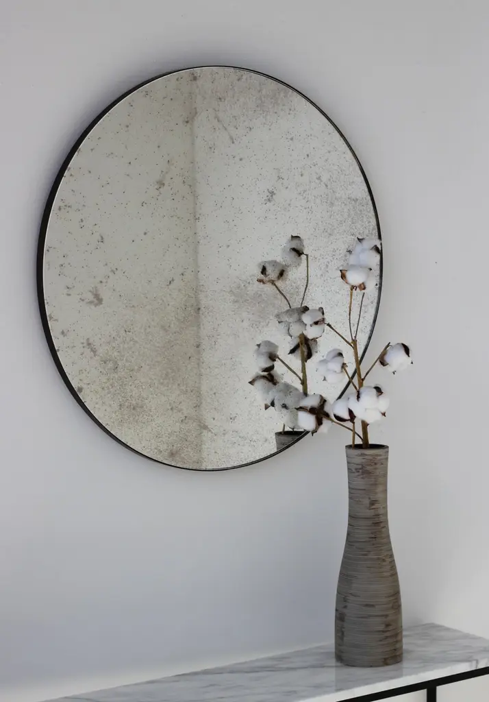 Delightful antiqued Orbis™ round mirror with a minimalist bronze patina brass frame. Designed and handcrafted in London, UK.Our mirrors are designed with an integrated French cleat (split batten) system that ensures the mirror is securely mounted flush with the wall. An alternative hanging hook or a Z-bar (depending on the size of the mirror) is available on demand for mirrors that need to be installed allowing some separation from the wall.The Neska™ signature bronze patina finish of our frames is a highly skilled and handcrafted process. Carried out by our talented craftsmen, this artistic finish is created from the base metal itself to achieve the natural look of aged brass. This makes the finish of each frame original and unique as no two frames can be identical. Any sample or images provided to obtain your approval on the desired finish or on our website or any other promotional material are therefore for guidance only.This mirror is fully customisable.Shipped safely and insured worldwide. All our mirrors are made on demand. Fabrication lead time for this particular mirror is approximately 4 to 5 weeks. Our mirrors are always shipped by courier express. Shipping via courier express typically requires 1 to 2 days to the UK, or 2 to 7 days outside the UK depending on the destination.Available in the following diameters and variations:Small: 40cm / 15.8"Regular: 50cm / 19.7"Medium: 60cm / 23.6"Large: 80cm / 31.5"Extra Large: 100cm / 39.4"Depth 1.8cm / 0.7"Prices for 120cm / 47.2”, 150cm / 59”, or any bespoke diameter, are available on demand.Available options:- frame finish: brass (brushed, polished or with a bronze patina), copper, stainless steel, blackened metal, powder coated aluminium in a range of standard or bespoke colours- mirror tints: standard silver or bronze- back-illumination creating a halo effect- front-illumination around the periphery of the mirror- demister padPlease contact us for a quote for any bespoke specification or added options.ORDERS OF MULTIPLE MIRRORS OF THE SAME TYPE: Please contact us to receive a Packing and Shipping quote when ordering multiple mirrors of the same type. An order for multiple mirrors of the same type may not be accepted without extra packing and shipping fees. Thank you.
