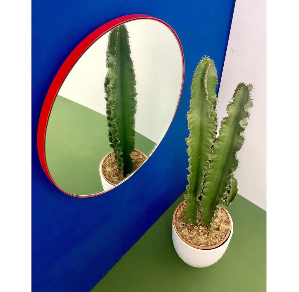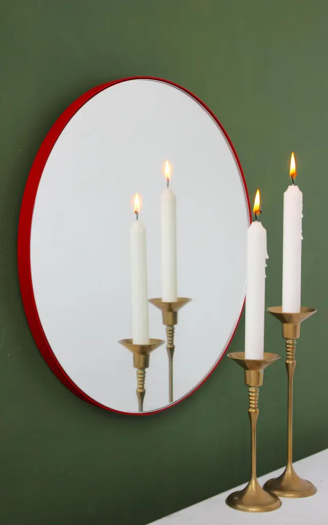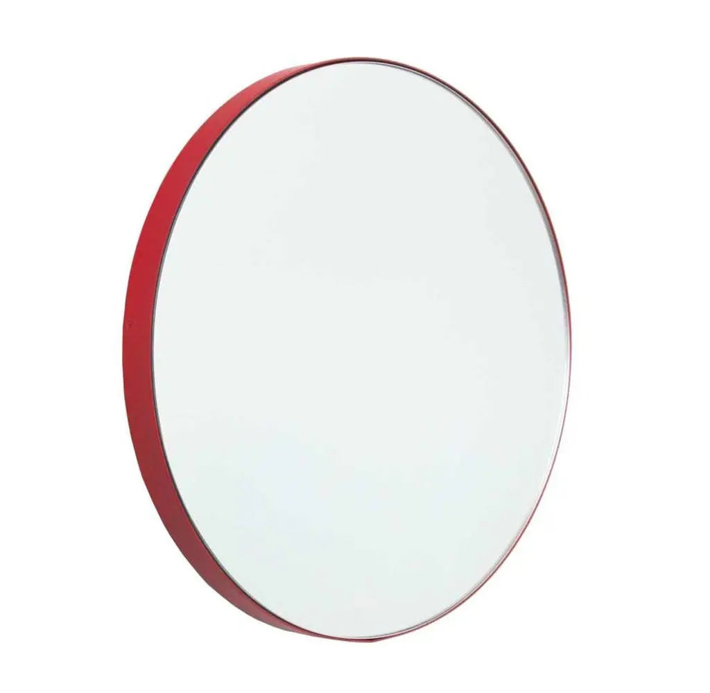 Minimalist round mirror with a modern aluminium powder coated red frame. Designed and handcrafted in London, UK.Our mirrors are designed with an integrated French cleat (split batten) system that ensures the mirror is securely mounted flush with the wall. An alternative hanging hook or a Z-bar (depending on the size of the mirror) is available on demand for mirrors that need to be installed allowing some separation from the wall.This mirror is fully customisable.The mirror in the images illustrates a small size, measuring 27cm x 68cm x 1.8cm / 10.6in x 26.8in x 0.71inShipped safely and insured worldwide. All our mirrors are made on demand. Fabrication lead time for this mirror is approximately 4 to 5 weeks. Our mirrors are always shipped by courier express. Shipping via courier express typically requires 1 to 2 days to the UK, or 2 to 7 days outside the UK depending on the destination.Available in the following sizes:Small: 27cm x 68cm x 1.8cm / 10.6'' x 26.8'' x 0.71’’Medium: 37cm x 56cm x 1.8cm / 14.6'' x 22" x 0.71’’Large: 46cm x 71cm x 1.8cm / 18.1'' x 28" x 0.71’’Extra Large: 48cm x 97cm x 1.8cm / 18.9" x 38.2" x 0.71’’or any bespoke dimensions.Available options:- frame depth: 18mm / 0.71’’, 24mm / 0.94’’ and 30mm / 1.18’’- frame finish: brass (brushed, polished or with a bronze patina), copper, stainless steel, blackened stainless steel, or in a variety of colours- mirror tint: silver, bronze, black, rose gold / peach, blue or green- bevelling- back-illumination creating a halo effect- demister padPlease contact us for a quote for any bespoke specification or added options.ORDERS OF MULTIPLE MIRRORS OF THE SAME TYPE: Please contact us to receive a Packing and Shipping quote when ordering multiple mirrors of the same type. An order for multiple mirrors of the same type may not be accepted without extra packing and shipping fees. Thank you.