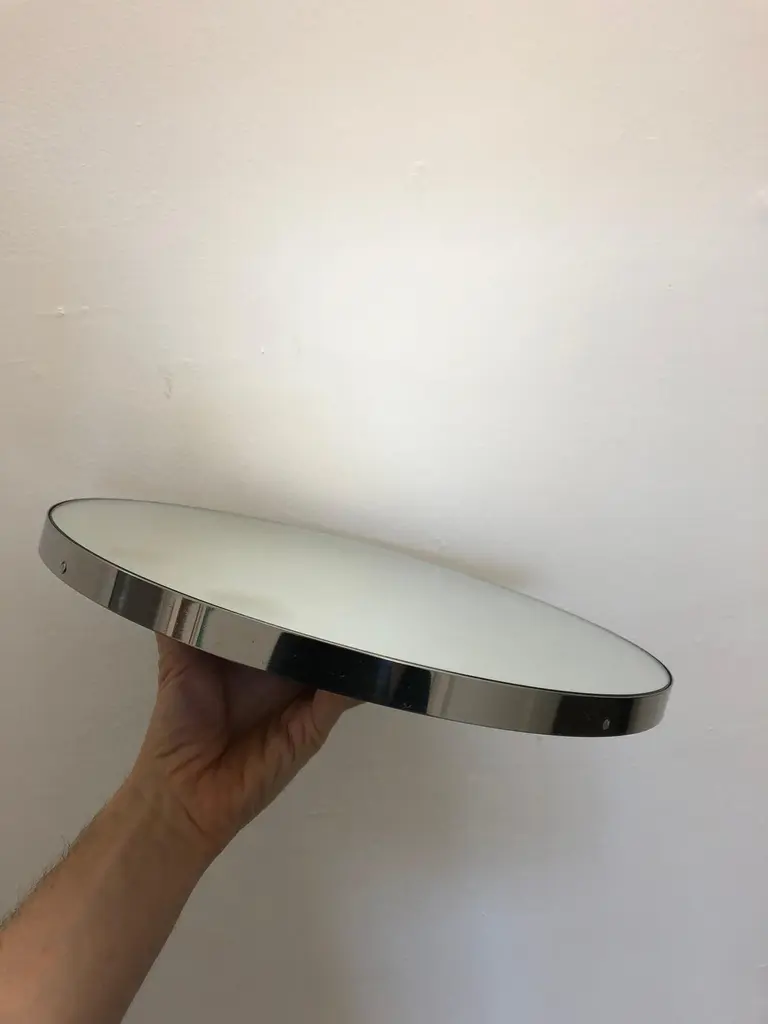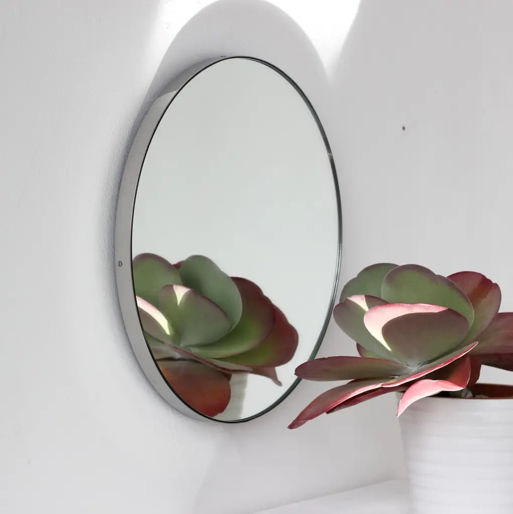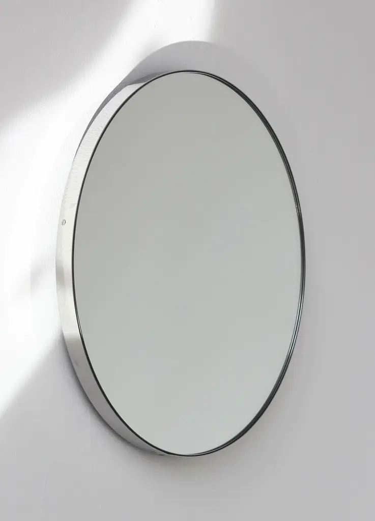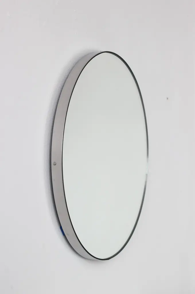 Minimalist round mirror with an elegant brushed stainless steel frame (also available in a polished finish). The detailing and finish, including visible screws, emphasise the crafty and quality feel of the mirror, a true signature of our brand. Designed and made in London, UK.Our mirrors are designed with an integrated French cleat (split batten) system that ensures the mirror is securely mounted flush with the wall. An alternative hanging hook or a Z-bar (depending on the size of the mirror) is available on demand for mirrors that need to be installed allowing some separation from the wall.Shipped safely and insured worldwide. All our mirrors are made on demand. Fabrication lead time for this particular mirror is approximately 4 to 5 weeks. Our mirrors are always shipped by courier express. Shipping via courier express typically requires 1 to 2 days to the UK, or 2 to 7 days outside the UK depending on the destination. Available in the following diameters and variations:Small: 40cm / 15.8"Regular: 50cm / 19.7"Medium: 60cm / 23.6"Large: 80cm / 31.5"Extra Large: 100cm / 39.4"Depth 1.8cm / 0.7"Prices for 120cm / 47.2”, 150cm / 59”, or any bespoke diameter, are available on demand.Available options:- frame finish: brass (brushed, polished or with a bronze patina), copper, stainless steel, blackened metal, powder coated aluminium in a range of standard or bespoke colours- mirror tints: standard silver, black, bronze, blue, rose gold / peach- back-illumination creating a halo effect- front-illumination around the periphery of the mirror- demister pad- bevelPlease contact us for a quote for any bespoke specifications or added options.ORDERS OF MULTIPLE MIRRORS OF THE SAME TYPE: Please contact us to receive a Packing and Shipping quote when ordering multiple mirrors of the same type. An order for multiple mirrors of the same type may not be accepted without extra packing and shipping fees. Thank you.