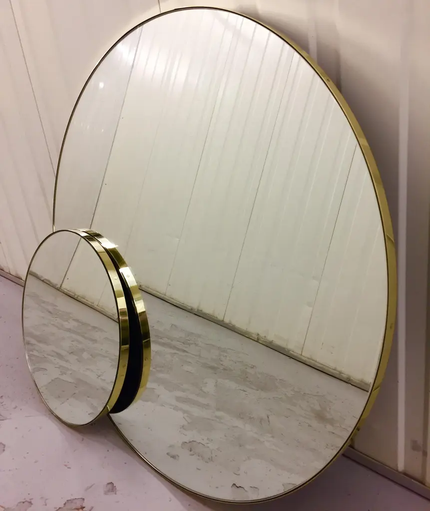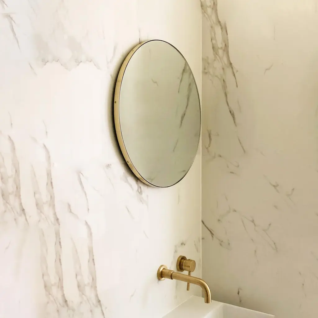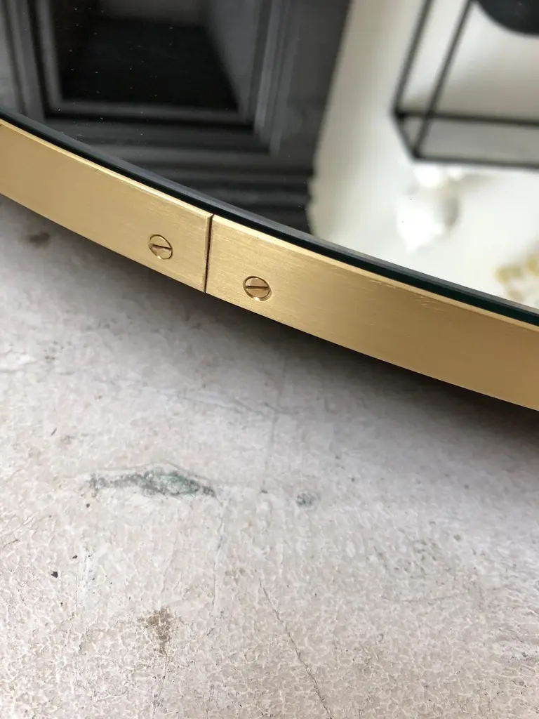 Minimalist Orbis™ round mirror with an elegant solid brushed brass frame. The detailing and finish, including visible brass screws, emphasise the crafty and quality feel of the mirror, a true signature of our brand. Designed and handcrafted in London, UK.Our mirrors are designed with an integrated French cleat (split batten) system that ensures the mirror is securely mounted flush with the wall. An alternative hanging hook or a Z-bar (depending on the size of the mirror) is available on demand for mirrors that need to be installed allowing some separation from the wall.This mirror is fully customisable.Shipped safely and insured worldwide. All our mirrors are made on demand. Fabrication lead time for this particular mirror is approximately 4 to 5 weeks. Our mirrors are always shipped by courier express. Shipping via courier express typically requires 1 to 2 days to the UK, or 2 to 7 days outside the UK depending on the destination.Available in the following diameters and variations:Small: 40cm / 15.8"Regular: 50cm / 19.7"Medium: 60cm / 23.6"Large: 80cm / 31.5"Extra Large: 100cm / 39.4"Depth 1.8cm / 0.7" (customisable)Prices for 120cm / 47.2”, 150cm / 59”, or any bespoke diameter, are available on demand.Available options:- frame depth: 18mm / 0.71’’, 24mm / 0.94’’ and 30mm / 1.18’’- frame finish: brass (brushed, polished or with a bronze patina), copper, stainless steel, blackened metal, powder coated aluminium in a range of standard or bespoke colours- mirror tints: standard silver, black, bronze, blue, rose gold / peach- back-illumination creating a halo effect- front-illumination around the periphery of the mirror- demister pad- bevelPlease contact us for a quote for any bespoke specifications or added options.ORDERS OF MULTIPLE MIRRORS OF THE SAME TYPE: Please contact us to receive a Packing and Shipping quote when ordering multiple mirrors of the same type. An order for multiple mirrors of the same type may not be accepted without extra packing and shipping fees. Thank you.