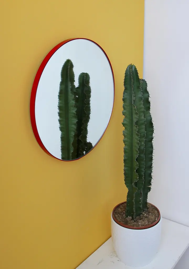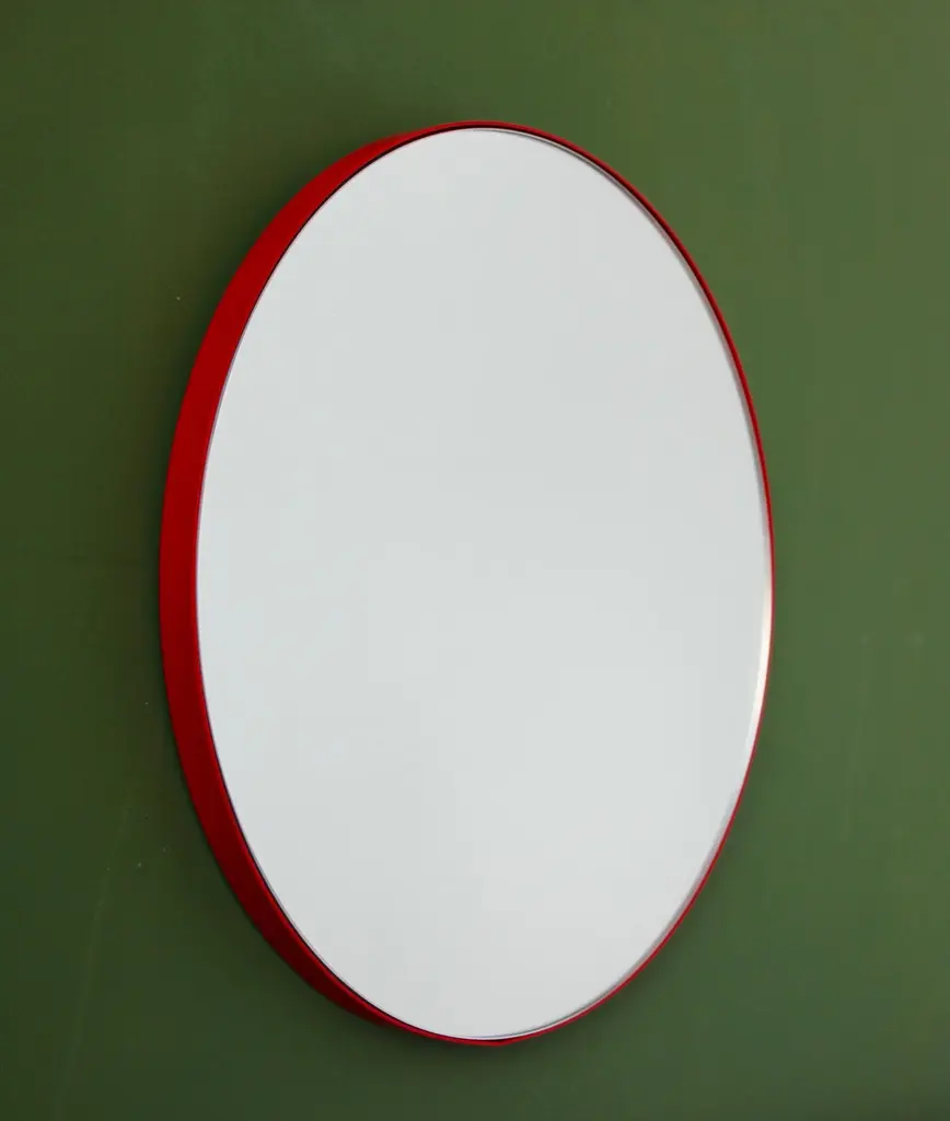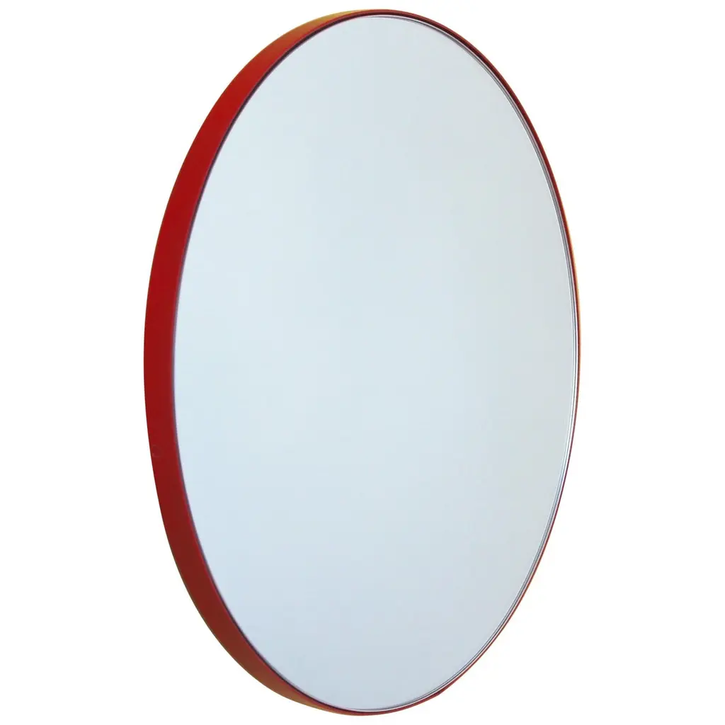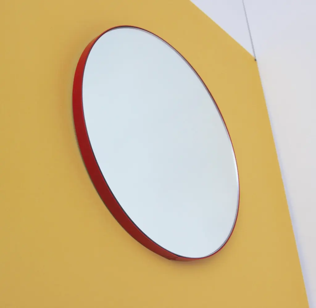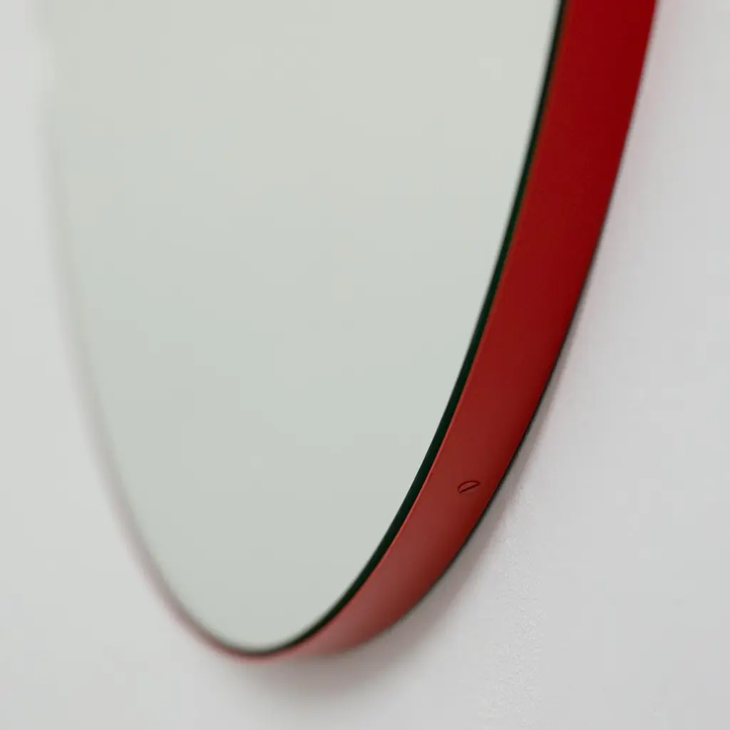 Minimalist round mirror with a modern aluminium powder coated red frame. Designed and handcrafted in London, UK.Our mirrors are designed with an integrated French cleat (split batten) system that ensures the mirror is securely mounted flush with the wall. An alternative hanging hook or a Z-bar (depending on the size of the mirror) is available on demand for mirrors that need to be installed allowing some separation from the wall.This mirror is fully customisable.Shipped safely and insured worldwide. All our mirrors are made on demand. Fabrication lead time for this particular mirror is approximately 4 to 5 weeks. Our mirrors are always shipped by courier express. Shipping via courier express typically requires 1 to 2 days to the UK, or 2 to 7 days outside the UK depending on the destination. Available in the following diameters and variations:Small: 40cm / 15.8"Regular: 50cm / 19.7"Medium: 60cm / 23.6"Large: 80cm / 31.5"Extra Large: 100cm / 39.4"Depth 1.8cm / 0.7" (customisable)Prices for 120cm / 47.2”, 150cm / 59”, or any bespoke diameter, are available on demand.Available options:- frame depth: 18mm / 0.71’’, 24mm / 0.94’’, and 30mm / 1.18’’- frame finish: brass (brushed, polished or with a bronze patina), copper, stainless steel, blackened metal, powder coated aluminium in a range of standard or bespoke colours- mirror tint: standard silver, black, bronze, blue, rose gold / peach- back-illumination creating a halo effect- front-illumination around the periphery of the mirror- demister pad- bevelPlease contact us for a quote for any bespoke specifications or added options.ORDERS OF MULTIPLE MIRRORS OF THE SAME TYPE: Please contact us to receive a Packing and Shipping quote when ordering multiple mirrors of the same type. An order for multiple mirrors of the same type may not be accepted without extra packing and shipping fees. Thank you.