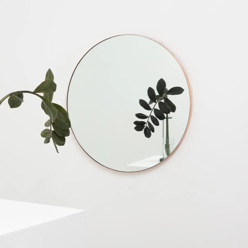 Minimalist round mirror with an elegant brushed copper frame. The detailing and finish, including visible copper plated screws, emphasise the craft and quality feel of the mirror, a true signature of our brand. Designed and handcrafted in London, UK.Our mirrors are designed with an integrated French cleat (split batten) system that ensures the mirror is securely mounted flush with the wall. An alternative hanging hook or a Z-bar (depending on the size of the mirror) is available on demand for mirrors that need to be installed allowing some separation from the wall.This mirror is fully customisable.Shipped safely and insured worldwide. All our mirrors are made on demand. Fabrication lead time for this particular mirror is approximately 4 to 5 weeks. Our mirrors are always shipped by courier express. Shipping via courier express typically requires 1 to 2 days to the UK, or 2 to 7 days outside the UK depending on the destination. Available in the following diameters and variations:Small: 40cm / 15.8"Regular: 50cm / 19.7"Medium: 60cm / 23.6"Large: 80cm / 31.5"Extra Large: 100cm / 39.4"Depth 1.8cm / 0.7" (customisable)Prices for 120cm / 47.2”, 150cm / 59”, or any bespoke diameter, are available on demand.Available options:- frame depth: 18mm / 0.71’’, 24mm / 0.94’’, and 30mm / 1.18’’- frame finish: brass (brushed, polished or with a bronze patina), copper, stainless steel, blackened metal, powder coated aluminium in a range of standard or bespoke colours- mirror tint: standard silver, black, bronze, blue, rose gold / peach- back-illumination creating a halo effect- front-illumination around the periphery of the mirror- demister pad- bevelORDERS OF MULTIPLE MIRRORS OF THE SAME TYPE: Please contact us to receive a Packing and Shipping quote when ordering multiple mirrors of the same type. An order for multiple mirrors of the same type may not be accepted without extra packing and shipping fees. Thank you.