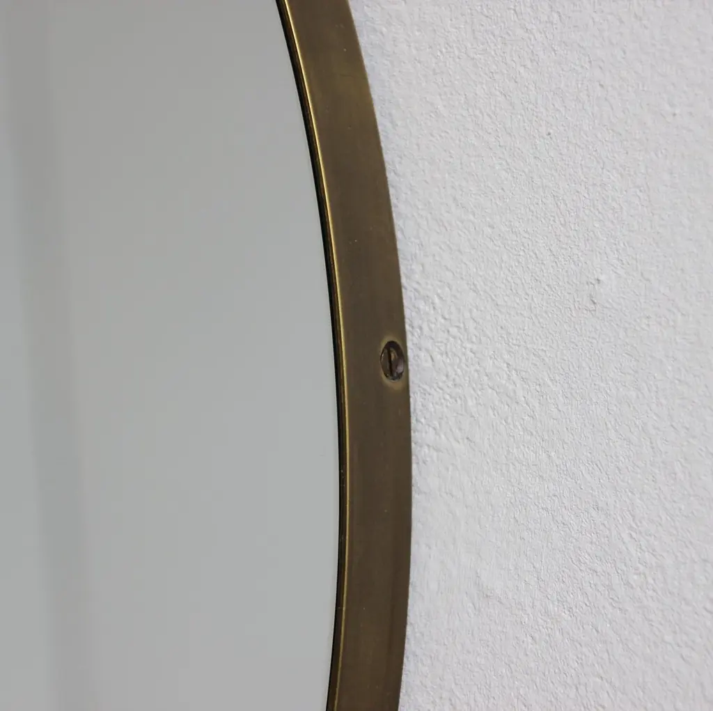 Minimalist Orbis™ round mirror with an elegant brass frame with a bronze patina finish. Designed and made in London, UK.Our mirrors are designed with an integrated French cleat (split batten) system that ensures the mirror is securely mounted flush with the wall. An alternative hanging hook or a Z-bar (depending on the size of the mirror) is available on demand for mirrors that need to be installed allowing some separation from the wall.The Neska™ signature bronze patina finish of our frames is a highly skilled and handcrafted process. Carried out by our talented craftsmen, this artistic finish is created from the base metal itself to achieve the natural look of aged brass. This makes the finish of each frame original and unique as no two frames can be identical. Any sample or images provided to obtain your approval on the desired finish or on our website or any other promotional material are therefore for guidance only.This mirror is fully customisable.Shipped safely and insured worldwide. All our mirrors are made on demand. Fabrication lead time for this particular mirror is approximately 4 to 5 weeks. Our mirrors are always shipped by courier express. Shipping via courier express typically requires 1 to 2 days to the UK, or 2 to 7 days outside the UK depending on the destination.Prices on the website do not include local taxes and/or applicable import duties for deliveries outside of the United Kingdom. Available in the following diameters and variations:Small: 40cm / 15.8"Regular: 50cm / 19.7"Medium: 60cm / 23.6"Large: 80cm / 31.5"Extra Large: 100cm / 39.4"Depth 1.8cm / 0.7" (customisable)Prices for 120cm / 47.2”, 150cm / 59”, or any bespoke diameter, are available on demand.Available options:- frame depth: 18mm / 0.71’’, 24mm / 0.94’’, and 30mm / 1.18’’- frame finish: brass (brushed, polished or with a bronze patina), copper, stainless steel, blackened metal, powder coated aluminium in a range of standard or bespoke colours- mirror tint: standard silver, black, bronze, blue, rose gold / peach- back-illumination creating a halo effect- front-illumination around the periphery of the mirror- demister pad- bevelPlease contact us for a quote for any bespoke specifications or added options.ORDERS OF MULTIPLE MIRRORS OF THE SAME TYPE: Please contact us to receive a Packing and Shipping quote when ordering multiple mirrors of the same type. An order for multiple mirrors of the same type may not be accepted without extra packing and shipping fees. Thank you.