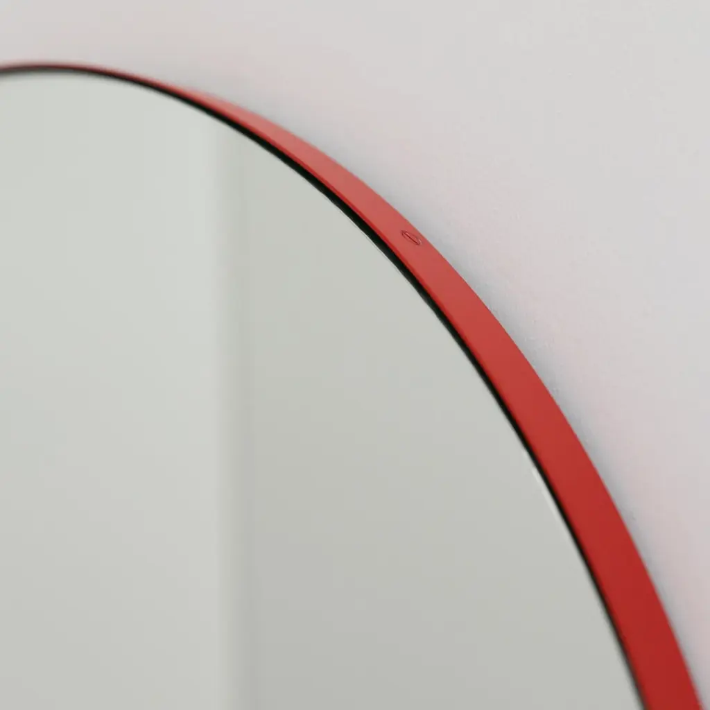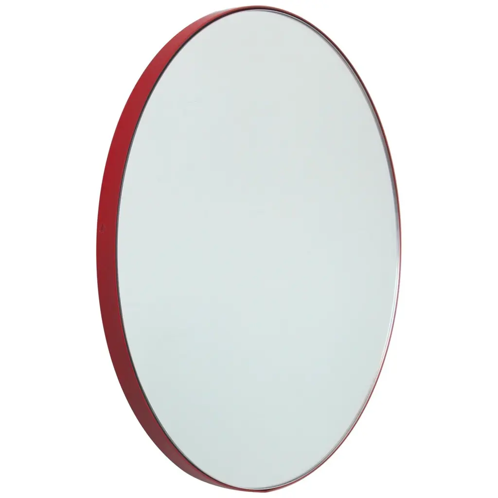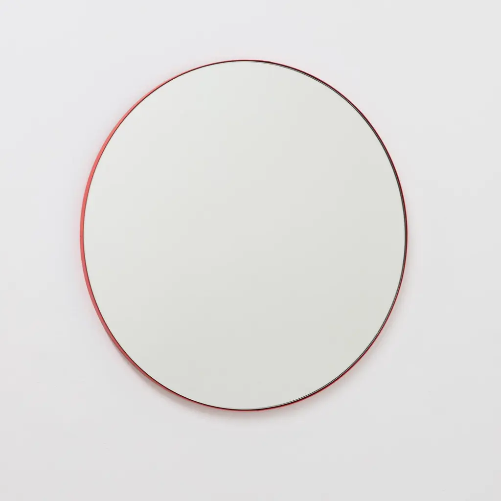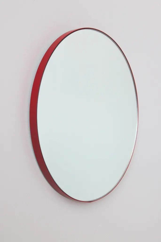 Minimalist round mirror with a modern aluminium powder coated red frame. Designed and handcrafted in London, UK.Medium, large and extra-large mirrors (60, 80 and 100cm) are fitted with an ingenious French cleat (split batten) system so they may hang flush with the wall. Small and regular sizes (40 and 50cm) are fitted with a practical brass D ring hook. A Z bar system is available for all sizes on demand.This mirror is fully customisable.Shipped safely and insured worldwide. All our mirrors are made on demand. Fabrication lead time for this particular mirror is approximately 4 to 5 weeks. Our mirrors are always shipped by courier express. Shipping via courier express typically requires 1 to 2 days to the UK, or 2 to 7 days outside the UK depending on the destination. Available in the following diameters and variations:Small: 40cm / 15.8"Regular: 50cm / 19.7"Medium: 60cm / 23.6"Large: 80cm / 31.5"Extra Large: 100cm / 39.4"Depth 1.8cm / 0.7" (customisable)Prices for 120cm / 47.2”, 150cm / 59”, or any bespoke diameter, are available on demand.Available options:- frame depth: 18mm / 0.71’’, 24mm / 0.94’’, and 30mm / 1.18’’- frame finish: brass (brushed, polished or with a bronze patina), copper, stainless steel, blackened metal, powder coated aluminium in a range of standard or bespoke colours- mirror tint: standard silver, black, bronze, blue, rose gold / peach- back-illumination creating a halo effect- front-illumination around the periphery of the mirror- demister pad- bevelPlease contact us for a quote for any bespoke specifications or added options.ORDERS OF MULTIPLE MIRRORS OF THE SAME TYPE: Please contact us to receive a Packing and Shipping quote when ordering multiple mirrors of the same type. An order for multiple mirrors of the same type may not be accepted without extra packing and shipping fees. Thank you.