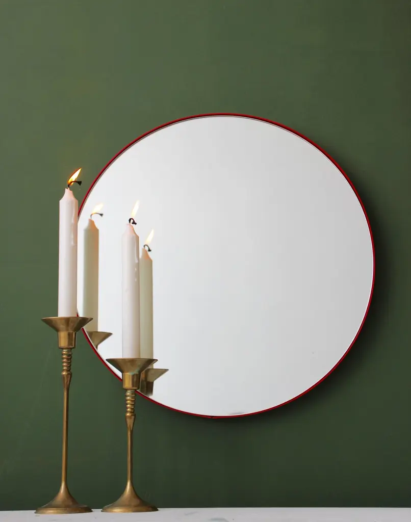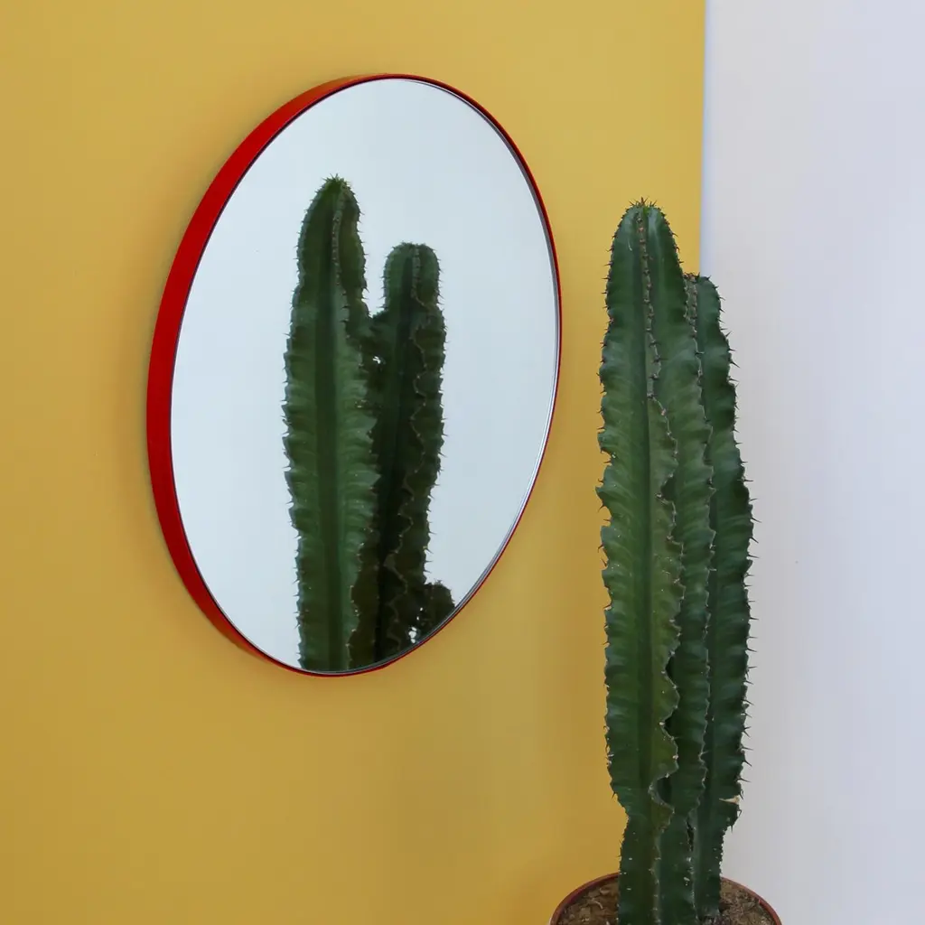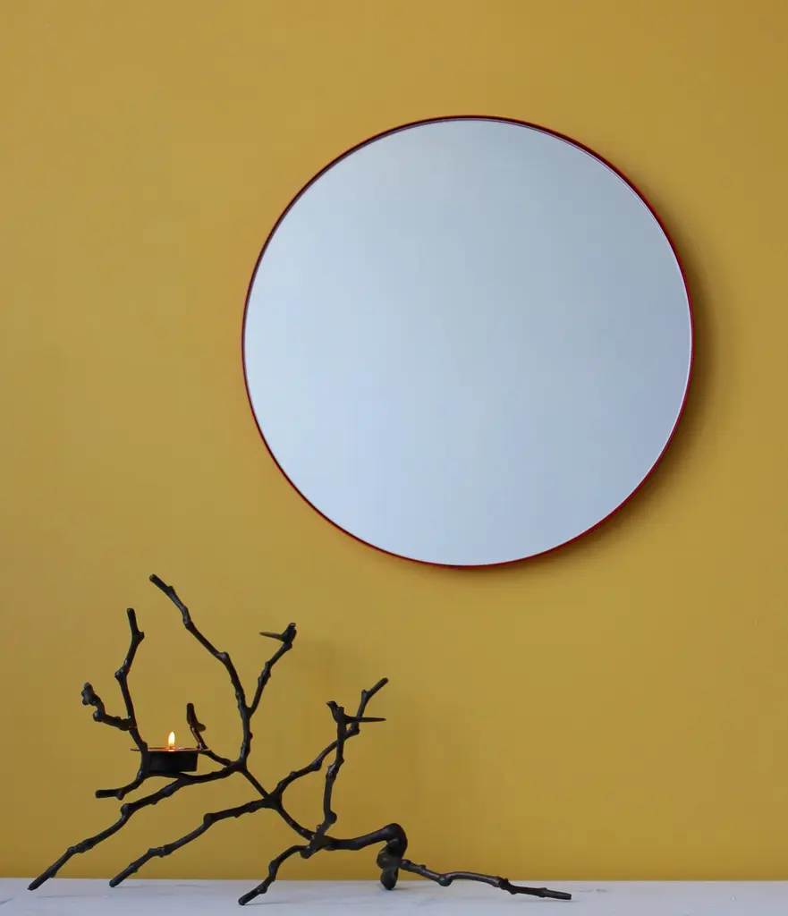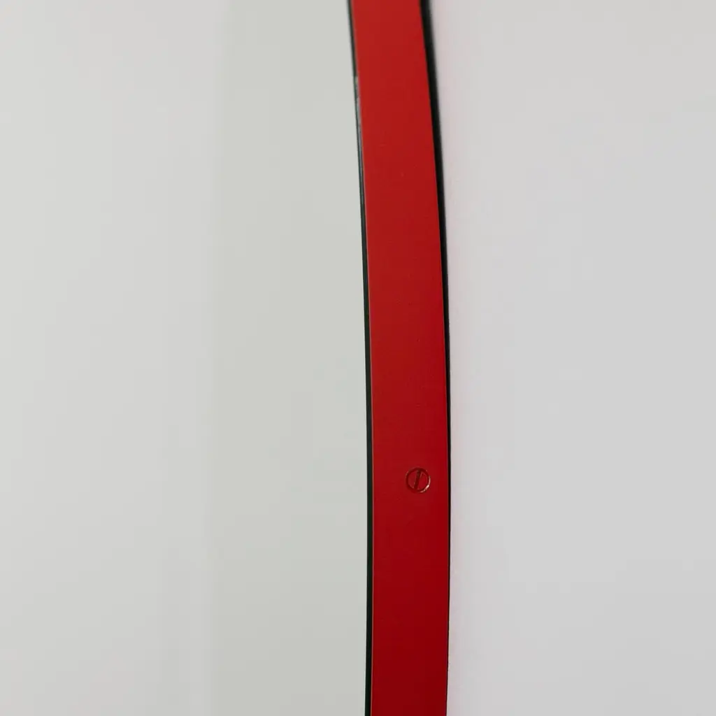 Minimalist round mirror with a modern aluminium powder coated red frame. Designed and handcrafted in London, UK.Medium, large and extra-large mirrors (60, 80 and 100cm) are fitted with an ingenious French cleat (split batten) system so they may hang flush with the wall. Small and regular sizes (40 and 50cm) are fitted with a practical brass D ring hook. A Z bar system is available for all sizes on demand.This mirror is fully customisable.Shipped safely and insured worldwide. All our mirrors are made on demand. Fabrication lead time for this particular mirror is approximately 4 to 5 weeks. Our mirrors are always shipped by courier express. Shipping via courier express typically requires 1 to 2 days to the UK, or 2 to 7 days outside the UK depending on the destination. Available in the following diameters and variations:Small: 40cm / 15.8"Regular: 50cm / 19.7"Medium: 60cm / 23.6"Large: 80cm / 31.5"Extra Large: 100cm / 39.4"Depth 1.8cm / 0.7" (customisable)Prices for 120cm / 47.2”, 150cm / 59”, or any bespoke diameter, are available on demand.Available options:- frame depth: 18mm / 0.71’’, 24mm / 0.94’’, and 30mm / 1.18’’- frame finish: brass (brushed, polished or with a bronze patina), copper, stainless steel, blackened metal, powder coated aluminium in a range of standard or bespoke colours- mirror tint: standard silver, black, bronze, blue, rose gold / peach- back-illumination creating a halo effect- front-illumination around the periphery of the mirror- demister pad- bevelPlease contact us for a quote for any bespoke specifications or added options.ORDERS OF MULTIPLE MIRRORS OF THE SAME TYPE: Please contact us to receive a Packing and Shipping quote when ordering multiple mirrors of the same type. An order for multiple mirrors of the same type may not be accepted without extra packing and shipping fees. Thank you.
