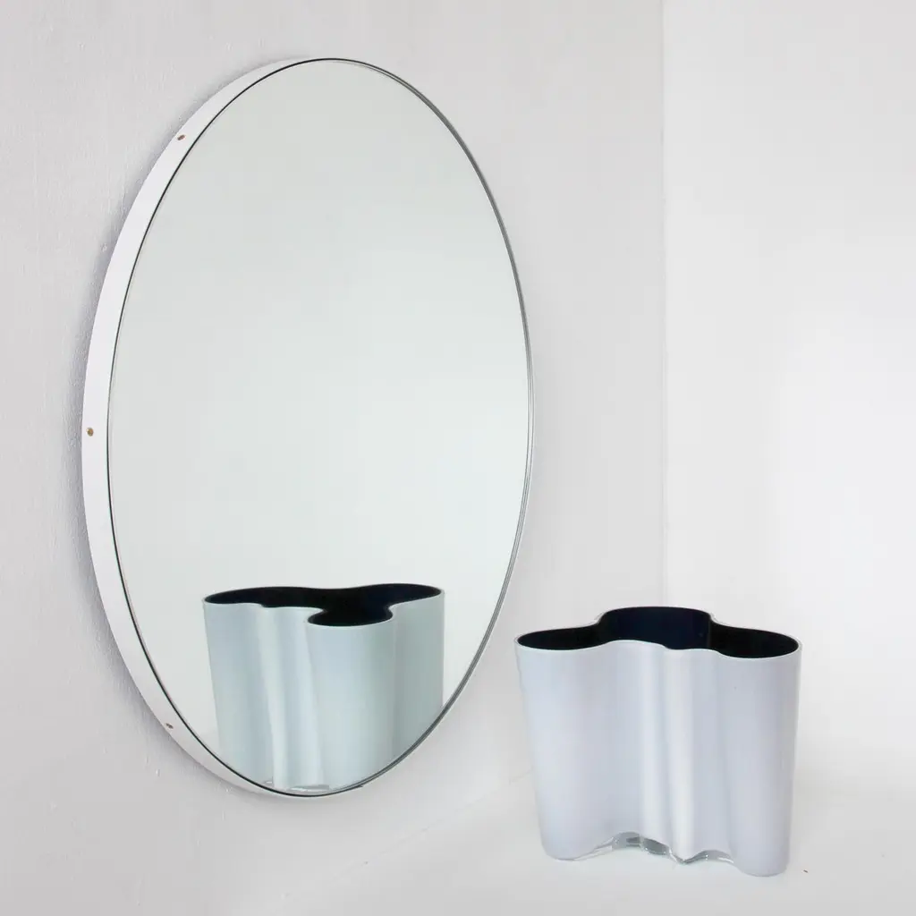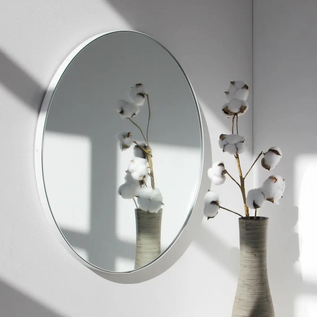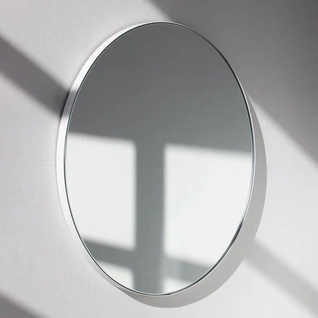 Minimalist round mirror with a modern aluminium powder coated white frame. Designed and handcrafted in London, UK.Our mirrors are designed with an integrated French cleat (split batten) system that ensures the mirror is securely mounted flush with the wall. An alternative hanging hook or a Z-bar (depending on the size of the mirror) is available on demand for mirrors that need to be installed allowing some separation from the wall.This mirror is fully customisable.Shipped safely and insured worldwide. All our mirrors are made on demand. Fabrication lead time for this particular mirror is approximately 4 to 5 weeks. Our mirrors are always shipped by courier express. Shipping via courier express typically requires 1 to 2 days to the UK, or 2 to 7 days outside the UK depending on the destination. Available in the following diameters and variations:Small: 40cm / 15.8"Regular: 50cm / 19.7"Medium: 60cm / 23.6"Large: 80cm / 31.5"Extra Large: 100cm / 39.4"Depth 1.8cm / 0.7" (customisable)Prices for 120cm / 47.2”, 150cm / 59”, or any bespoke diameter, are available on demand.Available options:- frame depth: 18mm / 0.71’’, 24mm / 0.94’’, and 30mm / 1.18’’- frame finish: brass (brushed, polished or with a bronze patina), copper, stainless steel, blackened metal, powder coated aluminium in a range of standard or bespoke colours- mirror tint: standard silver, black, bronze, blue, rose gold / peach- back-illumination creating a halo effect- front-illumination around the periphery of the mirror- demister pad- bevelPlease contact us for a quote for any bespoke specifications or added options.ORDERS OF MULTIPLE MIRRORS OF THE SAME TYPE: Please contact us to receive a Packing and Shipping quote when ordering multiple mirrors of the same type. An order for multiple mirrors of the same type may not be accepted without extra packing and shipping fees. Thank you.