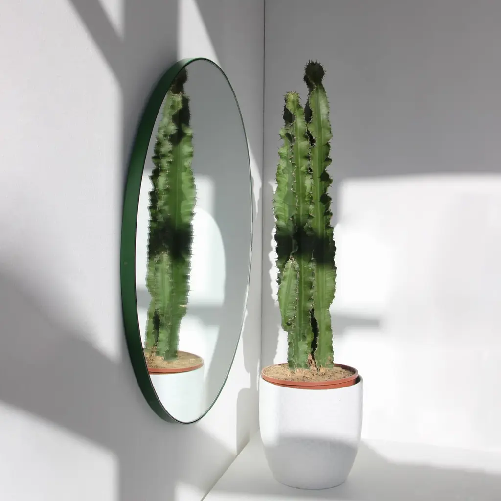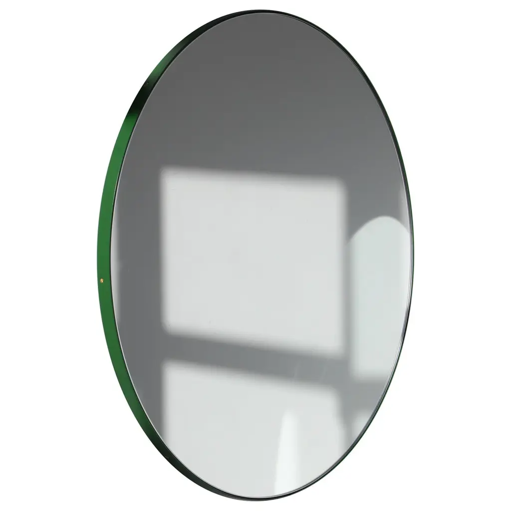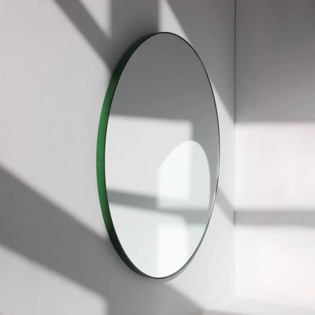 Minimalist round mirror with a lively aluminium powder coated green frame. Designed and handcrafted in London, UK.Our mirrors are designed with an integrated French cleat (split batten) system that ensures the mirror is securely mounted flush with the wall. An alternative hanging hook or a Z-bar (depending on the size of the mirror) is available on demand for mirrors that need to be installed allowing some separation from the wall.This mirror is fully customisable.Shipped safely and insured worldwide. All our mirrors are made on demand. Fabrication lead time for this particular mirror is approximately 4 to 5 weeks. Our mirrors are always shipped by courier express. Shipping via courier express typically requires 1 to 2 days to the UK, or 2 to 7 days outside the UK depending on the destination. Available in the following diameters and variations:Small: 40cm / 15.8"Regular: 50cm / 19.7"Medium: 60cm / 23.6"Large: 80cm / 31.5"Extra Large: 100cm / 39.4"Depth 1.8cm / 0.7" (customisable)Prices for 120cm / 47.2”, 150cm / 59”, or any bespoke diameter, are available on demand.Available options:- frame depth: 18mm / 0.71’’, 24mm / 0.94’’, and 30mm / 1.18’’- frame finish: brass (brushed, polished or with a bronze patina), copper, stainless steel, blackened metal, powder coated aluminium in a range of standard or bespoke colours- mirror tint: standard silver, black, bronze, blue, rose gold / peach- back-illumination creating a halo effect- front-illumination around the periphery of the mirror- demister pad- bevelPlease contact us for a quote for any bespoke specifications or added options.ORDERS OF MULTIPLE MIRRORS OF THE SAME TYPE: Please contact us to receive a Packing and Shipping quote when ordering multiple mirrors of the same type. An order for multiple mirrors of the same type may not be accepted without extra packing and shipping fees. Thank you.