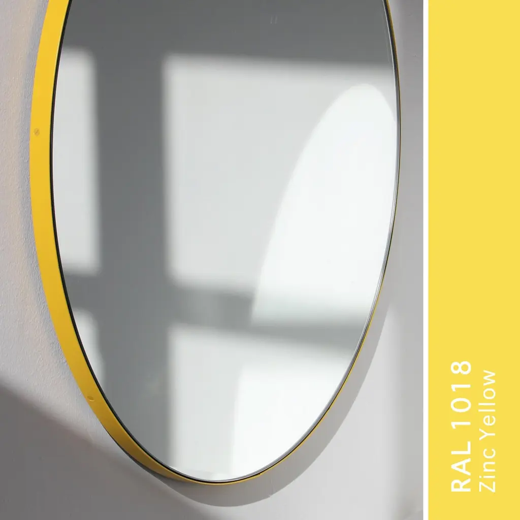 Modern Orbis™ round ceiling suspended mirror with a vibrant powder coated yellow frame for unique interiors. Our unique collections of ceiling suspended mirrors are designed and handcrafted in London, UK, and are therefore fully customisable to suit the specific requirements of your interior.Measures: 60cm (23.62") Diameter x 3cm (1.18") Deep 41cm (16.14") Drop (customisable)This mirror is available in other colours including black, red, green and blue. Also available in custom colours to match a specific colour scheme.The high quality finish of our suspended mirrors extends to their backings, which are made from a powder coated panel available in black or white. Backings can also be upgraded to a finish that matches the frame (as illustrated in the pictures) or can be substituted by a second mirror, making your mirror double sided.The ceiling plate is supplied with a cover hiding the screws to complete the minimalist design of the mirror.Shipped safely and insured worldwide. All our mirrors are made on demand. Fabrication lead time for this mirror is approximately 6 to 7 weeks. Our mirrors are always shipped by courier express. Shipping via courier express typically requires 1 to 2 days to the UK, or 2 to 7 days outside the UK depending on the destination.Available options:•double sided mirror•backing in a finish that matches the frame•frame finishes: brass (brushed, polished or with a bronze patina), copper, stainless steel, blackened metal, powder coated aluminium in a range of standard or bespoke colours•full frame that extends to the front of the mirror•mirror tints: standard silver, black, bronze, blue, rose gold / peach•back-illumination creating a halo effect•front-illumination around the periphery of the mirror•ON/OFF sensor switch•demister pad•bevelA presentation illustrating the options above is also available on demand. Please contact us for a quote for any bespoke specification or added options.IMPORTANT NOTES:-This suspended mirror is intended to be mounted onto the ceiling and cannot be installed onto a countertop. Countertop mounted mirrors are available on demand.ORDERS OF MULTIPLE MIRRORS OF THE SAME TYPE: Please contact us to receive a Packing and Shipping quote when ordering multiple mirrors of the same type. An order for multiple mirrors of the same type may not be accepted without extra packing and shipping fees. Thank you.