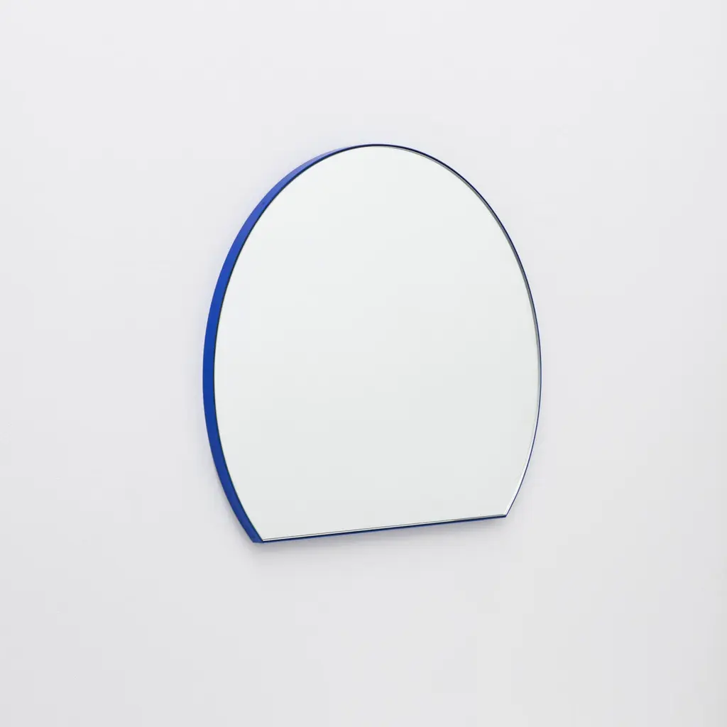 Modern Orbis Trecus™ D shaped round mirror with a minimalist powder coated aluminium blue frame. Fitted with a quality hanging system for a flexible installation in 4 different directions. Designed and handcrafted in London, UK.Our mirrors are designed with an integrated French cleat (split batten) system that ensures the mirror is securely mounted flush with the wall. An alternative hanging hook or a Z-bar (depending on the size of the mirror) is available on demand for mirrors that need to be installed allowing some separation from the wall.This mirror is fully customisable.Shipped safely and insured worldwide. All our mirrors are made on demand. Fabrication lead time for this particular mirror is approximately 4 to 5 weeks. Our mirrors are always shipped by courier express. Shipping via courier express typically requires 1 to 2 days to the UK, or 2 to 7 days outside the UK depending on the destination.Available in the following diameters and variations:Small: 40cm / 15.8"Regular: 50cm / 19.7"Medium: 60cm / 23.6"Large: 80cm / 31.5"Extra Large: 100cm / 39.4"Depth 1.8cm / 0.7" (customisable)Prices for 120cm / 47.2”, 150cm / 59”, or any bespoke diameter, are available on demand.Available options:- frame depth: 18mm / 0.71’’, 24mm / 0.94’’, and 30mm / 1.18’’- frame finish: brass (brushed, polished or with a bronze patina), copper, stainless steel, blackened metal, powder coated aluminium in a range of standard or bespoke colours- mirror tint: standard silver, black, bronze, blue, rose gold / peach- back-illumination creating a halo effect- front-illumination around the periphery of the mirror- demister pad- bevelPlease contact us for a quote for any bespoke specifications or added options.Note that all 4 directions the mirror may be installed in are illustrated in the photographs in this mirror entry. This mirror cannot be hung diagonally.ORDERS OF MULTIPLE MIRRORS OF THE SAME TYPE: Please contact us to receive a Packing and Shipping quote when ordering multiple mirrors of the same type. An order for multiple mirrors of the same type may not be accepted without extra packing and shipping fees. Thank you.
