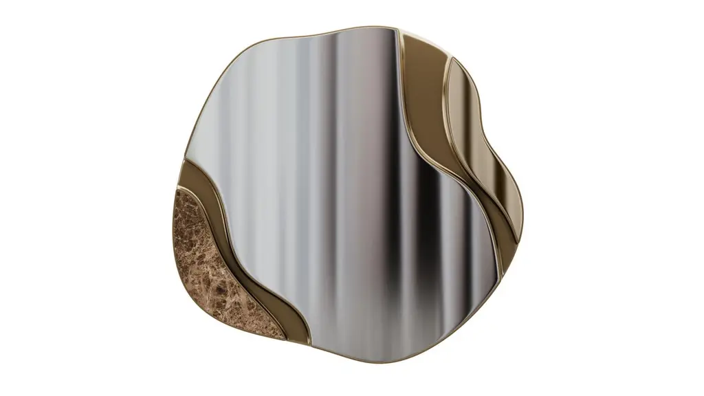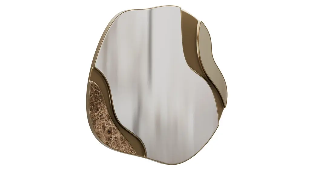 A striking mirror with organically shaped brass accents, creating a dynamic and fluid design. The frame is crafted from brushed brass, adding a modern and luxurious touch to the piece. The clear mirrored front reflects light beautifully, while marble de tails accentuate the frame, adding texture and depth. Details in Emperador marble are also present on this beautiful piece.