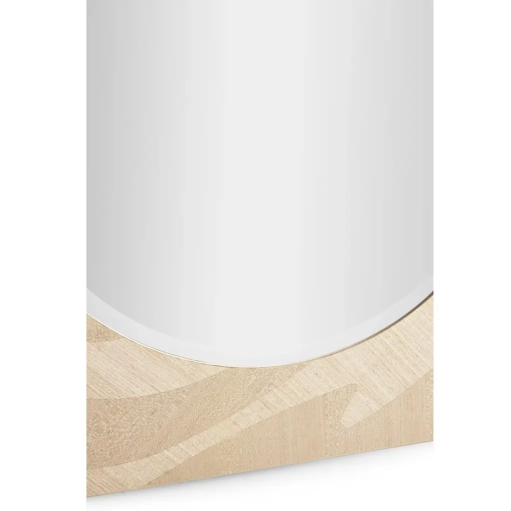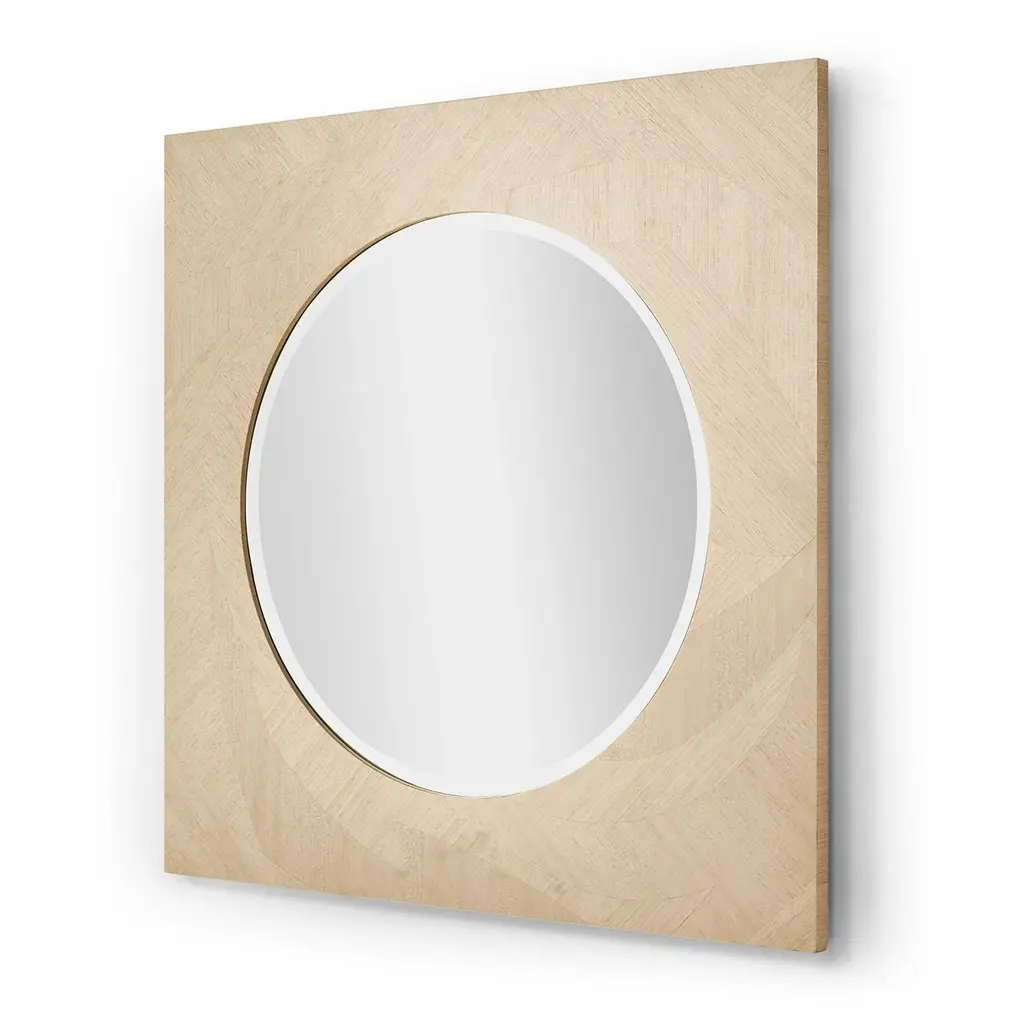 The natural grain and rich tones of the Koto veneer add depth and warmth, making this mirror a statement piece that enhances any luxurious space. The mirror features a solid sycamore wood frame. The interplay of light and texture creates a dynamic visual experience, drawing the eye and elevating the ambiance of any room. Whether placed in a grand entryway, a sophisticated living space, or a serene bedroom retreat, this mirror seamlessly complements modern and transitional interiors alike. Dimensions: 36.5" W x 1.375" D x 36.5" H