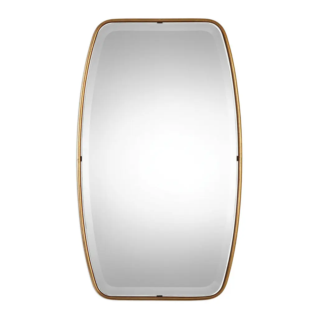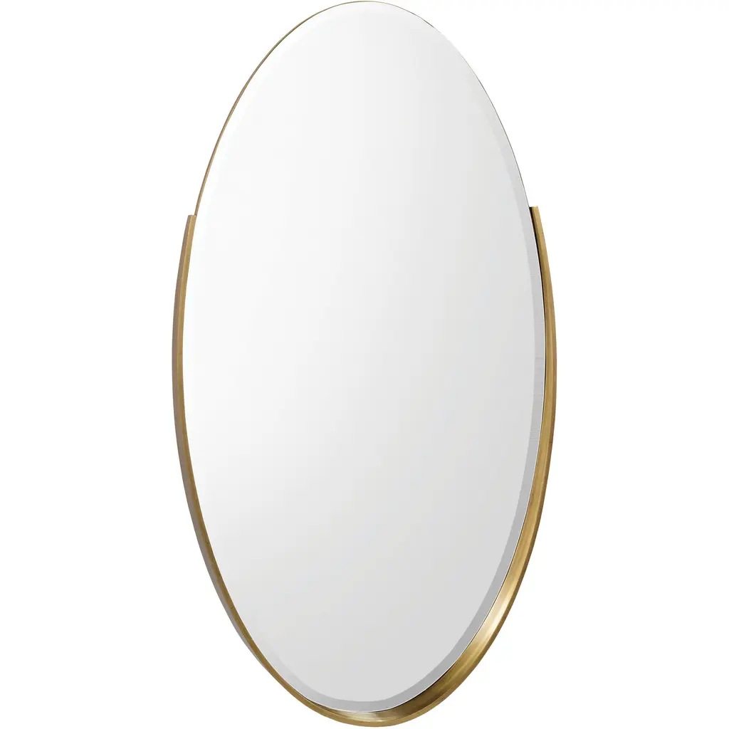 34"W X 60"H X 4"D This oval mirror features a tapering frame and a single piece of modern beveled mirror. The frame is finished in Etruscan gold. This mirror hangs in portrait orientation only with a French cleat that is provided.