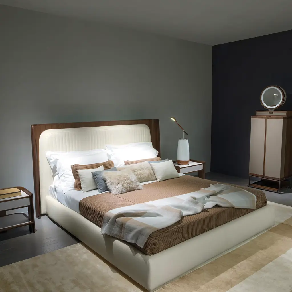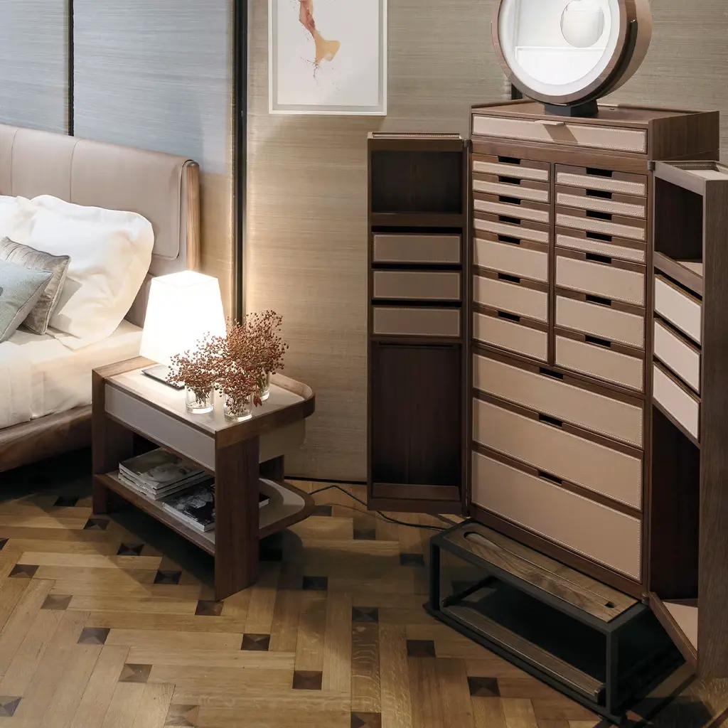 This exceptional cabinet is handcrafted of first-rate materials rendered in refined and exclusive shapes. Made of Canaletto walnut enriched with leather inserts, it features a series of drawers of three different dimensions, covered with two doors. The piece is completed with a round adjustable mirror, and bronze-lacquered metal details. Please inquire with the Concierge for further information.