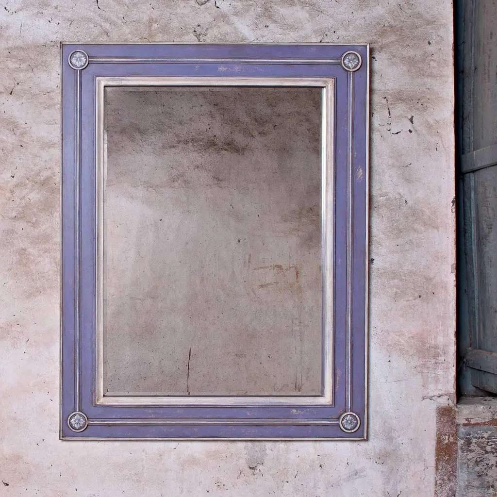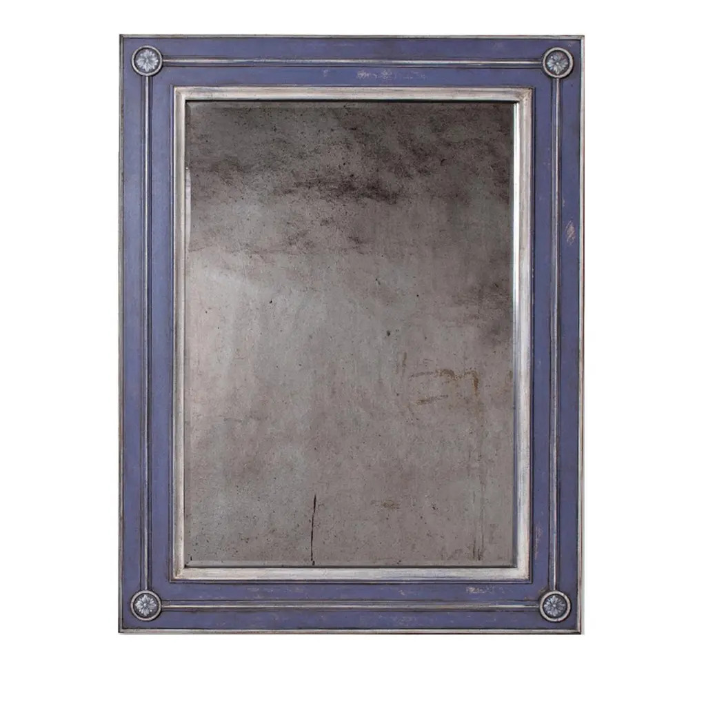 Handcrafted of wood and hand painted with an antiqued finish to enhance its 18th century Venetian style inspiration, this simple yet elegant design will complement any decor, brightening both a classic and modern interior. A carved inner frame accented at the corners with a delicate flower inside a circle stands out on the eye-catching cerulean color. Available with standard and antiqued mirror (shown), the size and color of this piece are fully customizable as per customer's request. Ask the Concierge for pricing in the selected option.