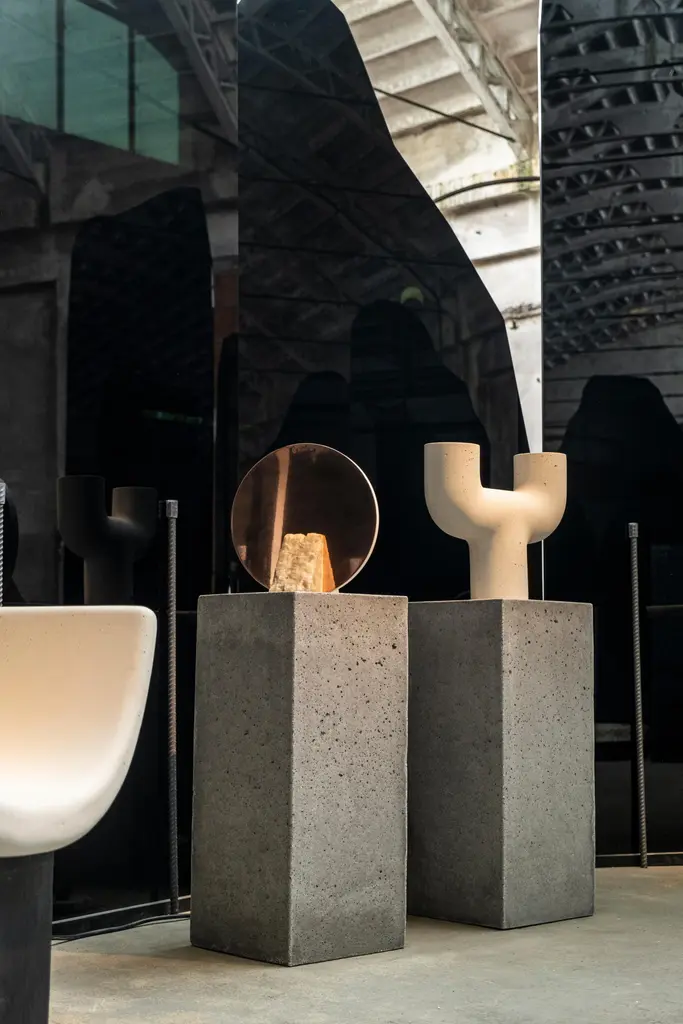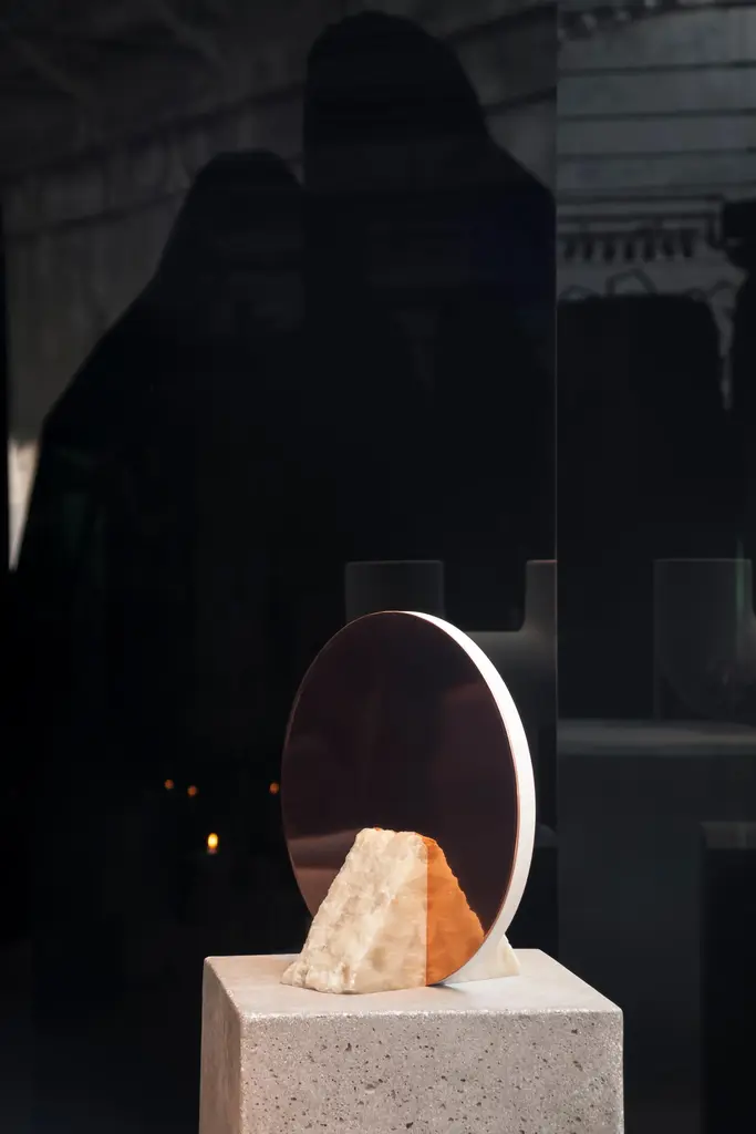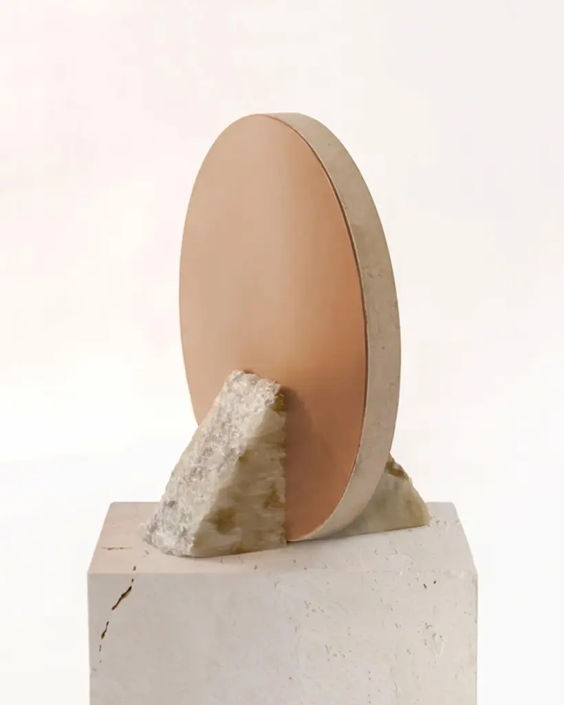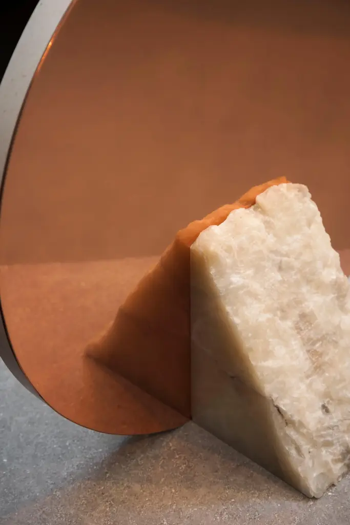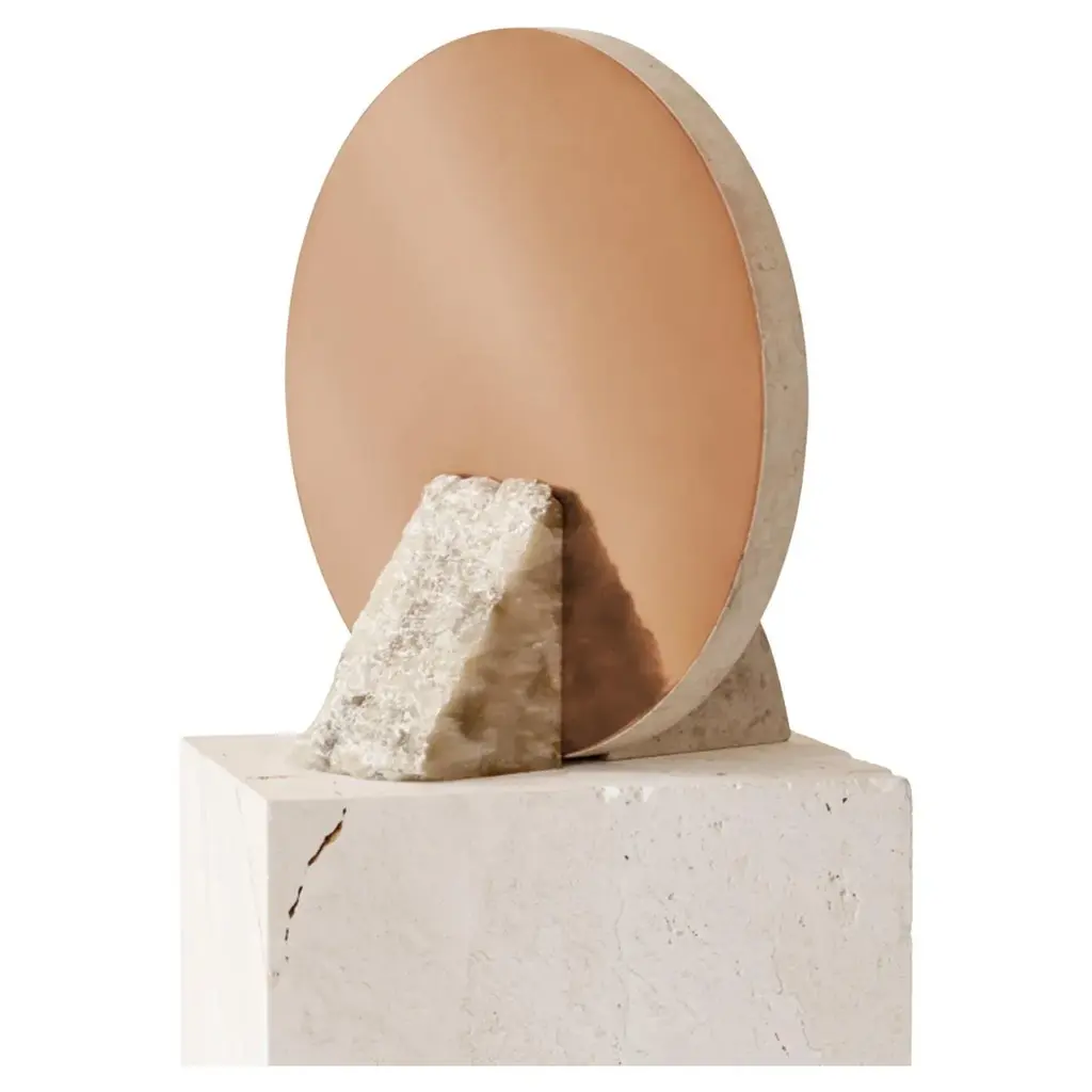 Ossi Mori mirror by Studiopepe Dimensions: W 36 x D 22 x H 36 cm Materials: Onyx, copper, limestone. Multifaceted design agency Studiopepe was founded in Milan in 2006. Eclectic, voguish, it is the brainchild of Chiara di Pinto and Arianna Lelli Mami, both of whom obtained their degrees in Industrial Design at the Milan Polytechnic University. Driven by their own distinctive multi-dimensional vision that arose from their studies in Interior and Industrial design, their studio work encompasses art direction, styling, interior, and product design, with an integral vein of storytelling that connects everything together. Drawing inspiration from the unexpected, their contemporarily classic designs are characterised by their equally minimalist and eclectic nature, uniting poetic vision and rigorous design.