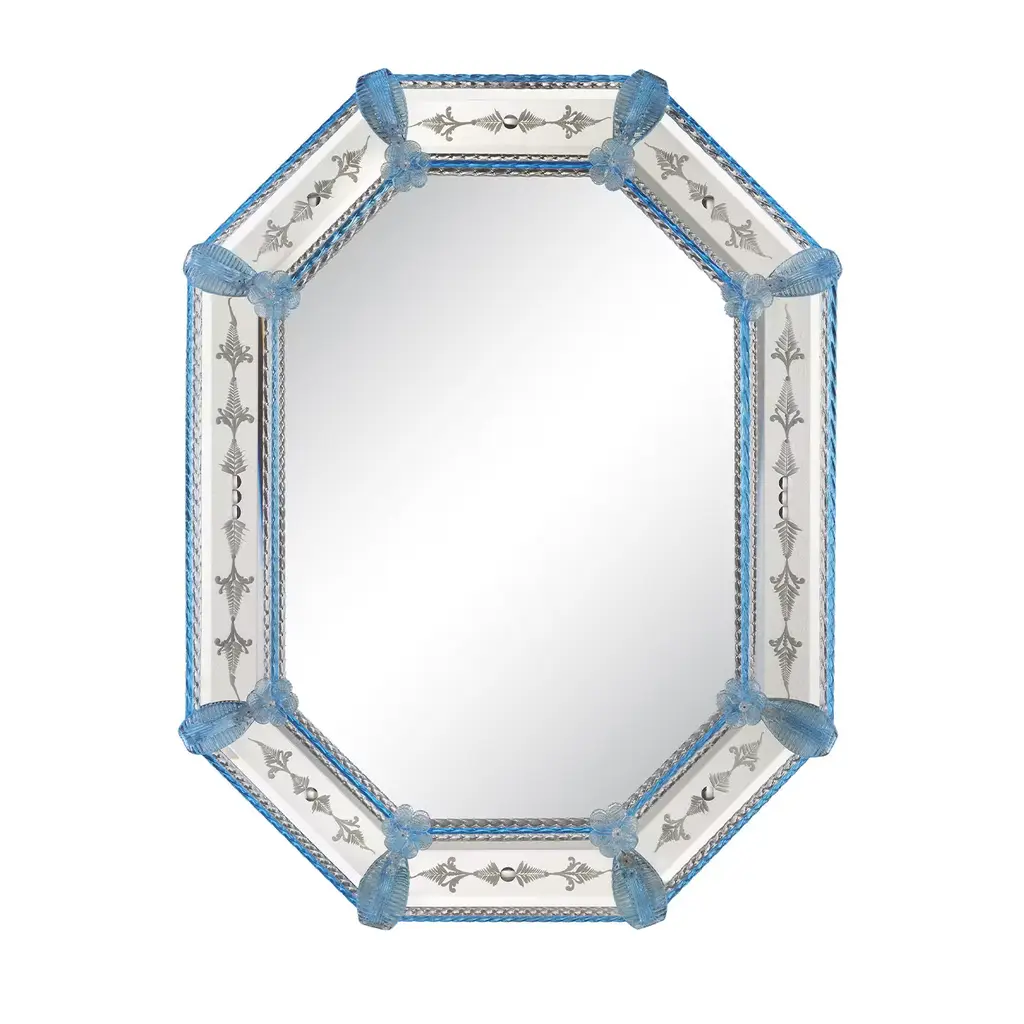 Original octagonal Venetian mirror made in the strictest Murano tradition, with rich antique bands carefully engraved by hand. All assembled with crystal / blue elements handmade in the Murano furnaces. Wooden frame with a natural finish. Please ask Concierge for details.