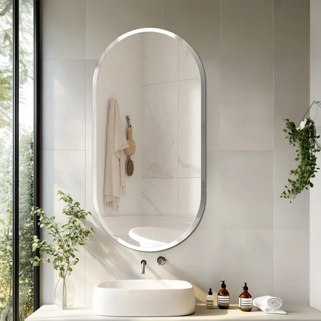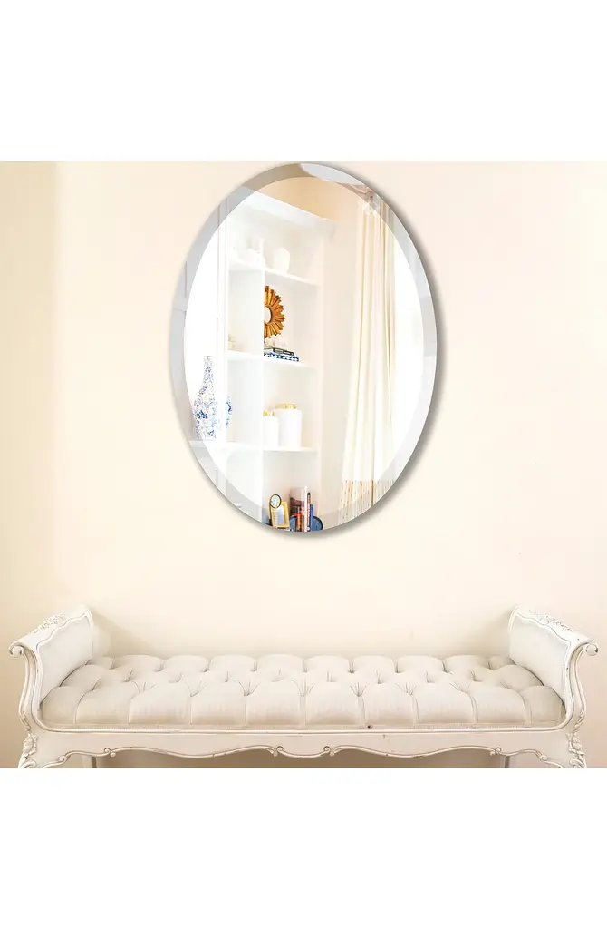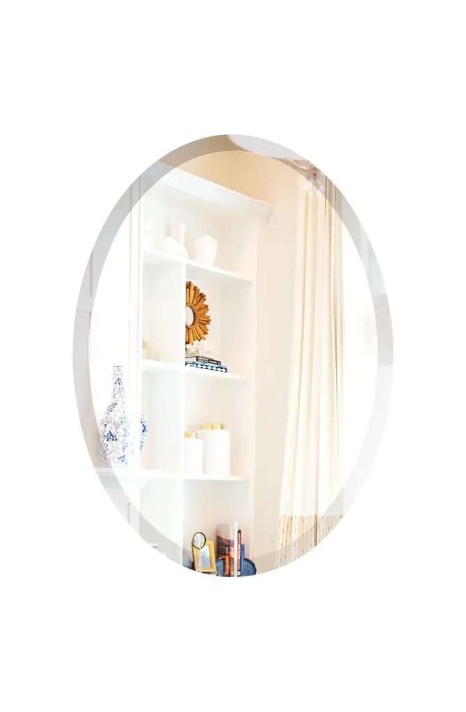 Oval mirrors can serve as a focal point in a formal rooms or in modern-style bathrooms. Add a sense of elegant class to areas with limited wall space Oval Beveled Mirrors. These are ideal for entryways and small areas. OVALCREST Oval mirrors are Gallery Quality and come in 9 sizes to fit almost any design. OVALCREST Gallery Quality frameless beveled mirrors feature a 1 inch bevel and polished edges.