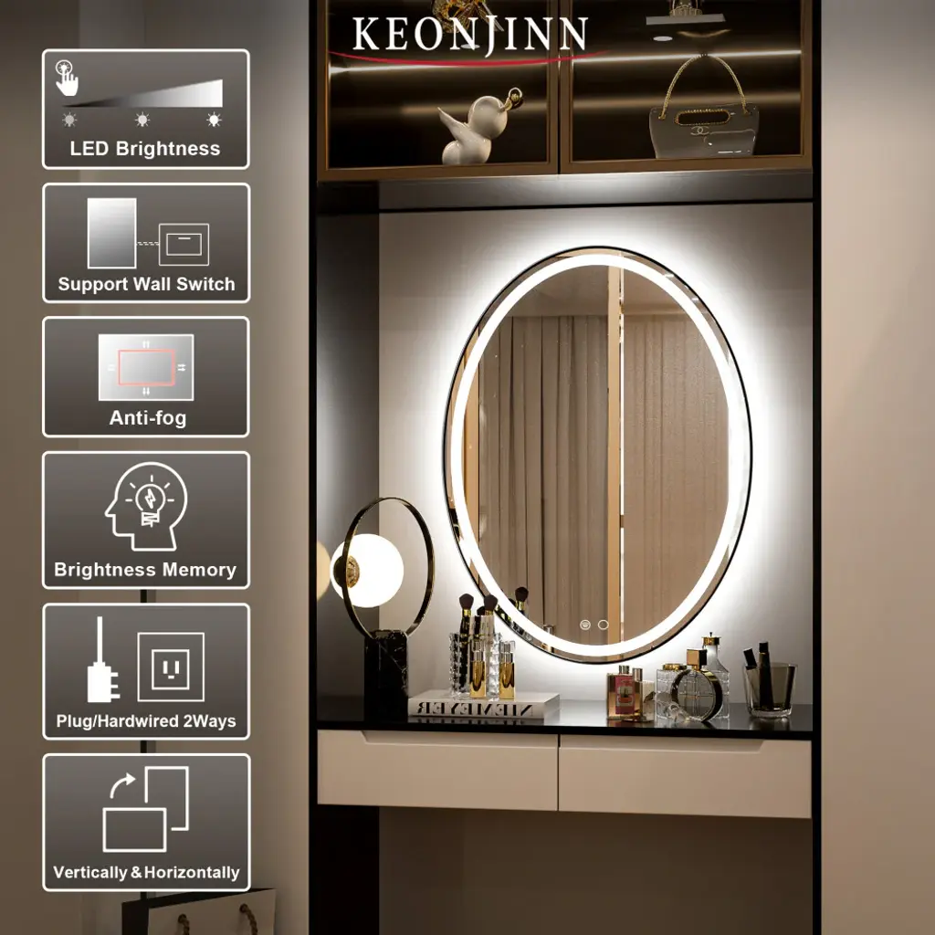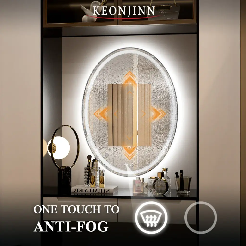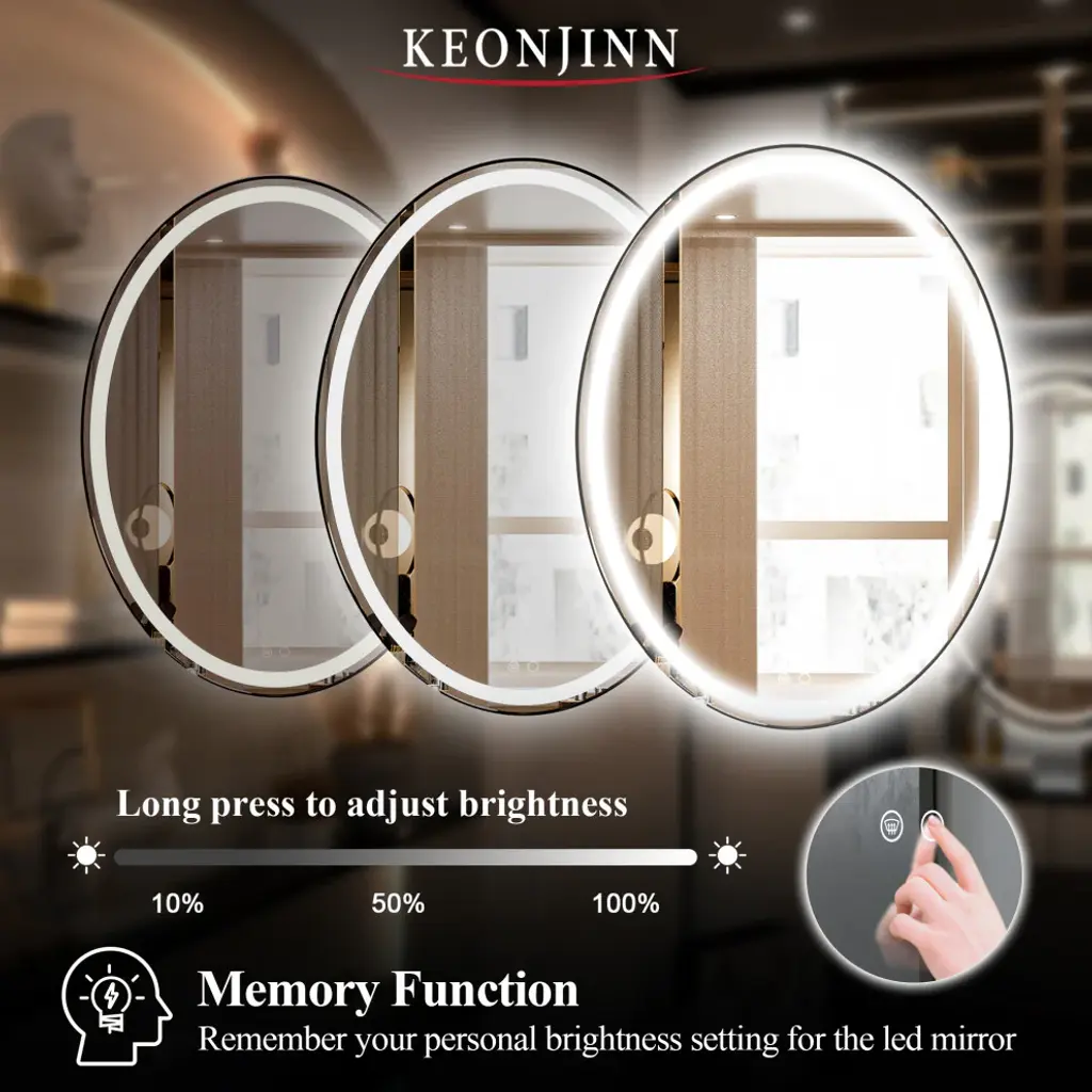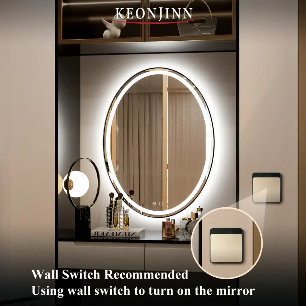 [Dimmable Led Mirror]: This oval bathroom mirror light is dimmable, controlled with power switch. Simply touch the power switch button for 3 seconds to change light intensity from normal to brightest.[Wall Switch Control]: Both buttons have the memory function. The next time the oval lighted mirror is turned on, it will remain the same as the last time it was turned off. It is recommend to use wall switch to control the mirror light and defogger ON/OFF so as to save energy.[Safe Defogging]: Automatically shut off after one hour. No need to worry about the mirror overheating. The power switch and anti-fog switch are separate control, anti-fog according to need to open and close, safe and energy-saving. The built-in anti-fog function means no need to constantly treat your mirrors with fog free spray, or rinse them multiple times per shower.