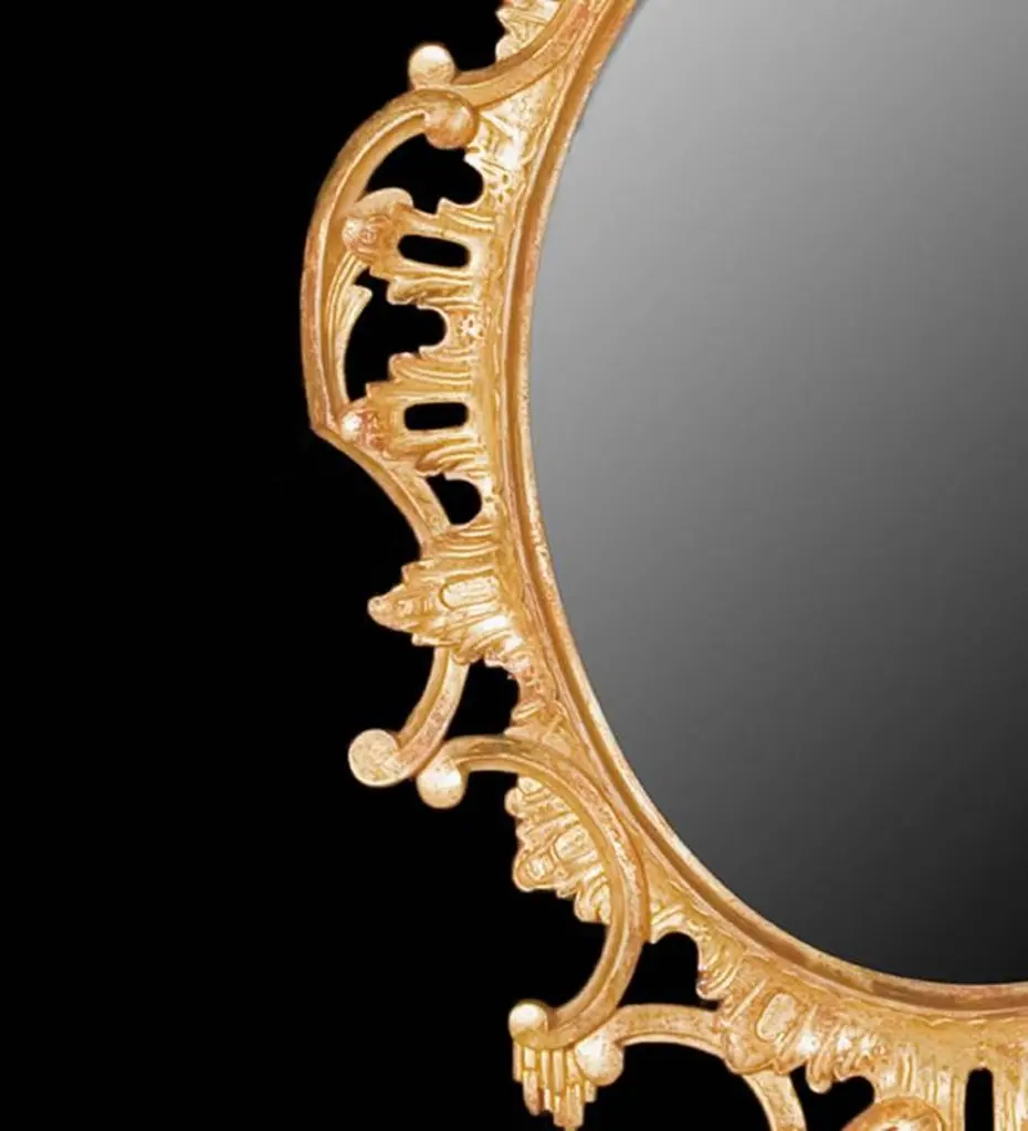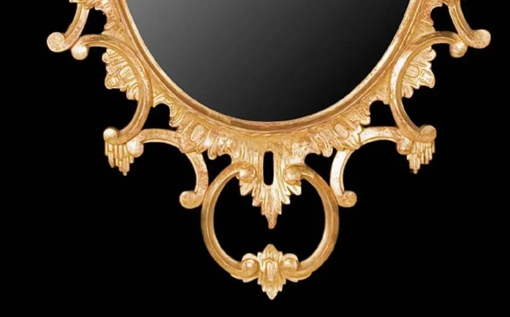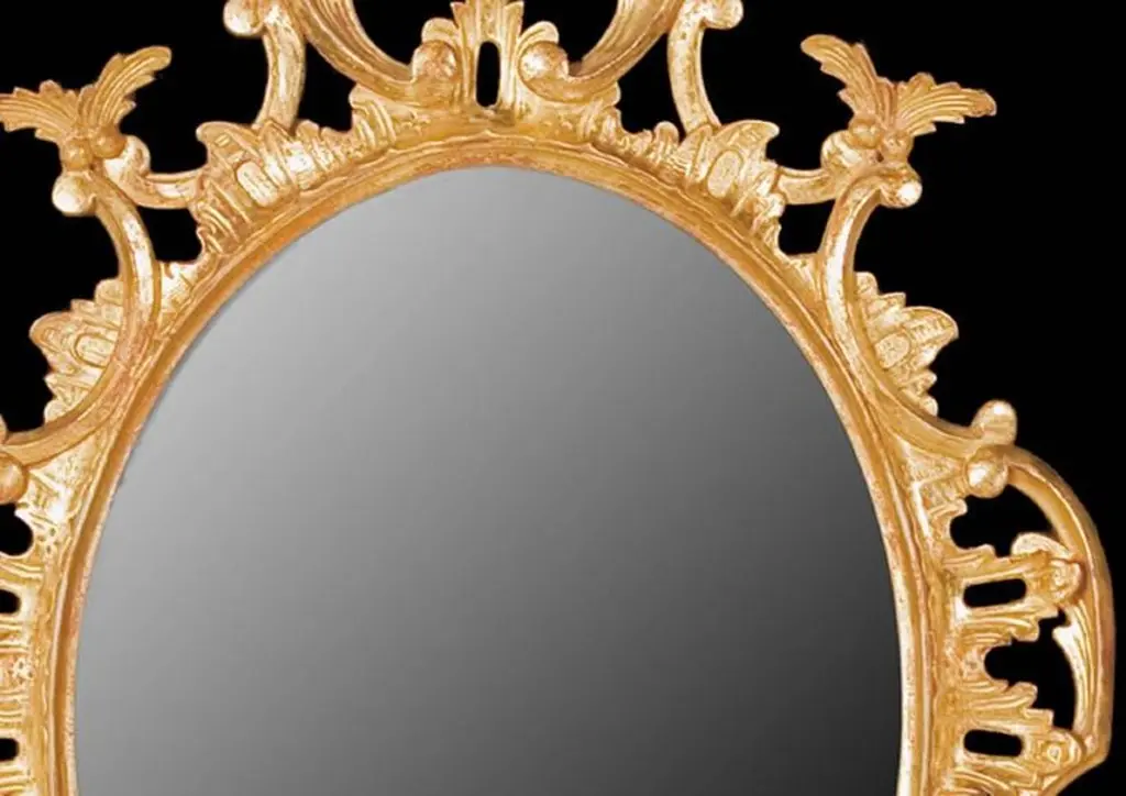 An oval carved giltwood looking glass mirror in the manner of George III. The moulded frame is carved with leaves carefully worked with C-scrolls both in front and behind the leaves. The double scrolled cresting supports an acanthus leaf spray.We are currently working to a 30-36 week lead time.