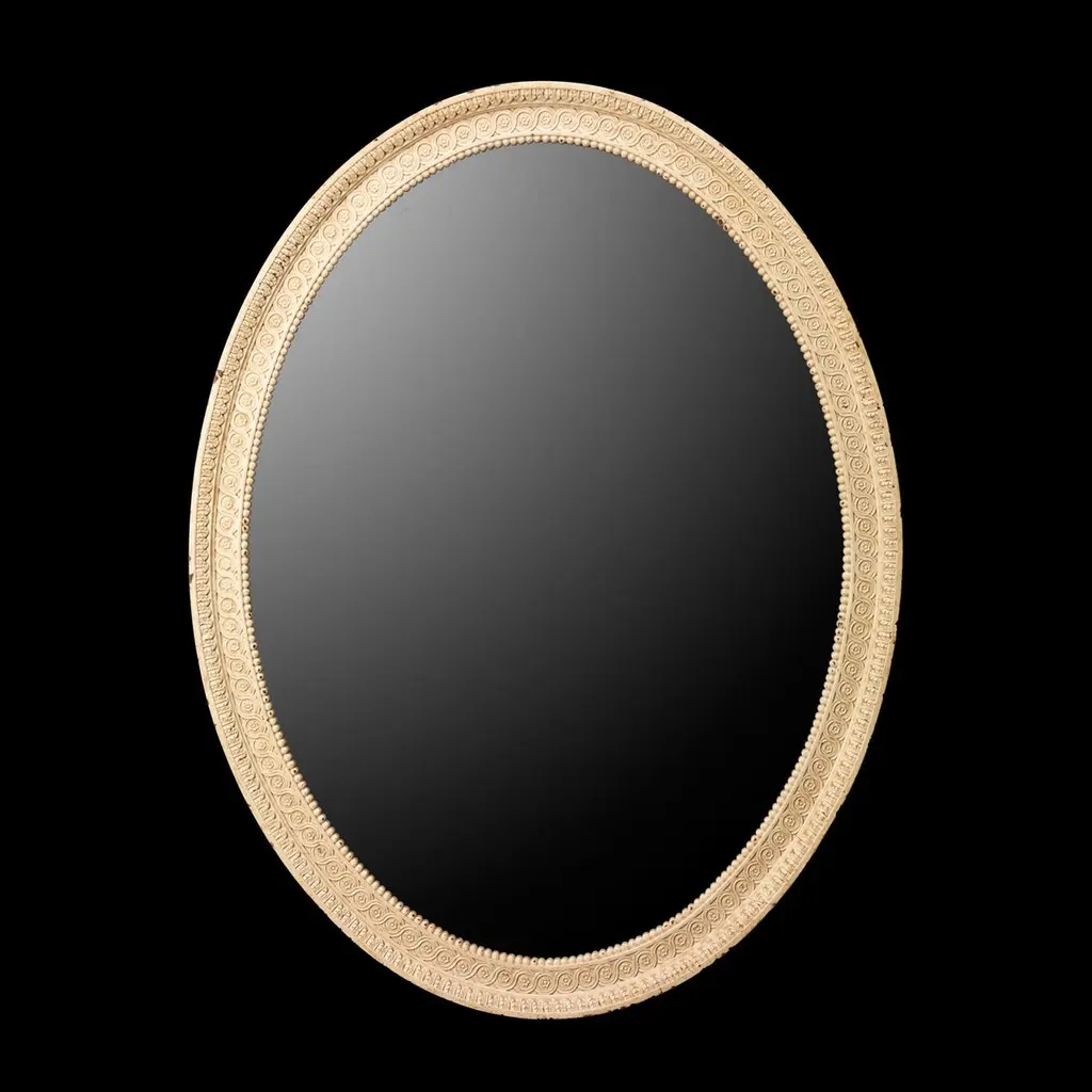 A large carved oval, giltwood mirror in the style of George III and the late 18th century. The moulded frame is enriched with carved guilloche decoration, flanked by an inner bead moulding and an outer waterleaf, all within a square moulded edge.We are currently working to a 30-36 week lead time.