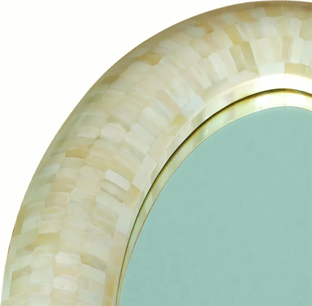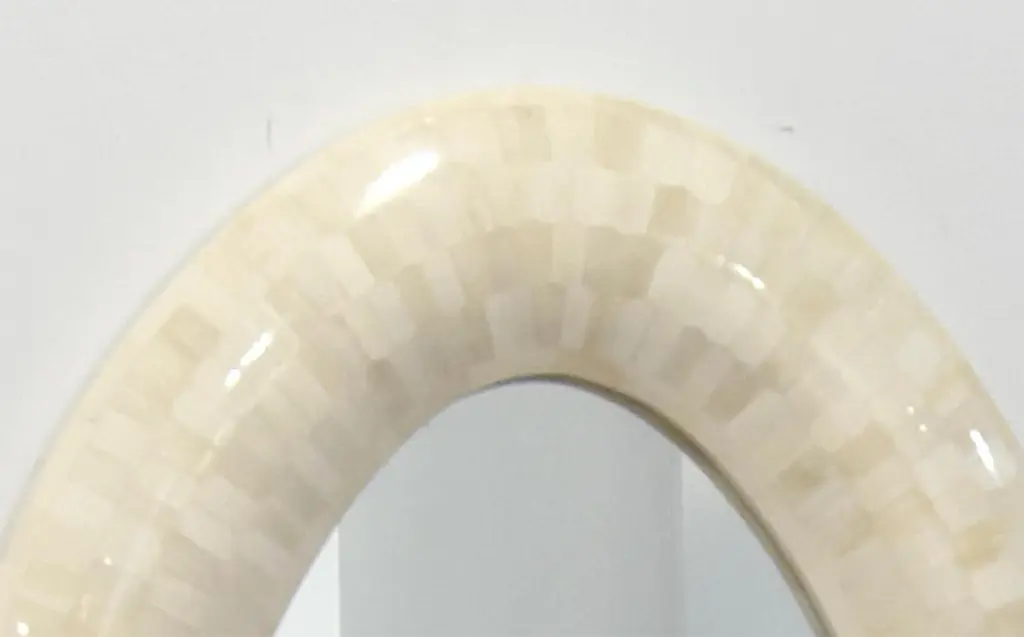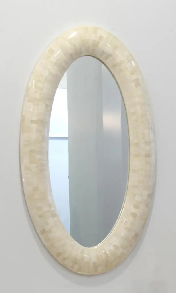 Made of solid wood and topped with camel bone chips, this mirror frame adds a calming magnificence to any space. Each chip is hand carved in small hexagons to align with the convex wood frame. It includes a high shine mirror.Also available in horn and custom sizes.Size: 21" width x 36" height x 2" depthSize: 53.34 cm width x 91.44 cm height x 5.08 cm depth.