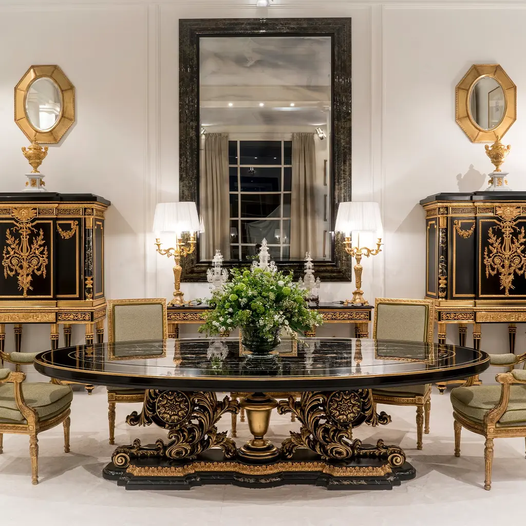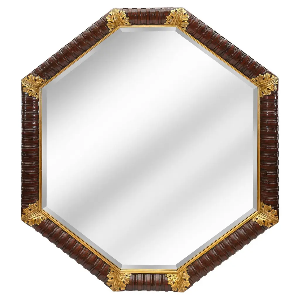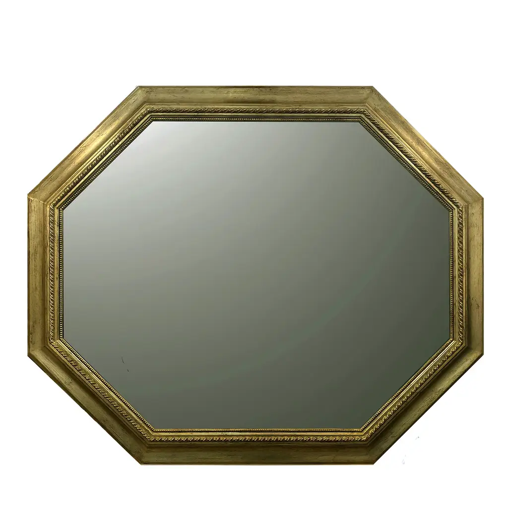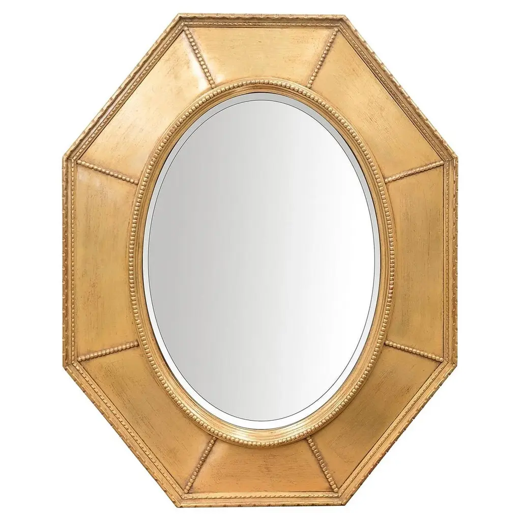 An authentic statement of luxury with a functional role, this mirror will ideally complement classic decors or accent contemporary ones with a dash of eclecticism. The oval body in mirrored glass is encased in a bold octagonal frame crafted of lime wood and minutely carved to obtain its characteristic textured motifs of beads. The final application of antiqued gold leaf seals its opulent character.