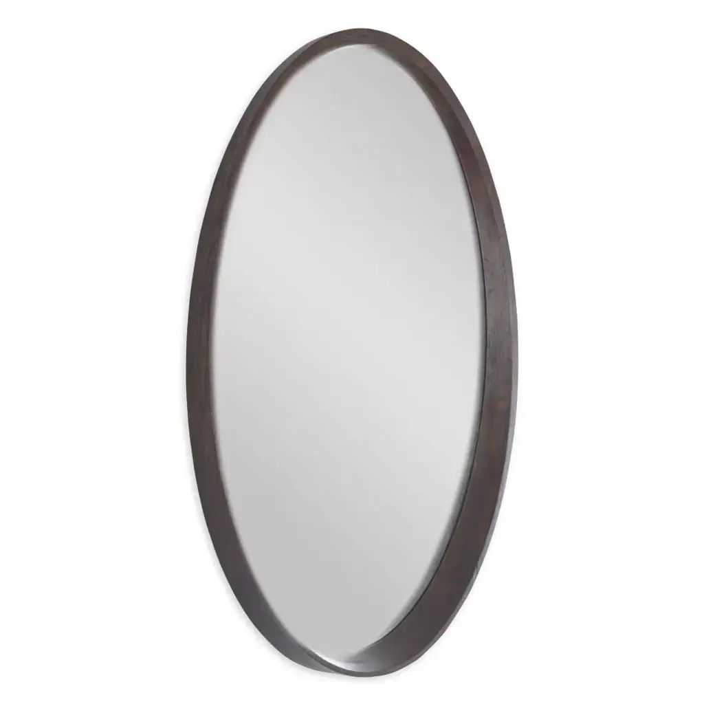 An oval shaped mirror frame crafted from solid Mindi. The unusual frame tapers from thin to thick as the frame moves lower. Clear mirror. Walnut finish. Includes a metal cleat for easy installation. Hangs vertically.