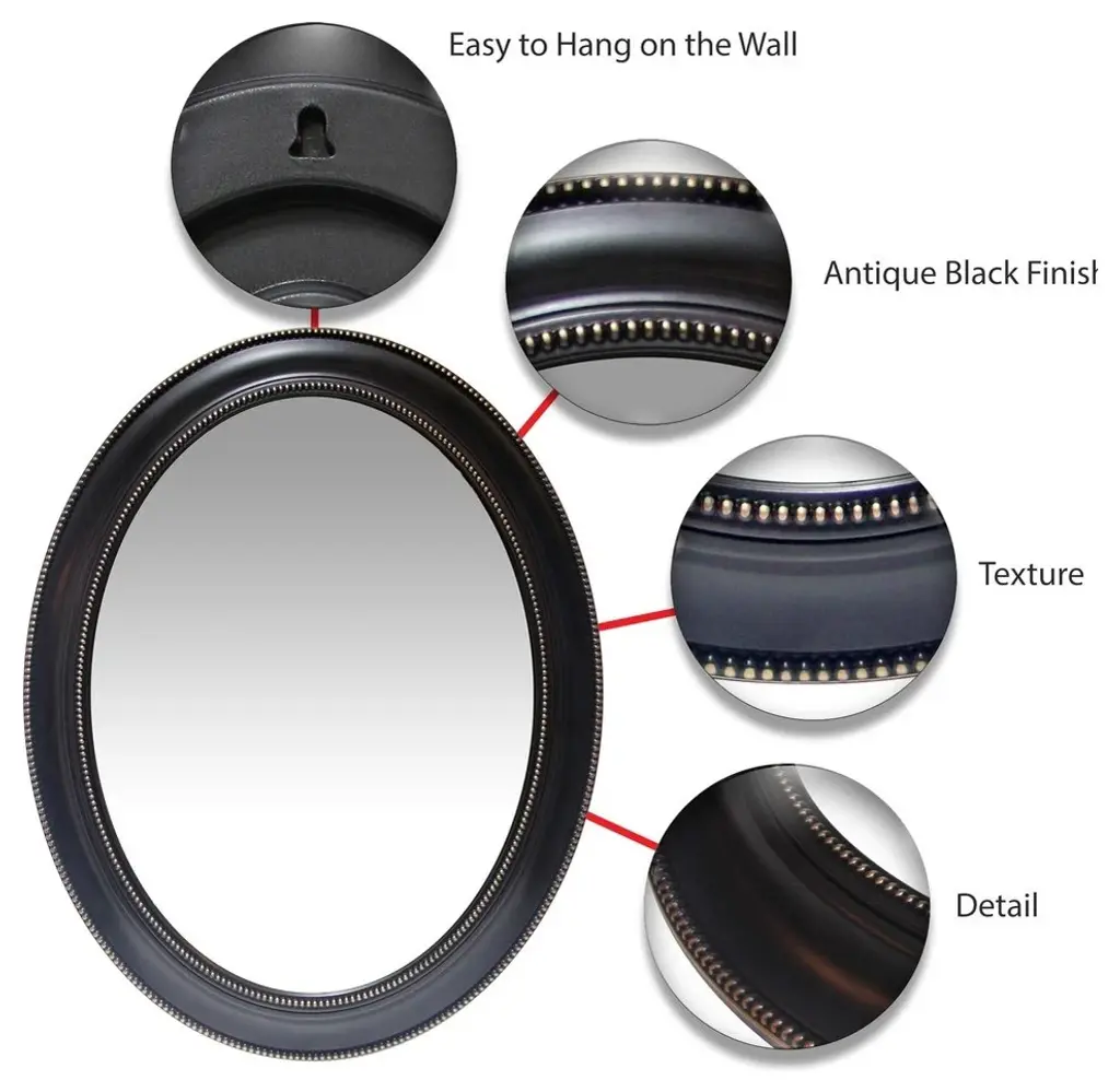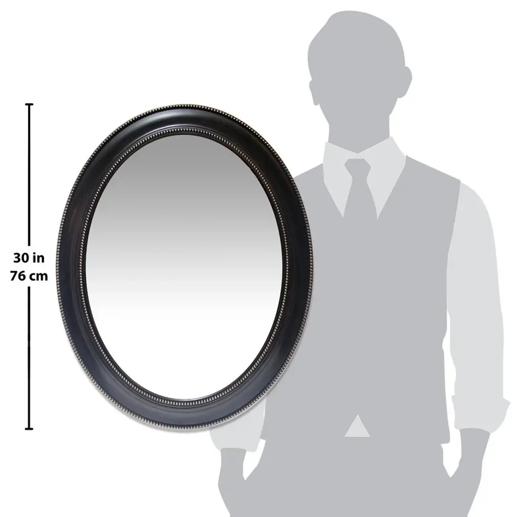 Equipped with a frame that has been molded out of resin to feature a beaded border inspired by vintage designs and then clad with an antique finish, this 30 oval wall mirror fuses modern elegance with traditionalism like never before. Fitted with a large oval mirrored inset, this piece also performs by producing an optical illusion of bigger space. The details are subtle yet stylish, the shape is classically chic and the durability of the mirror is unmatched. Oval mirrors are typically displayed in foyers, entryways, mudrooms, dressing rooms or vanities, but you can hang this one virtually anywhere indoors.