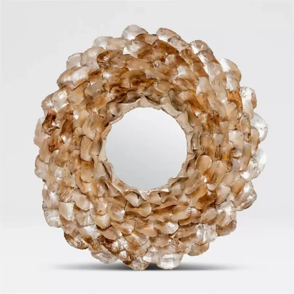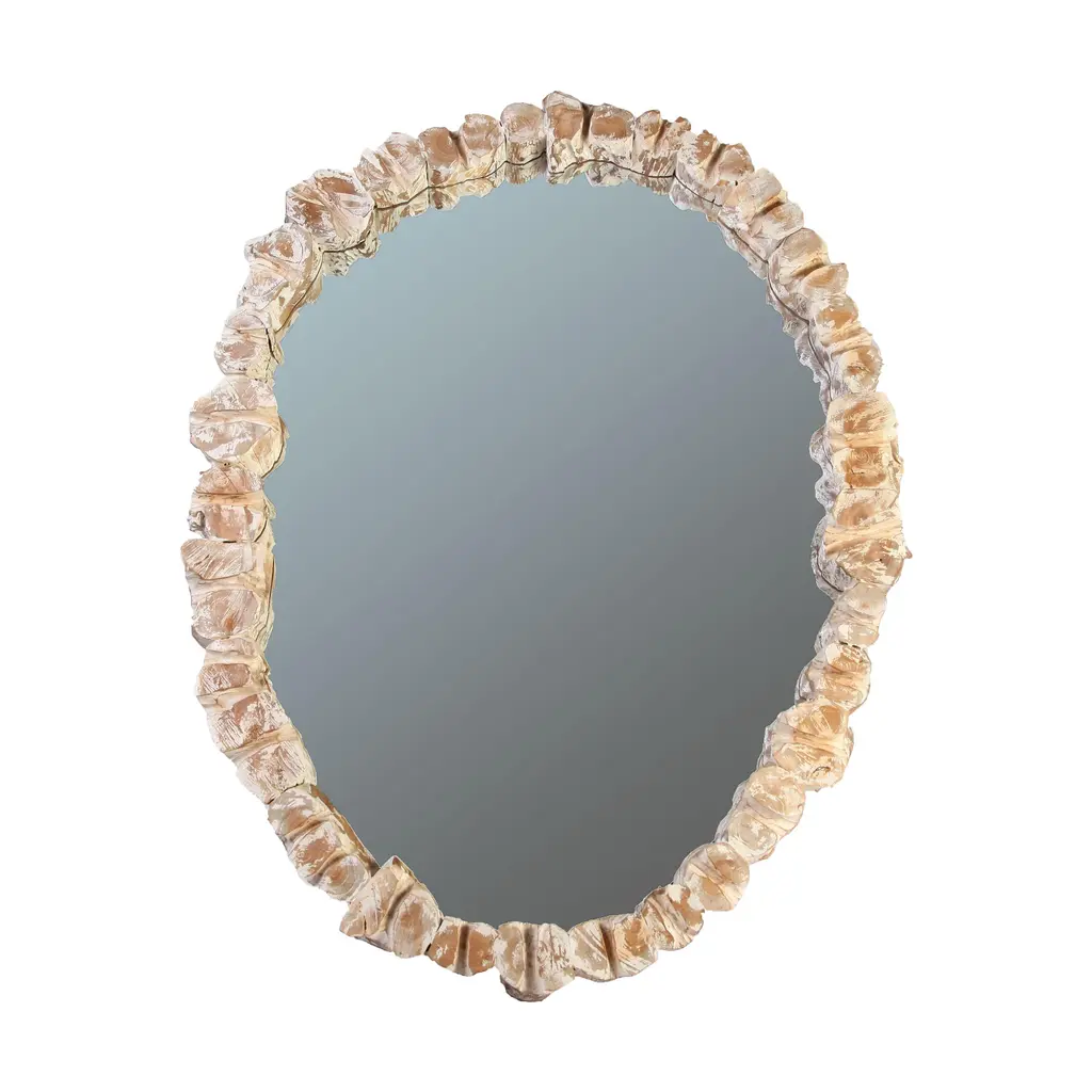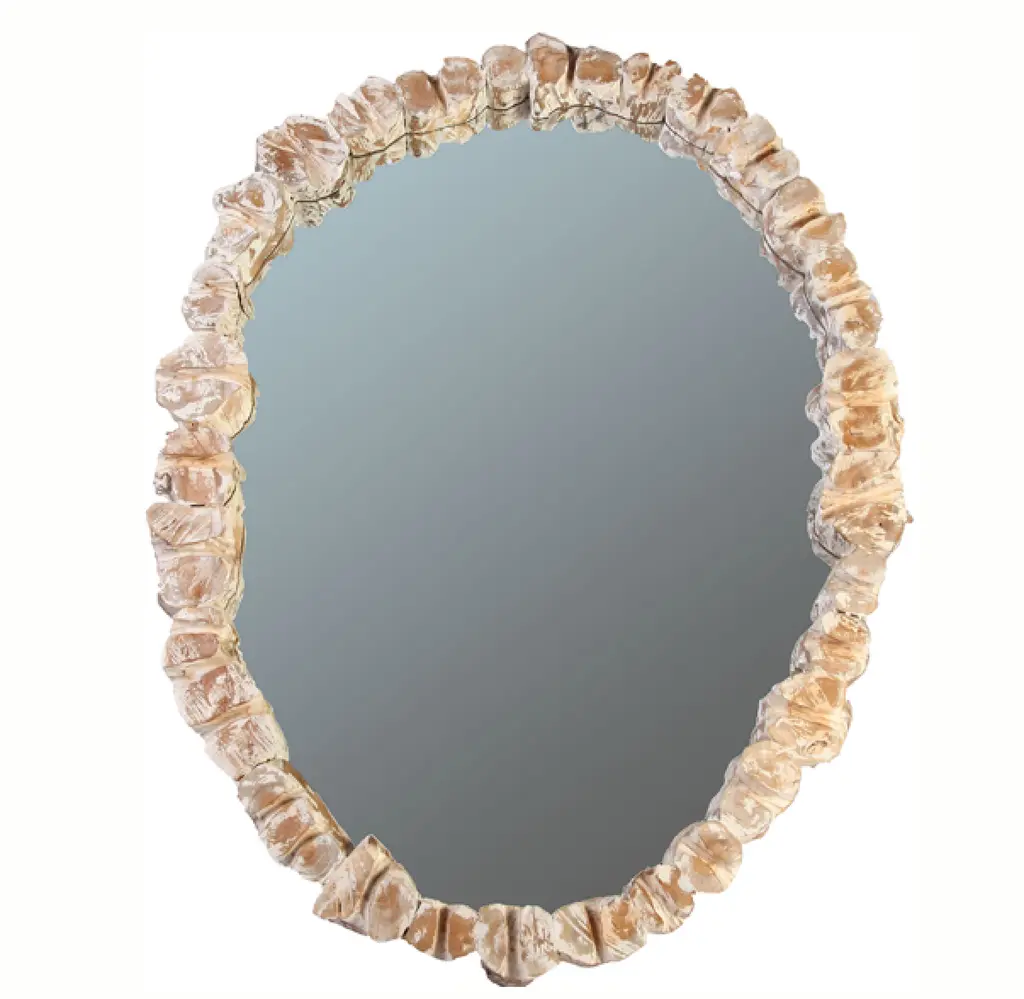 A modern wall mirror with a organic teak block frame. The handmade organic teak blocks frame brings out beauty of natural wood elements and adds drama and unique characters to this mirror. A piece of function art, it will make an impressive living room, entry, hallway mirror. Feature: Hand-made. Each has its natural variances and wood imperfection Item No.: Dimension: 38"W, 6"D, 48"H Material: Teak frame