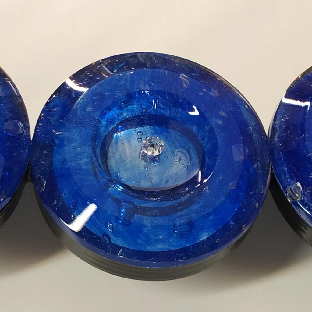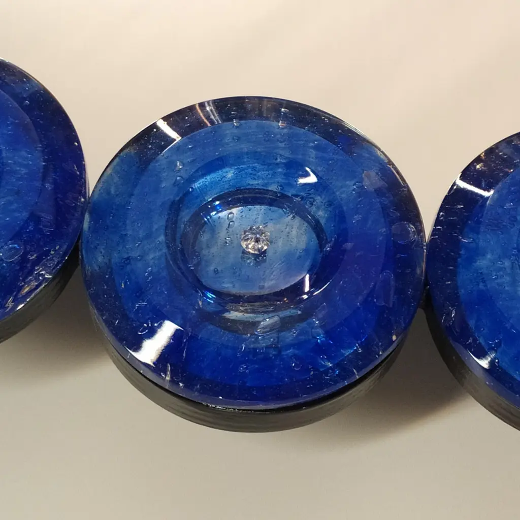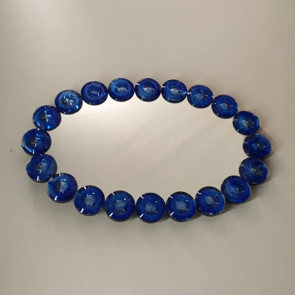 "Ovale Blu'"Specchio in vetro di Murano in stile Contemporaneo della serie "Dischi".La cornice è composta da 20 dischi in vetro massiccio di colore blu', bisellati, durante la produzione del disco in vetreria, viene inserita dell'aria all'interno per creare un effetto di tante piccole bolle imperfette,tutto lavorato a mano. Ogni blocco di questa cornice viene poi argentato a mano con argento puro per donare una brillantezza unica, tutto realizzato artigianalmente nell'isola di Murano, altro esempio di specchio contemporaneo realizzato dai Fratelli Tosi, azienda che da anni produce specchi di tutti gli stili nell' Isola di Murano, ancora oggi seguendo le tecniche vetrarie dei nostri antenati.Lo specchio è personalizzabile nelle misure e nei colori con la possibilità di essere appeso sia in verticale che in orizzontale.