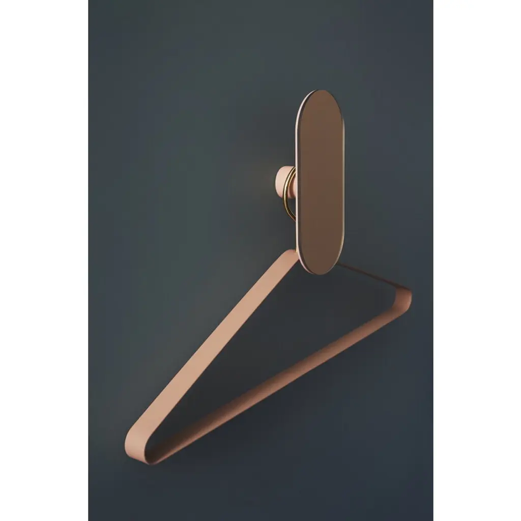 AYTM's Ovali wall hook provides an exceptionally elegant setting for clothes and accessories. The front of the wall hook is covered by an oval-shaped, rose-toned mirror, which elegantly hides the upper part of a clothes hanger. The Ovali hook charms on the hallway or bedroom wall both individually and in groups of several mirror hooks.