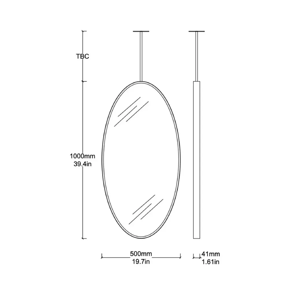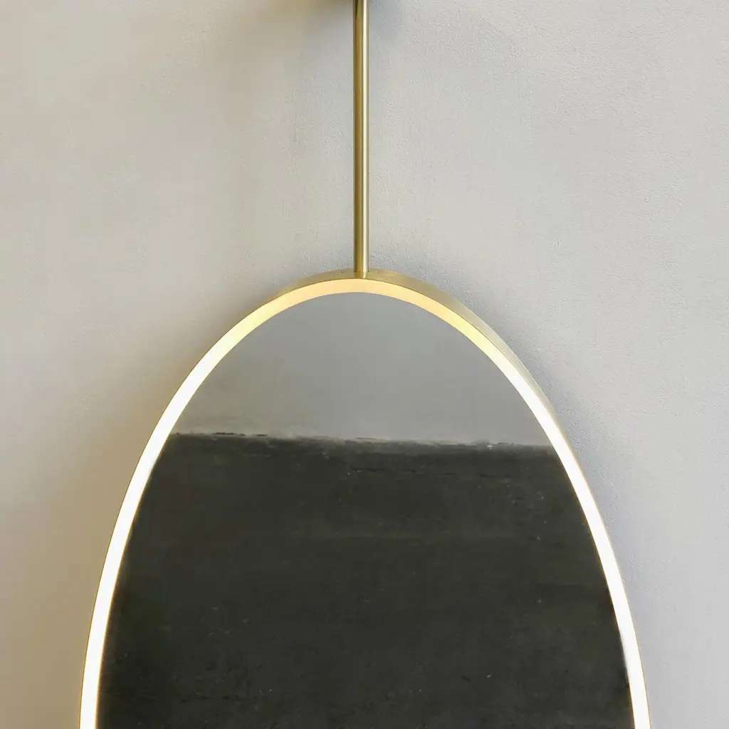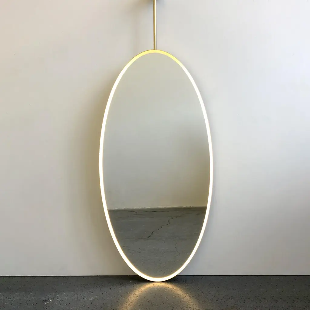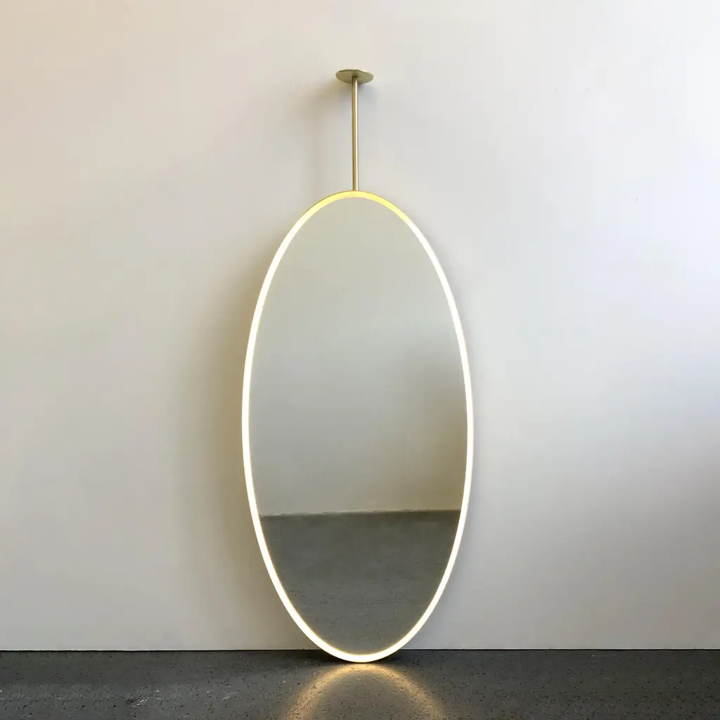 Modern ceiling suspended Ovalis™ oval shaped mirror with an elegant brushed brass frame and front illumination on one side and white powder coated panel backing. Our unique collections of ceiling suspended mirrors are designed and handcrafted in London, UK, and are therefore fully customisable to suit the specific requirements of your interior.Mirror dimensions: 100cm (39.4") High x 50cm (19.7") Wide x 4.1cm (1.61") Deep Mirror is illustrated with a drop of 26cm (10.2") but is fully customisable. Please contact our team for information.The high quality finish of our suspended mirrors extends to their backings, which are made from a powder coated panel available in black or white. Backings can also be upgraded to a finish that matches the frame or can be substituted by a second mirror, making your mirror double sided.The ceiling plate is supplied with a cover hiding the screws to complete the minimalist design of the mirror.Shipped safely and insured worldwide. All our mirrors are made on demand. Fabrication lead time for this mirror is approximately 6 to 7 weeks. Our mirrors are always shipped by courier express. Shipping via courier express typically requires 1 to 2 days to the UK, or 2 to 7 days outside the UK depending on the destination.Available options:•double sided mirror•backing in a finish that matches the frame•frame finishes: brass (brushed, polished or with a bronze patina), copper, stainless steel, blackened metal, powder coated aluminium in a range of standard or bespoke colours•full frame that extends to the front of the mirror•mirror tints: standard silver, black, bronze, blue, rose gold / peach•back-illumination creating a halo effect•front-illumination around the periphery of the mirror•ON/OFF sensor switch•demister pad•bevelA presentation illustrating the options above is also available on demand. Please contact us for a quote for any bespoke specification or added options.IMPORTANT NOTES:-This suspended mirror is intended to be mounted onto the ceiling and cannot be installed onto a countertop. Countertop mounted mirrors are available on demand.-The illumination offered with our mirrors is decorative or intended to create mood lighting in the room that they are installed in.-Prices on the website do not include taxes and / or applicable import duties for deliveries outside the United Kingdom.ORDERS OF MULTIPLE MIRRORS OF THE SAME TYPE: Please contact us to receive a Packing and Shipping quote when ordering multiple mirrors of the same type. An order for multiple mirrors of the same type may not be accepted without extra packing and shipping fees. Thank you.