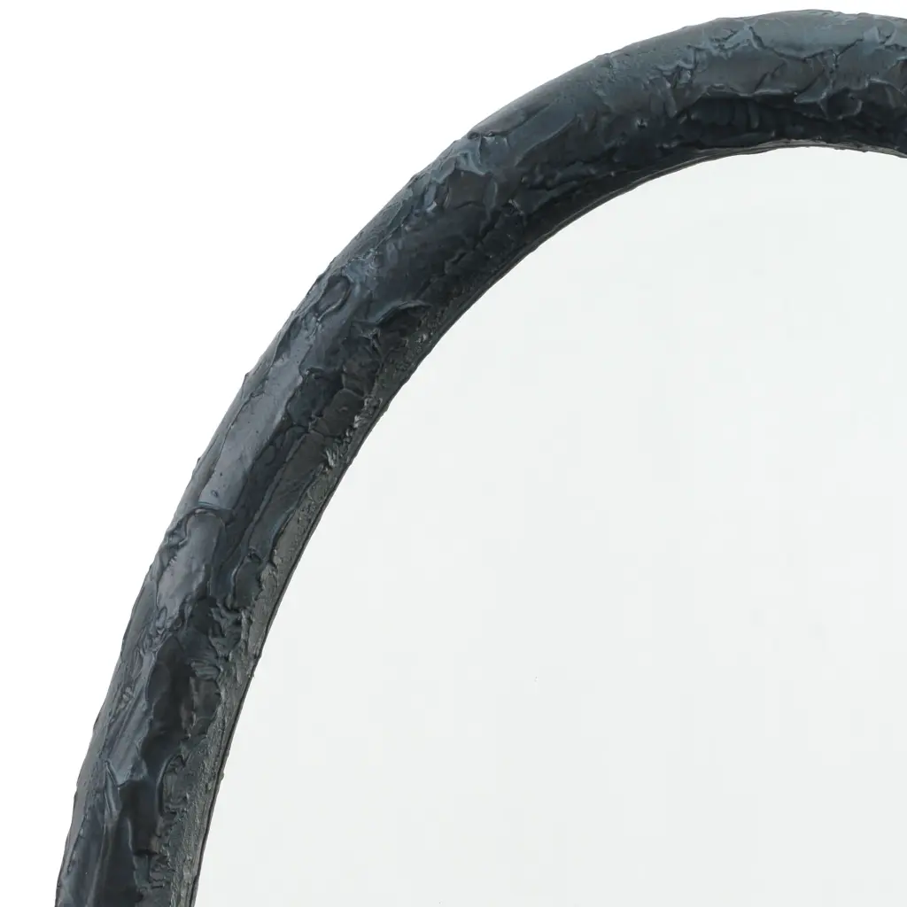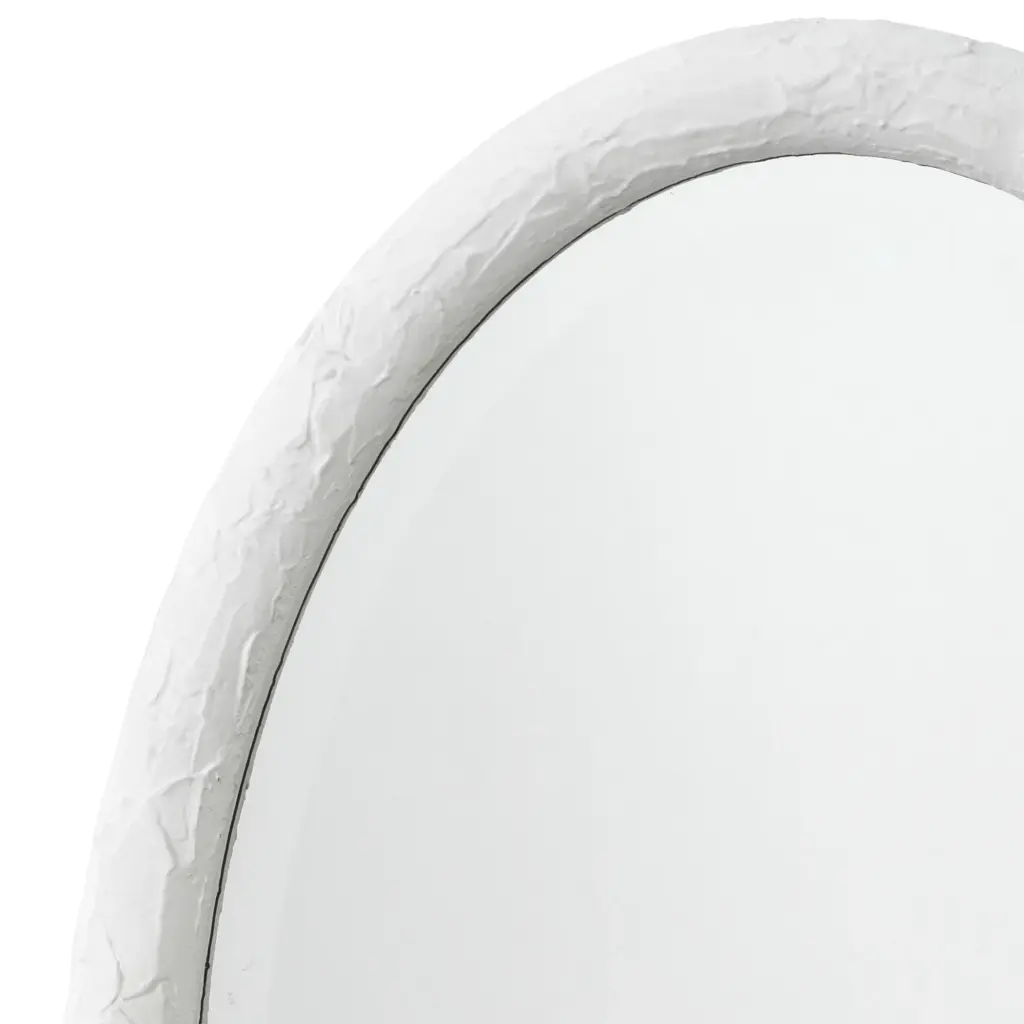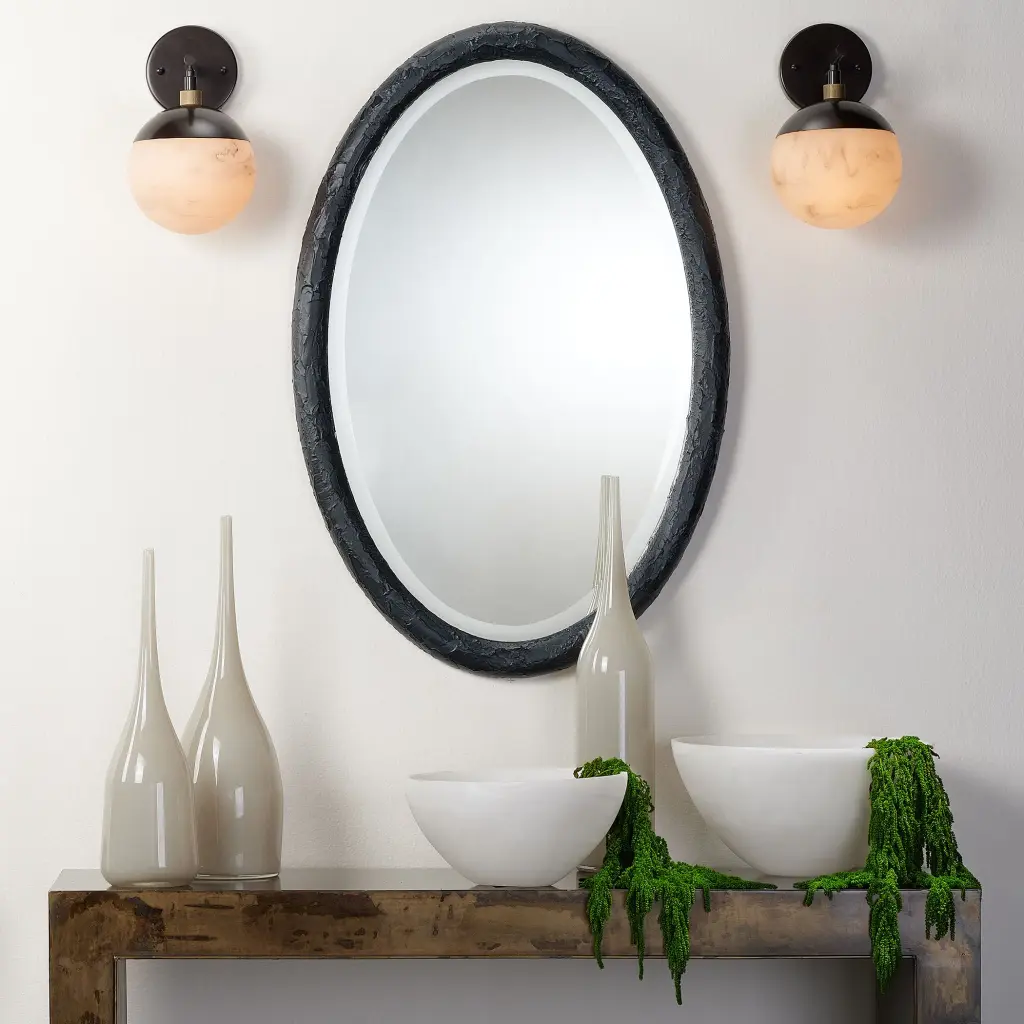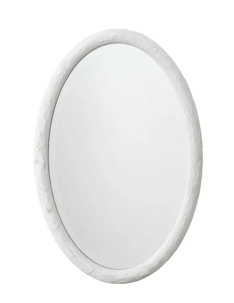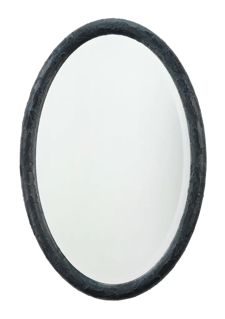 This simple oval wall mirror is enlivened with a richly textured resin frame. The organic patterns created add just the right touch of intrigue keeping the look simple and sleek, and yet still elevated. The Ovation is available in charcoal or white. Each beveled mirror measures three by two feet and can be hung horizontally or vertically to suit your décor.