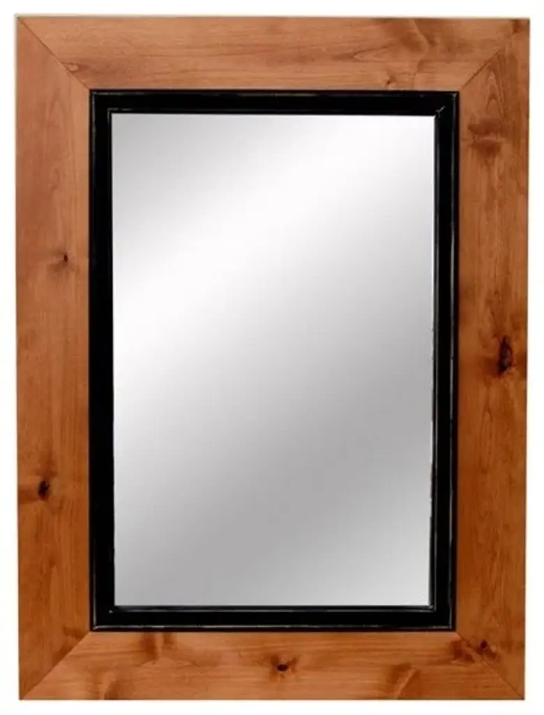 Overmantle Mirror - Two Tone Wood Framed Mirrors, 18x22 inches finished --- Part of the Uintah Series, this overmantle mirror with two-toned wood frame has a beautifully stained cherry outer molding and narrow black inner molding with hand-distressing. Finished mirror measures 18x22 inches and can hang horizontally or vertically. This unique mirror will look great in your cabin or lodge, in your formal bedroom, or will match your wood mantle perfectly. A great addition to rooms with mixed woods. Please browse our collection of wood framed mirrors here. Product Specifications: Overmantle Mirror Two-toned wood framed mirror, 4.25 inch wide cherry-stained molding with 1.5 inch black inset molding 5-inch wide frame Hangs horizontally or vertically. D-ring hanging hardware is includedNatural imperfections may occur in this product.