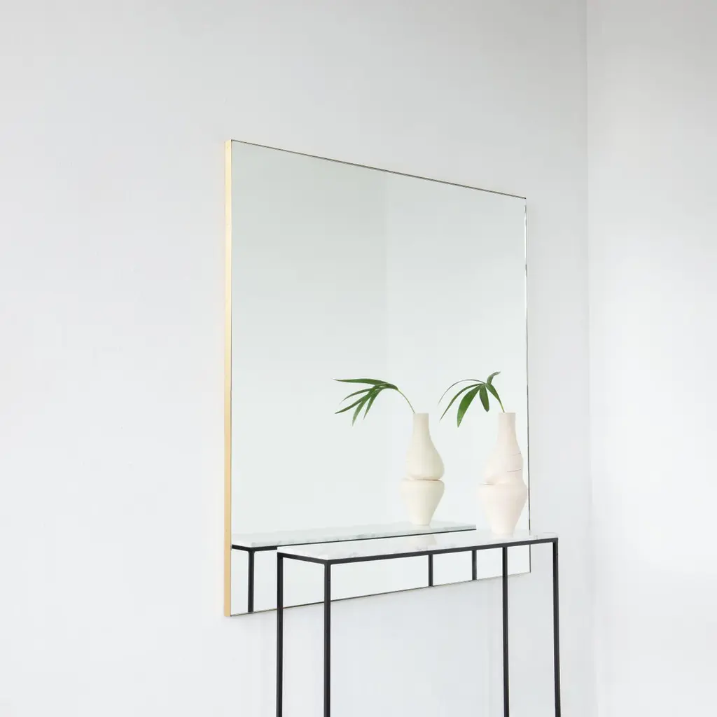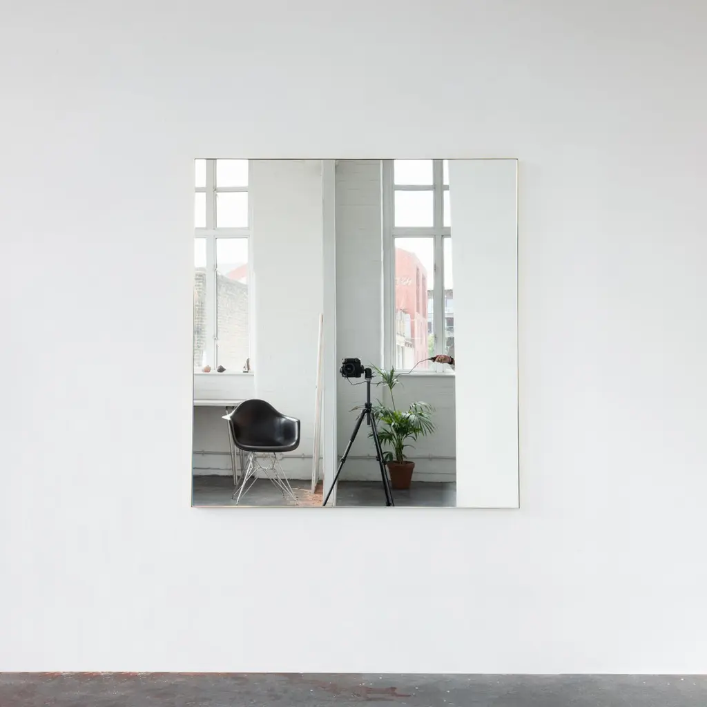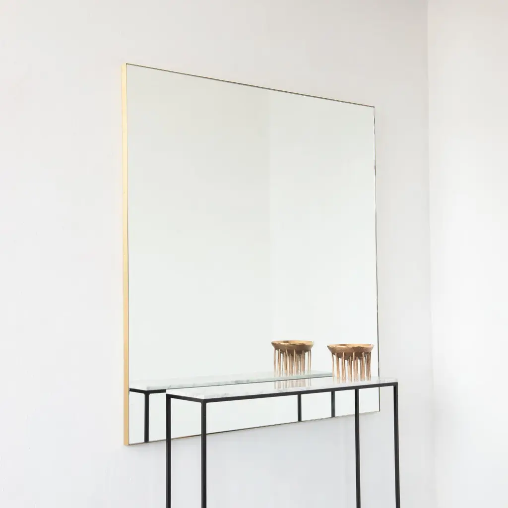 Modern Quadris™ oversized rectangular mirror with an elegant solid brushed brass frame and square corners. Part of the charming Quadris™ collection, designed and handcrafted in London, UK. The detailing and finish, including visible brass screws, highlight the craft and quality feel of the mirror.Mirror dimensions: 120 cm x 128 cm x 3 cm / 47.24 in x 50.39 in x 1.18 inDesigned with an integrated French cleat (split batten) system that ensures the mirror is securely mounted flush with the wall.All our mirrors are made on demand. Fabrication lead time for this particular mirror is approximately 4 to 5 weeks. Shipped via courier express typically requires 1 to 2 days to the UK, or 2 to 7 days outside the UK depending on the destination.Available options:- frame finishes: brass (brushed, polished or with a bronze patina), copper, stainless steel, blackened metal, powder coated aluminium in a range of standard or bespoke colours- mirror tints: standard silver, black, bronze, blue, rose gold / peach- back-illumination creating a halo effect- front-illumination around the periphery of the mirror- demister pad-bevelORDERS OF MULTIPLE MIRRORS OF THE SAME TYPE: Please contact us to receive a Packing and Shipping quote when ordering multiple mirrors of the same type. An order for multiple mirrors of the same type may not be accepted without extra packing and shipping fees. Thank you.Location image credits: Vigo Jansons for Covet Noir. The mirror appearing in the interior picture has a bespoke Neska bronze patina frame finish.