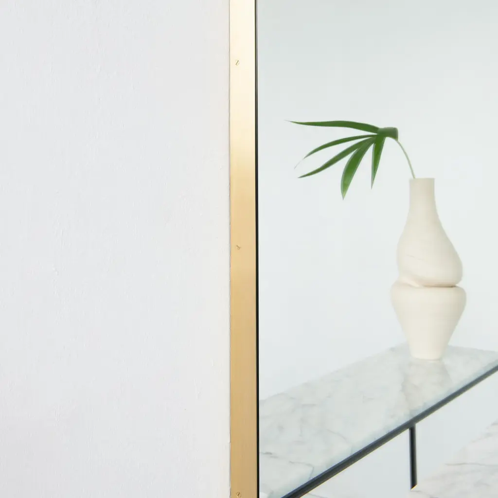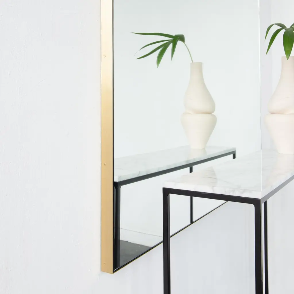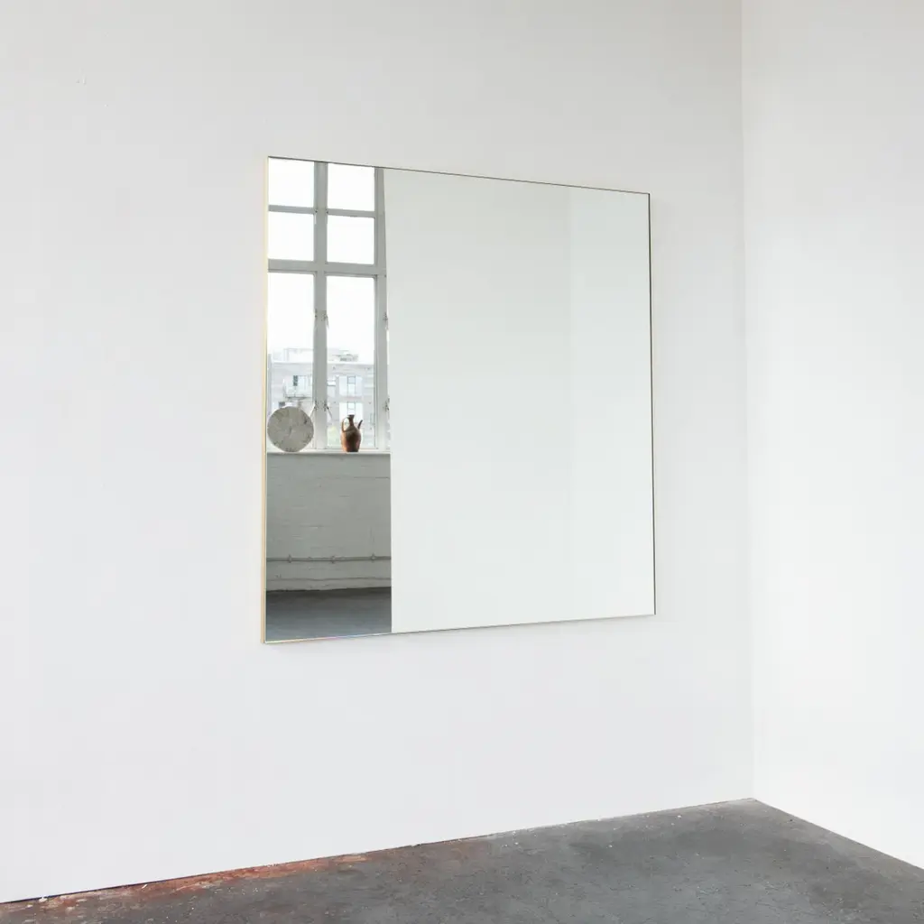 Modern Quadris™ oversized rectangular mirror with an elegant solid brushed brass frame and square corners. Part of the charming Quadris™ collection, designed and handcrafted in London, UK. The detailing and finish, including visible brass screws, highlight the craft and quality feel of the mirror.Mirror dimensions: 120 cm x 128 cm x 3 cm / 47.24 in x 50.39 in x 1.18 inDesigned with an integrated French cleat (split batten) system that ensures the mirror is securely mounted flush with the wall.All our mirrors are made on demand. Fabrication lead time for this particular mirror is approximately 4 to 5 weeks. Shipped via courier express typically requires 1 to 2 days to the UK, or 2 to 7 days outside the UK depending on the destination.Available options:- frame finishes: brass (brushed, polished or with a bronze patina), copper, stainless steel, blackened metal, powder coated aluminium in a range of standard or bespoke colours- mirror tints: standard silver, black, bronze, blue, rose gold / peach- back-illumination creating a halo effect- front-illumination around the periphery of the mirror- demister pad-bevelORDERS OF MULTIPLE MIRRORS OF THE SAME TYPE: Please contact us to receive a Packing and Shipping quote when ordering multiple mirrors of the same type. An order for multiple mirrors of the same type may not be accepted without extra packing and shipping fees. Thank you.Location image credits: Vigo Jansons for Covet Noir. The mirror appearing in the interior picture has a bespoke Neska bronze patina frame finish.
