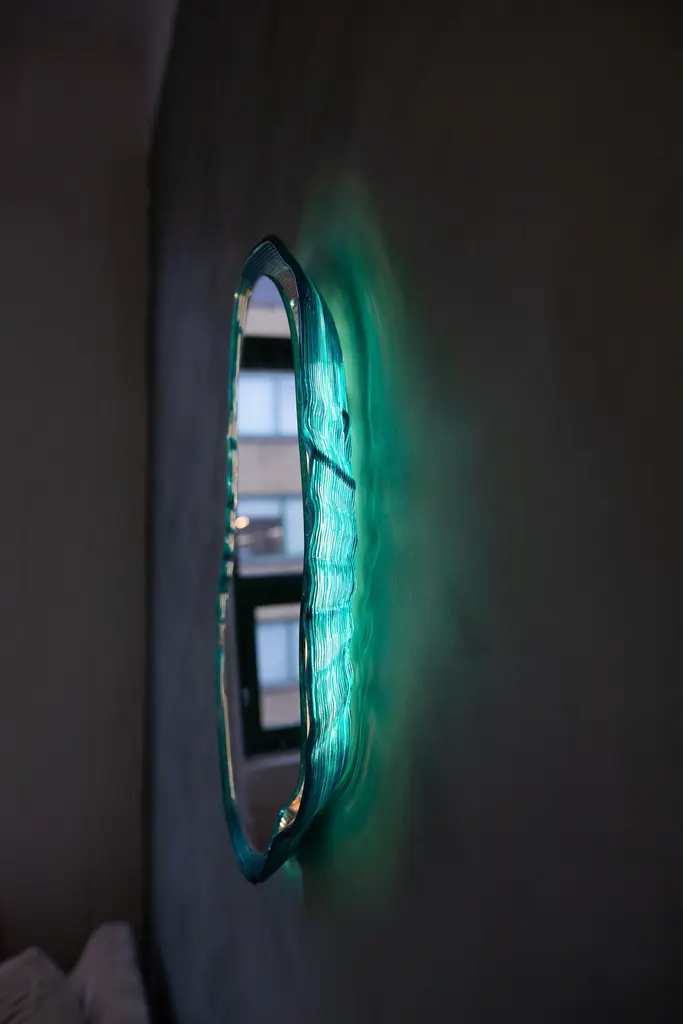 Oyster Mirror by Courtney Kinnare2025Recycled PETG, mirror, wood, LEDApprox. 16x26"This sculptural mirror is locally made with recycled plastic - exploring reclaimed material that would otherwise end up in a landfill (or worse — our oceans!) and reinvisioning it into a portal of light & color. Created in collaboration with Decibel - we've been working on this project for almost a year now and are excited to continue exploring the possibilities within the intersection of art x design x technology x sustainability.Fully customizable by size and color. Lead Time: 6-8 weeks