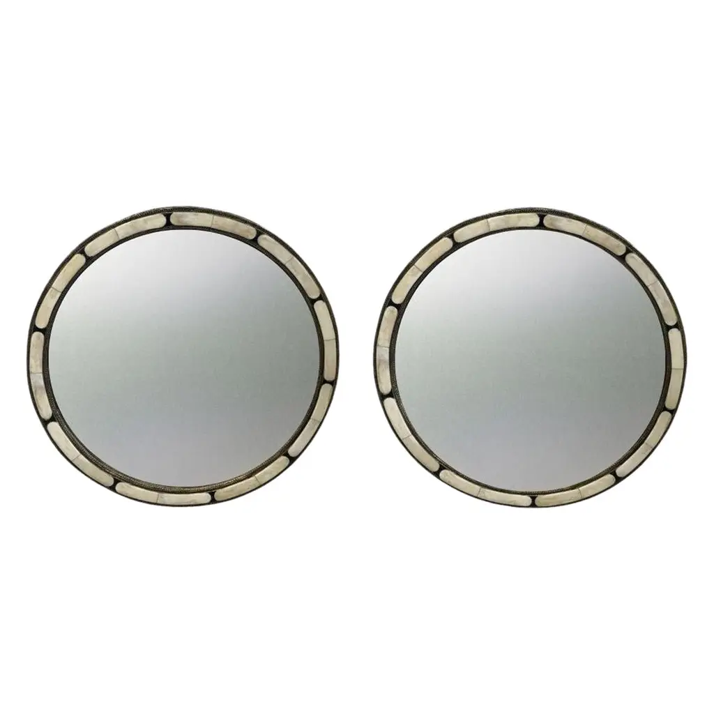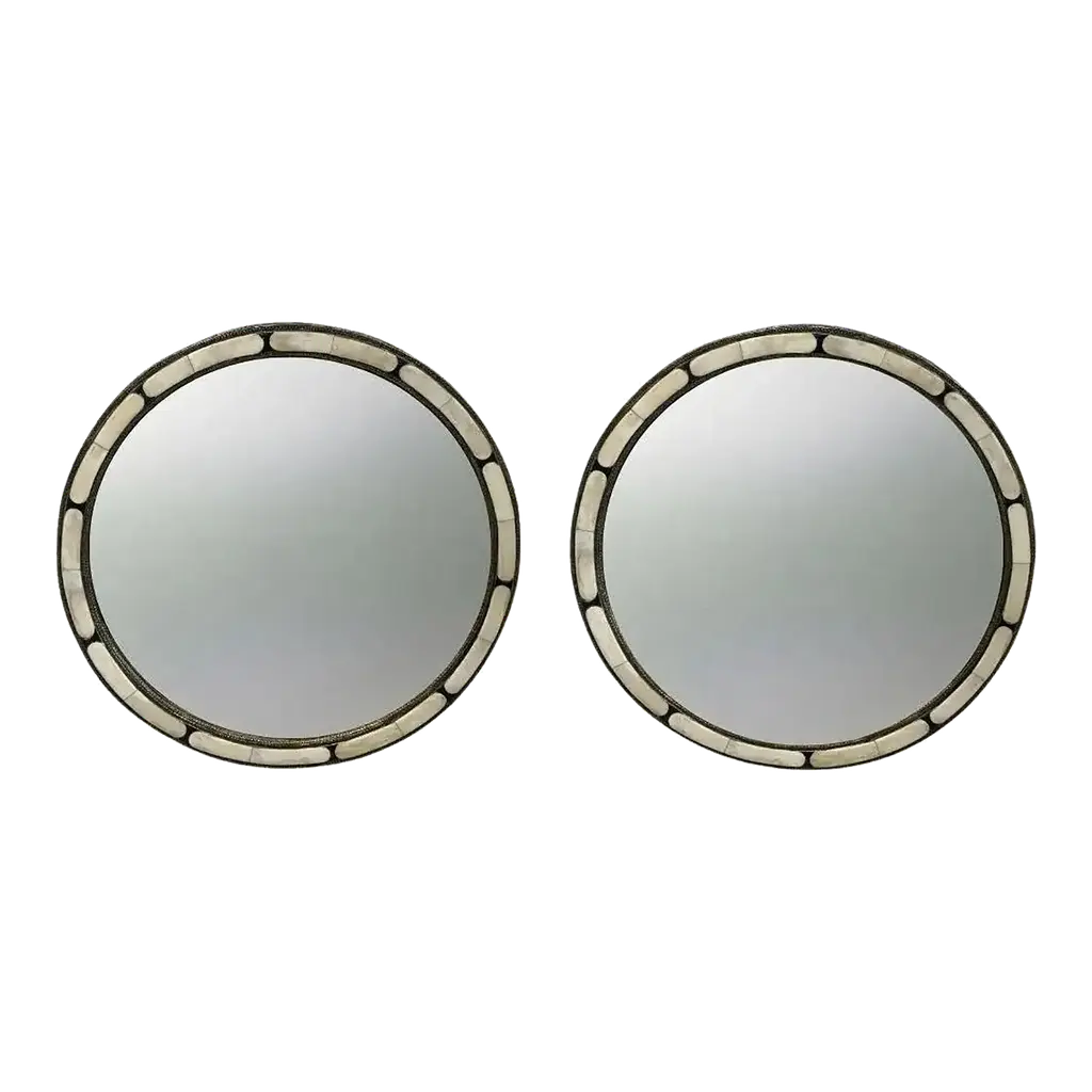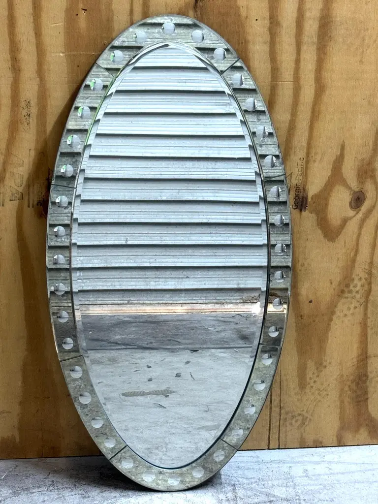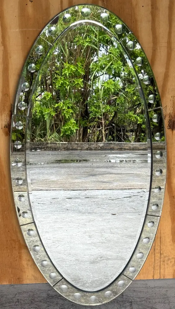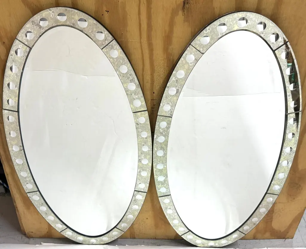 Pair of Jonathan Adler Venetian Style Optic Convex Etched and Beveled Oval Mirrors 40" x 20" We have 4 pairs available at the time of posting and some singles. A sophisticated and glamorous pair of oval wall mirrors by Jonathan Adler, blending modern design with classical Venetian-style elegance. Each mirror features a wide border of antiqued mirrored glass, intricately etched with a repeating optic convex circle motif, creating subtle texture and reflective depth. The pattern evokes the decorative flourishes of traditional Venetian mirrors, reimagined with a sculptural and contemporary sensibility.The ovals are crisply segmented with vertical and horizontal beveled seams, introducing a structured architectural rhythm to the otherwise fluid silhouette. The central clear mirror surface measures 36 inches high by 16 inches wide, framed within an overall dimension of 40 inches high by 20 inches wide.Elegant and versatile, these mirrors are ideal above vanities, flanking a fireplace or console, or adding high-style drama to a dressing room or entryway. A fine example of Jonathan Adler’s ability to reinterpret historical styles through a bold, modern lens.Details:Designer: Jonathan AdlerStyle: Venetian Revival / Modernist / Hollywood RegencyPeriod: 21st CenturyDimensions: 40" H x 20" W overall; 36" H x 16" W central mirrorMaterials: Antiqued mirrored glass, etched optic convex motif, beveled jointsCondition: Excellent, with minor surface wear consistent with age