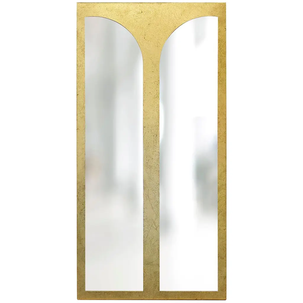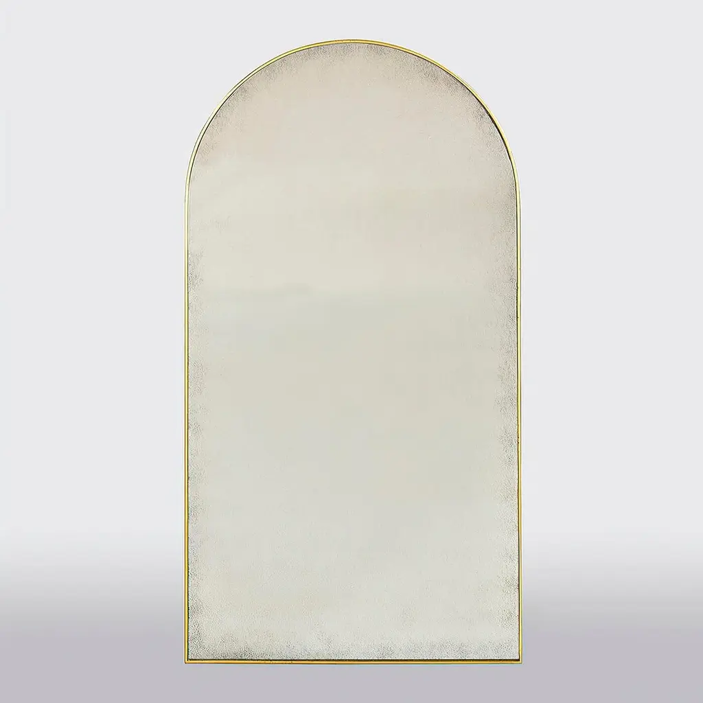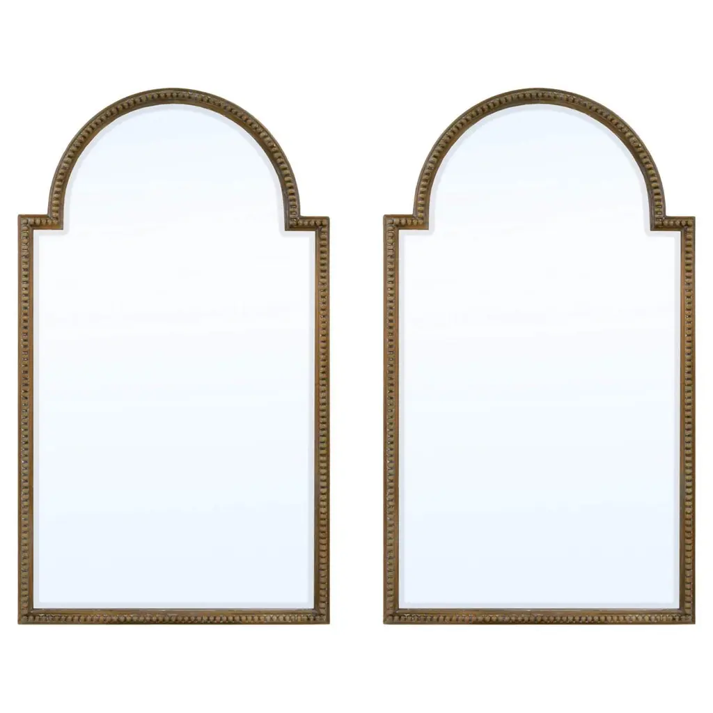 A pair of modern arch top gilt mirrors, with a gilt metal frame and an antiqued mirror plate.Dimensions: 22" W x 1" D x 42" H.