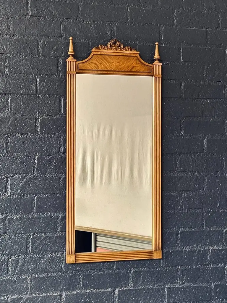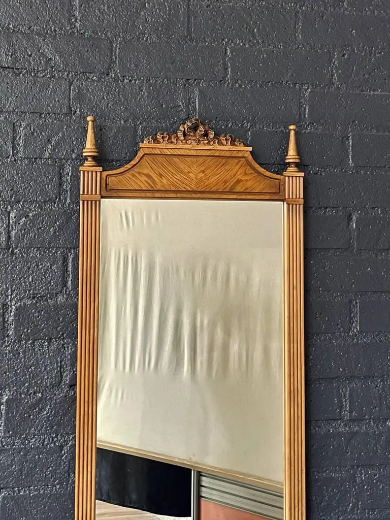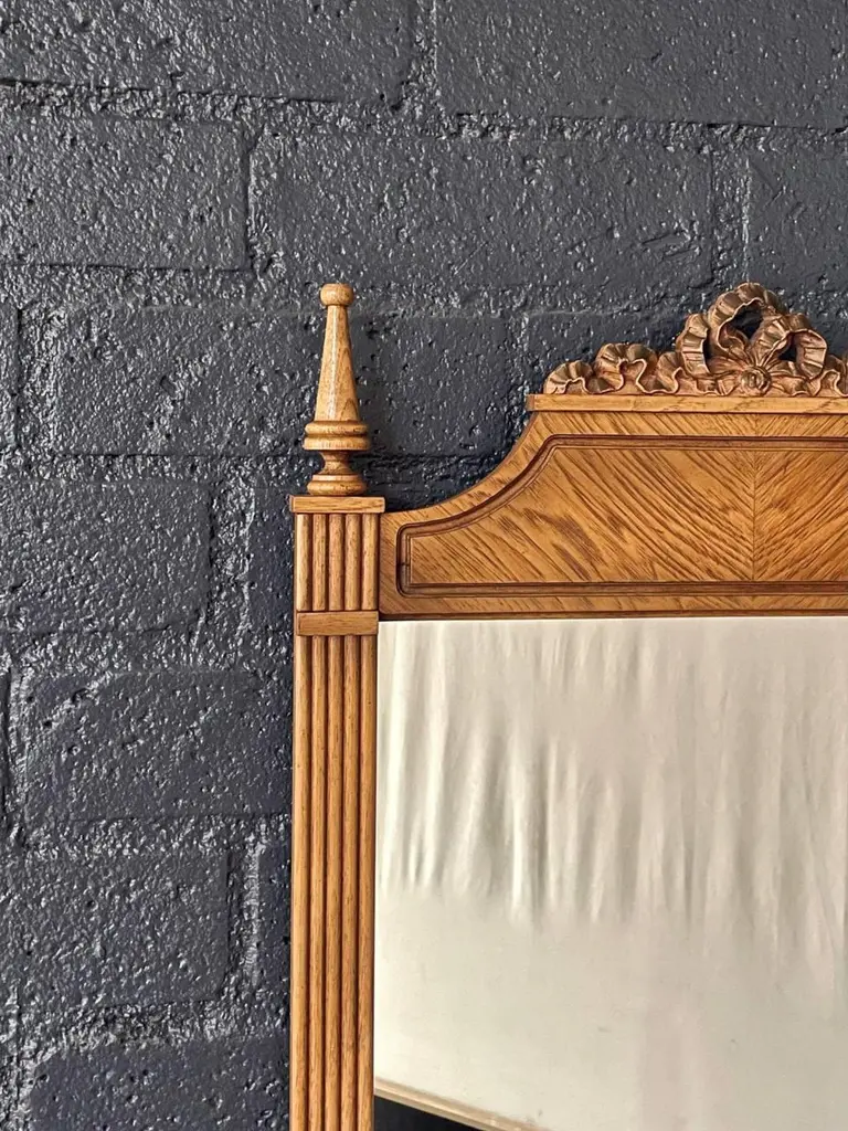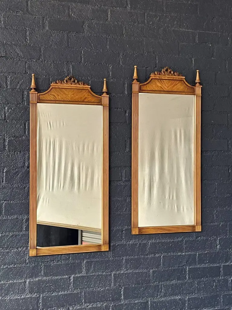 Condition: Original Vintage Condition Materials: Pecan Fruitwood, New Glass MirrorsStyle: French NeoclassicalThis pair of French Neoclassical style mirrors, crafted in the 1950s, reflects the refined elegance of Louis XVI–inspired design with their fluted pilasters, ribbon crest, and delicate finials. Fashioned in warm pecan fruitwood and fitted with new glass, they echo the symmetry and balance that defined 18th-century French interiors, while offering a mid-20th century reinterpretation suited for modern homes of the time. In an era before expansive open spaces were common, mirrors like these played an important role in amplifying light and creating a sense of grandeur in entryways, dining rooms, or salons.Fun Historical Fact: The ribbon-and-bow motif, a favorite of Louis XVI furniture, symbolized unity and fidelity, and was often used on mirrors and decorative arts as a subtle emblem of refinement and domestic virtue.