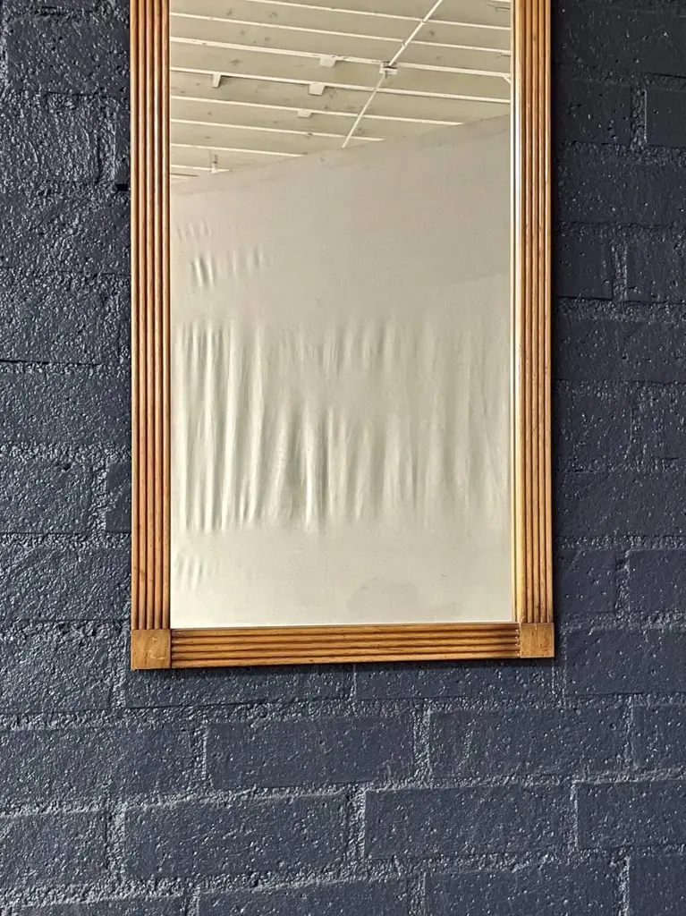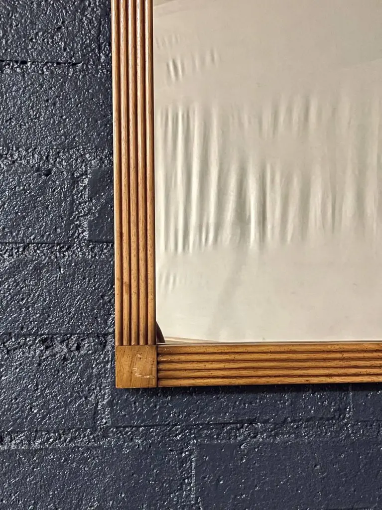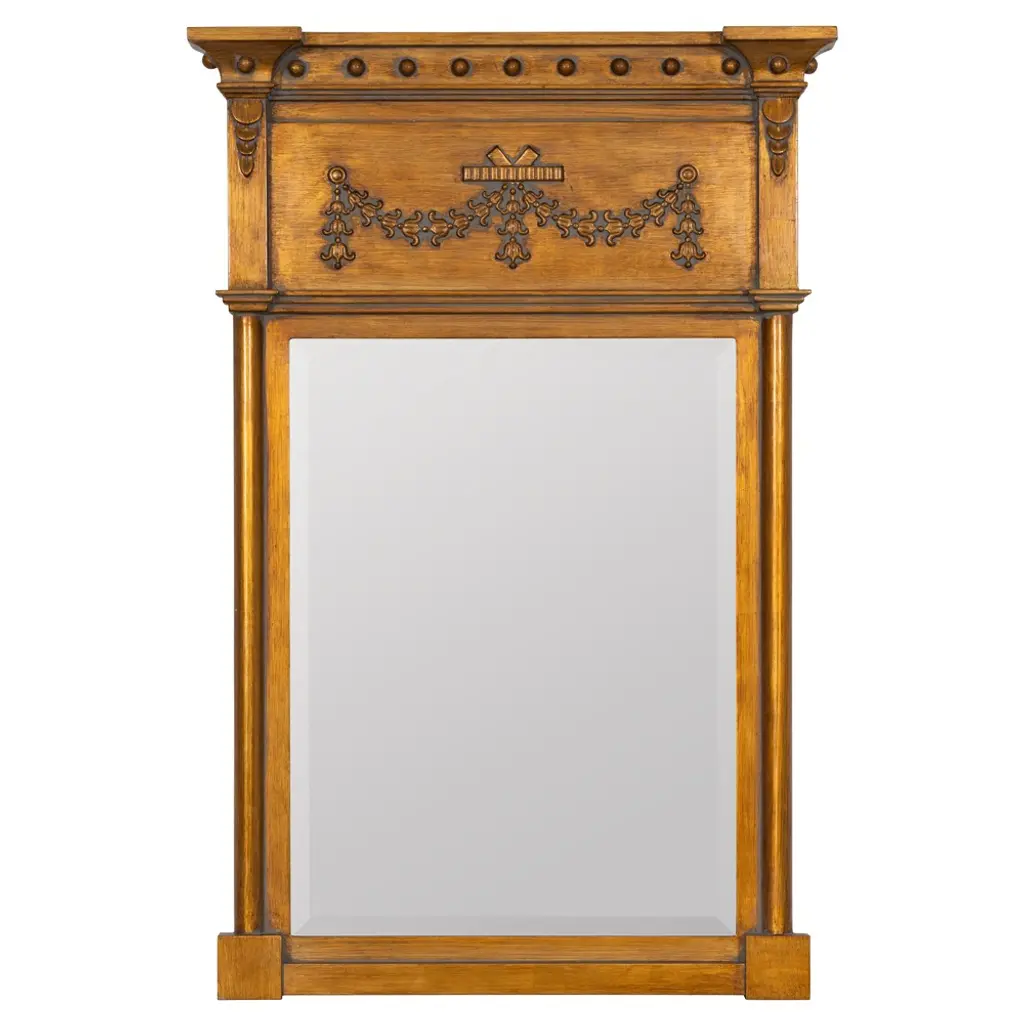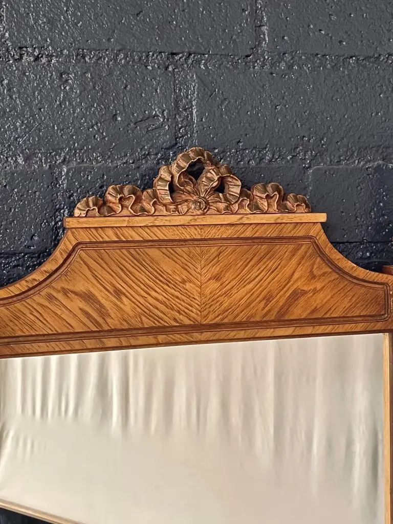 Condition: Original Vintage Condition Materials: Pecan Fruitwood, New Glass MirrorsStyle: French NeoclassicalThis pair of French Neoclassical style mirrors, crafted in the 1950s, reflects the refined elegance of Louis XVI–inspired design with their fluted pilasters, ribbon crest, and delicate finials. Fashioned in warm pecan fruitwood and fitted with new glass, they echo the symmetry and balance that defined 18th-century French interiors, while offering a mid-20th century reinterpretation suited for modern homes of the time. In an era before expansive open spaces were common, mirrors like these played an important role in amplifying light and creating a sense of grandeur in entryways, dining rooms, or salons.Fun Historical Fact: The ribbon-and-bow motif, a favorite of Louis XVI furniture, symbolized unity and fidelity, and was often used on mirrors and decorative arts as a subtle emblem of refinement and domestic virtue.