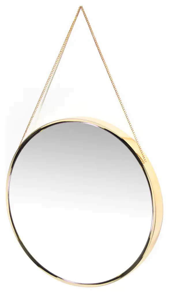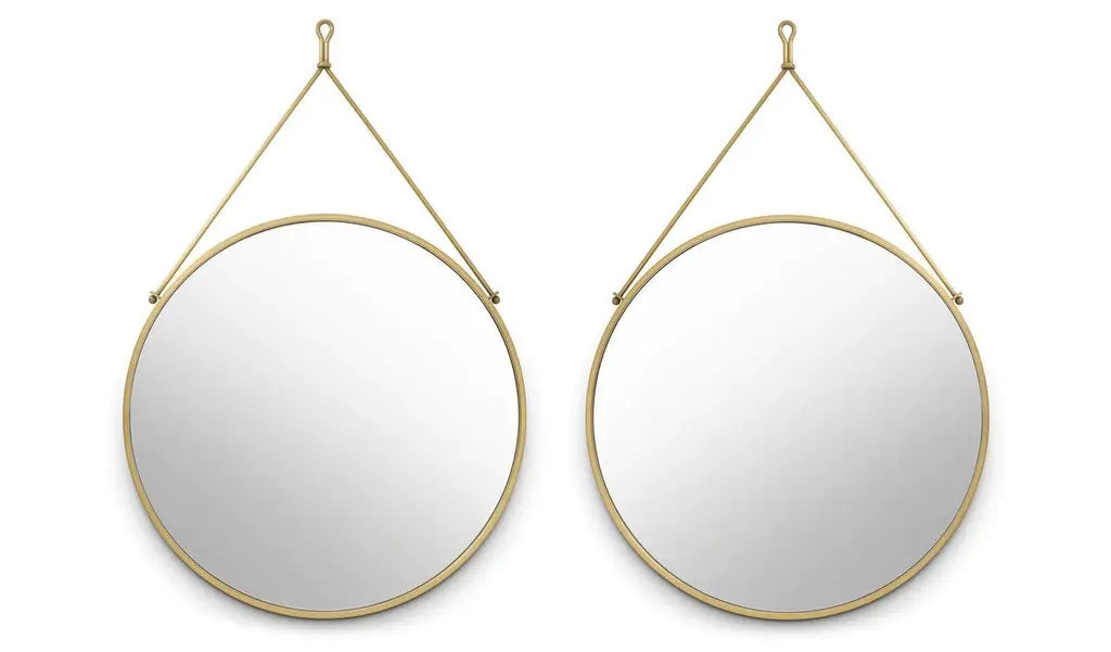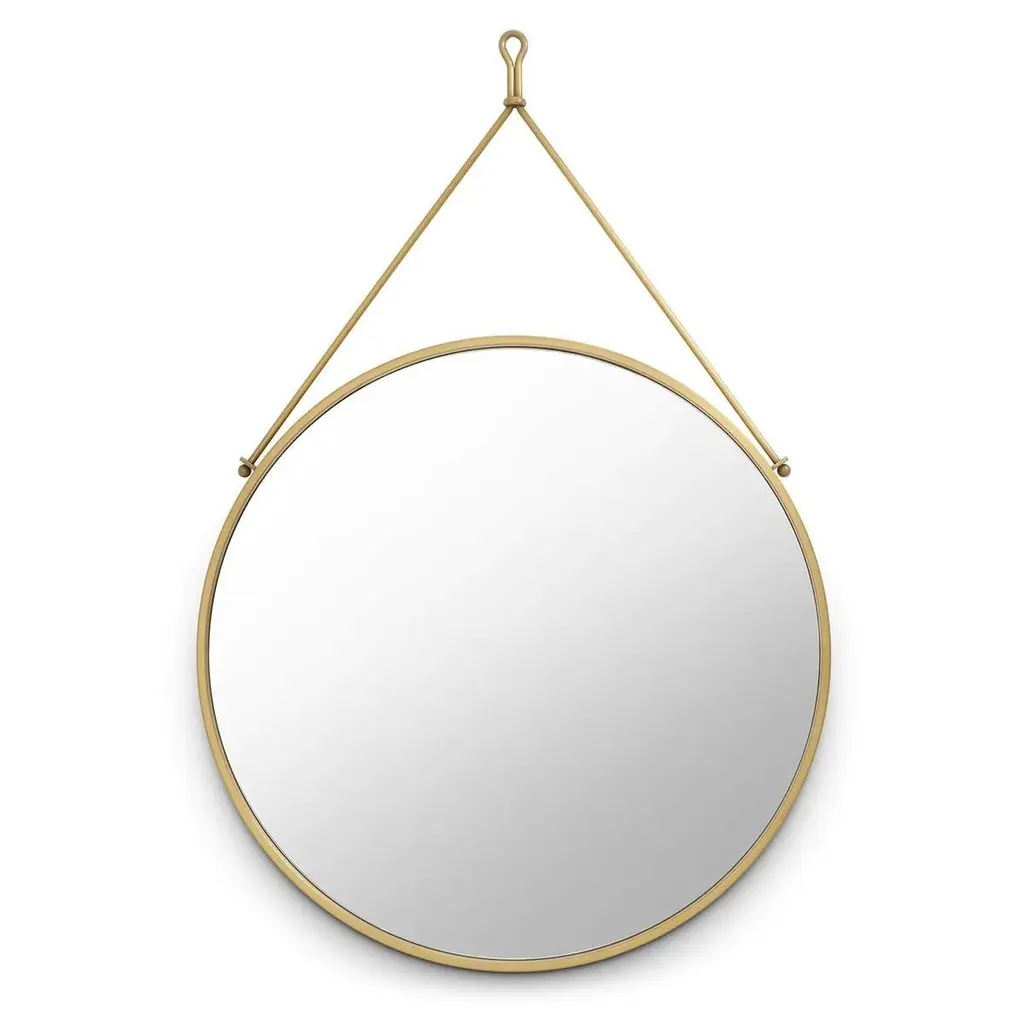 Pair of mirrors, brushed brass finish, vintage style.Simple and elegant, these mirrors display a striking vintage style.With their brushed brass finish, round frame, and slender pendant, they enhance the atmosphere of any room in your home: entryway, living room, or bedroom.Ø 65 D. 3 H. 97 cm