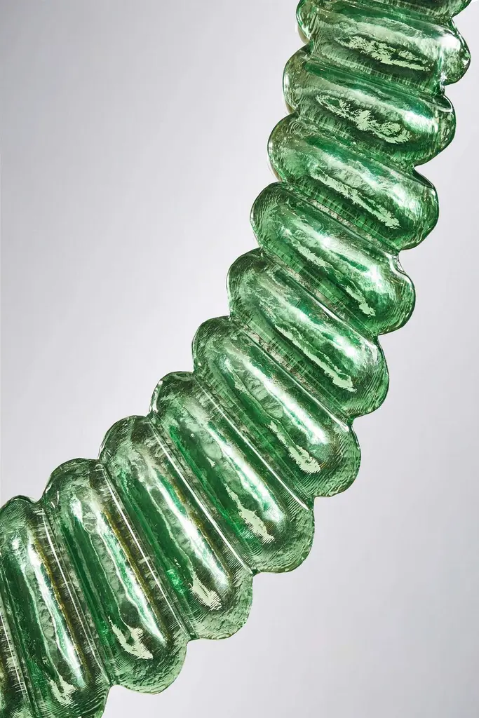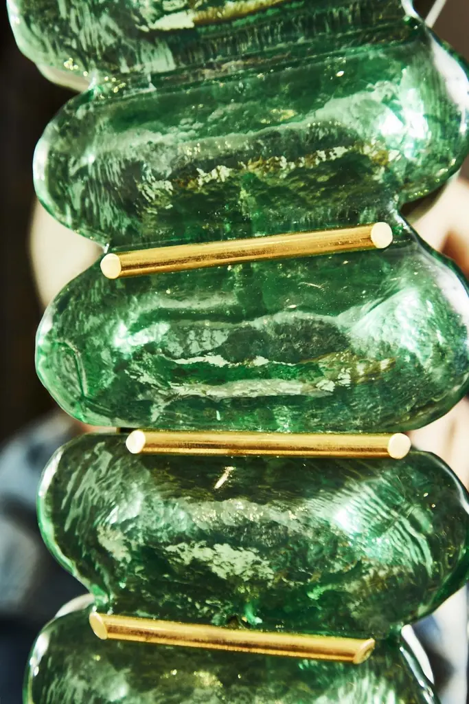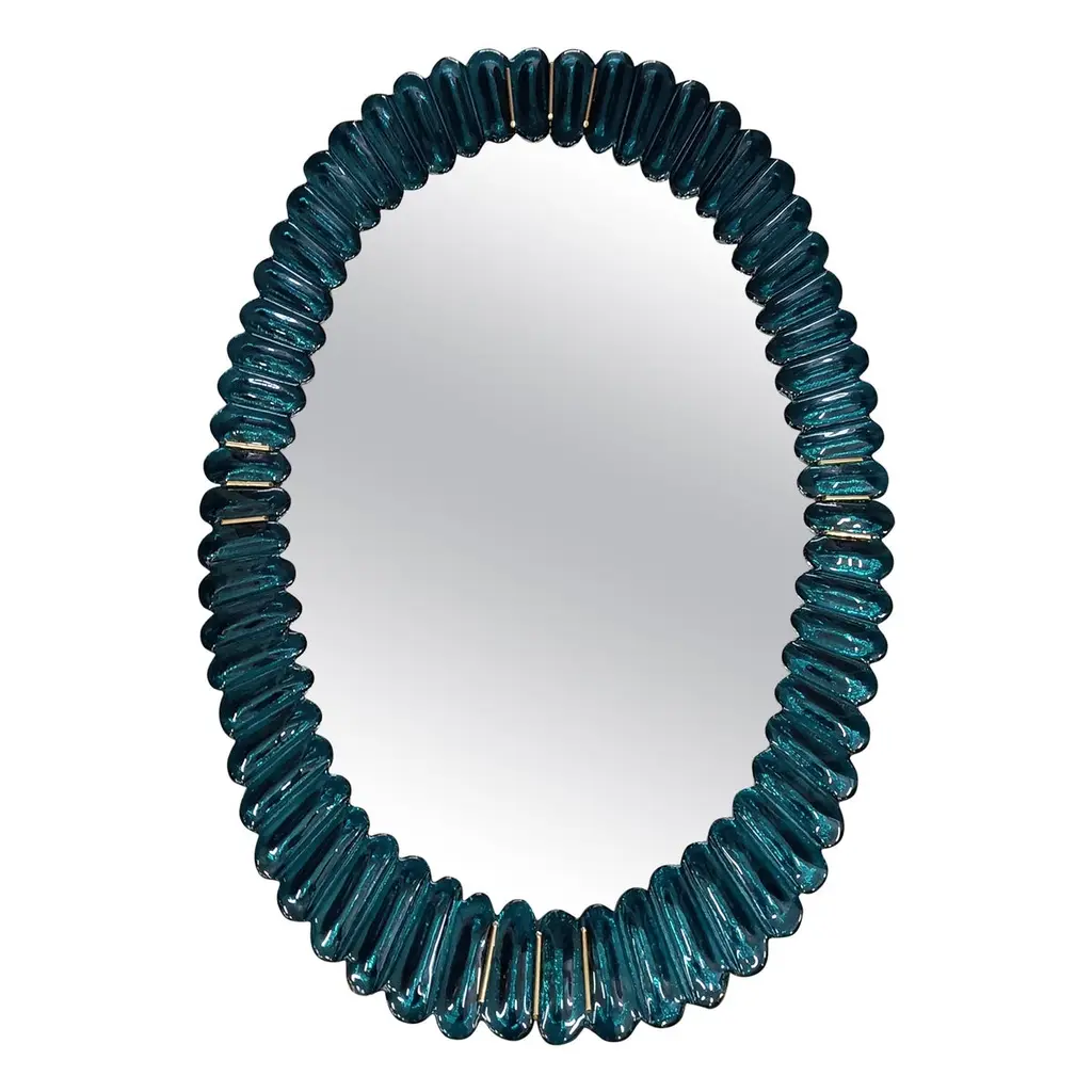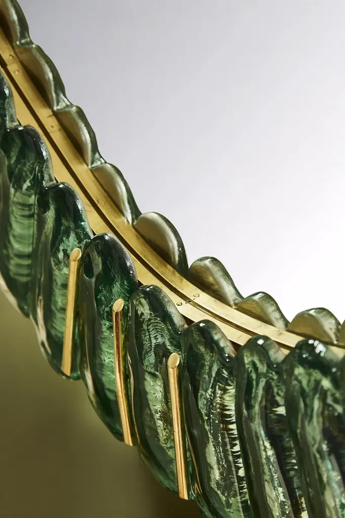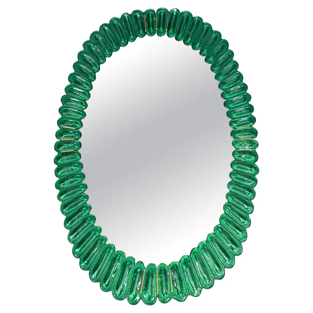 Pair of oval mirrors made of green Murano glass and brass inlays,Italy, 1970s style.